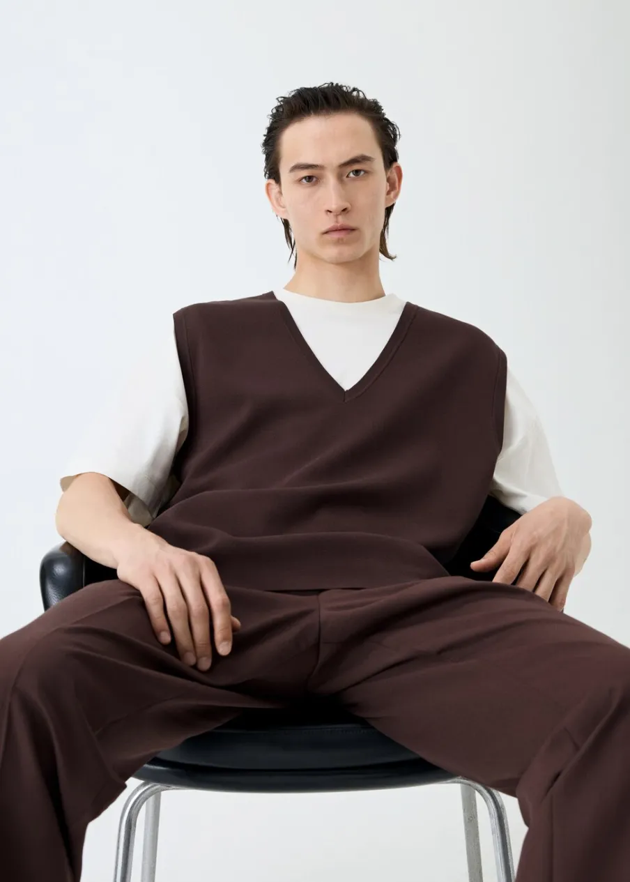 Tkanina z cienkiej dzianiny. Dekolt V. Bez rękawów. Prosty dół. Model ma 185 cm wzrostu i nosi rozmiar M.