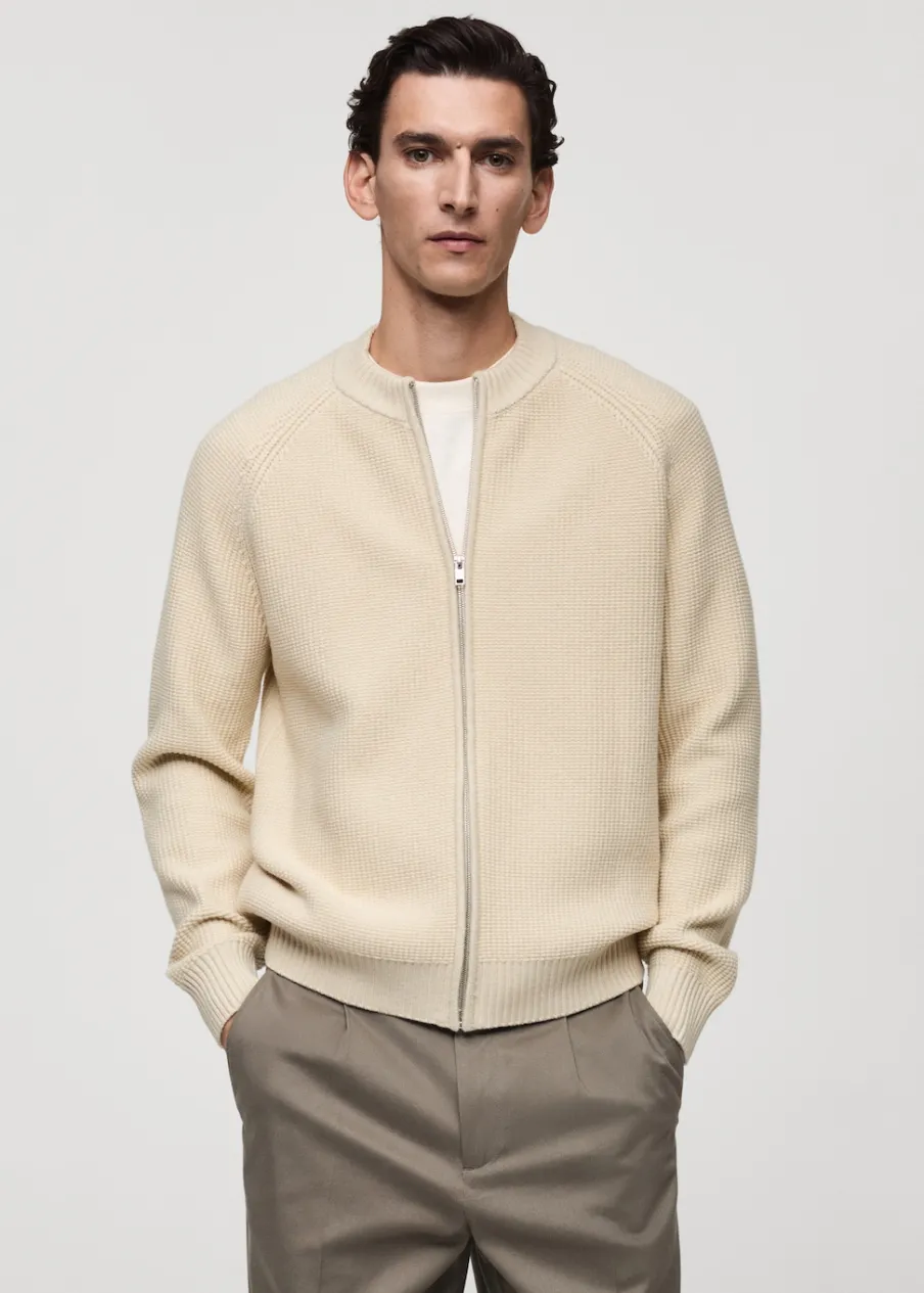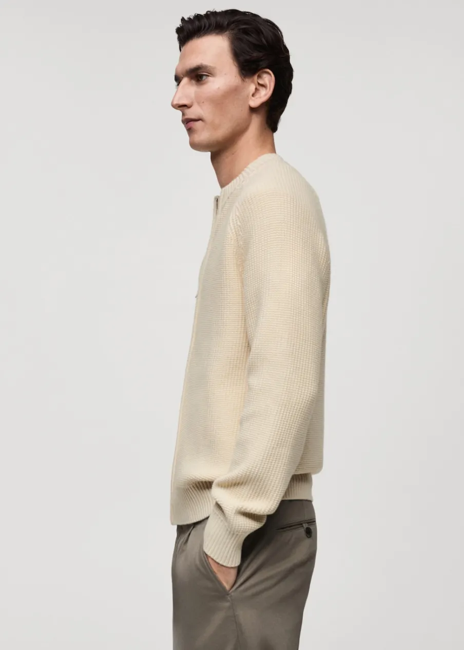 Krój regular. Tkanina z grubej dzianiny. Strukturalna tkanina. Zapięcie na suwak. Ściągaczowe wykończenia. Model ma 185 cm wzrostu i nosi rozmiar M.