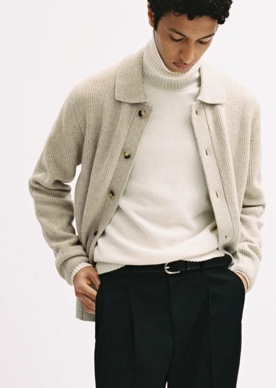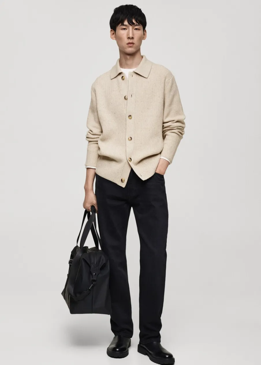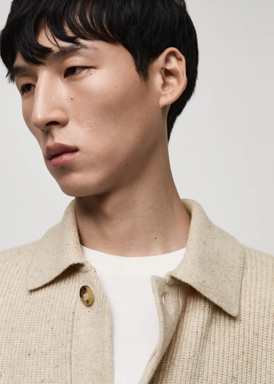 Dzianina średniej grubości. Prążkowana tekstura. Zapięcie na guziki. Kołnierzyk polo. Model ma 185 cm wzrostu i nosi rozmiar M.