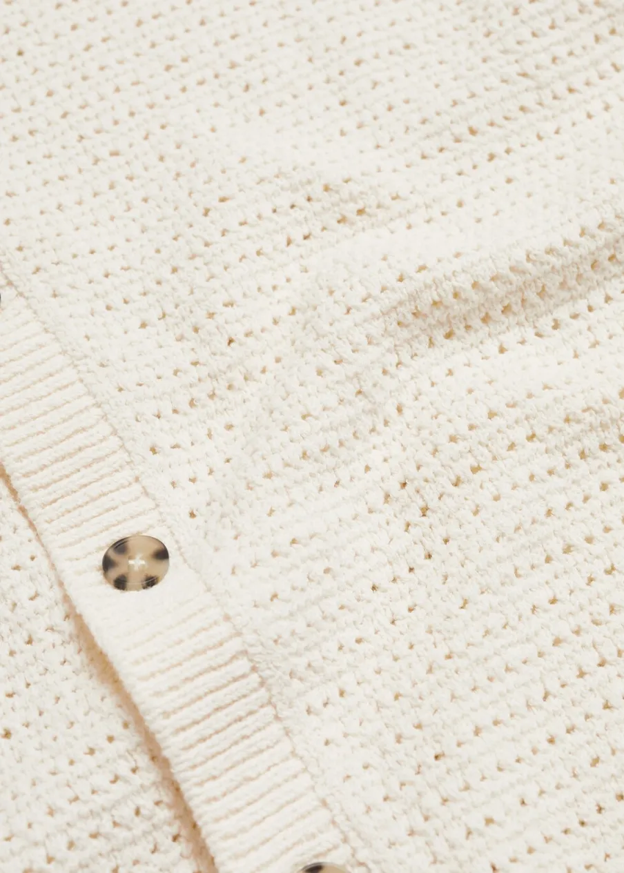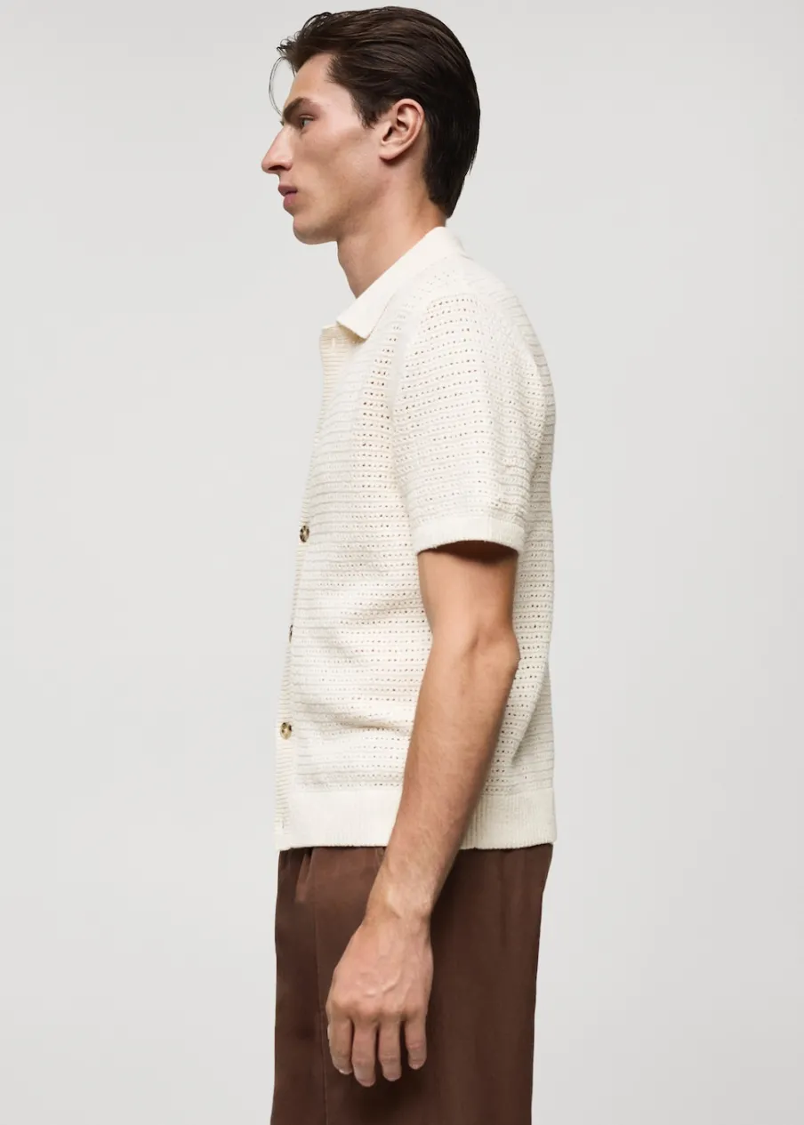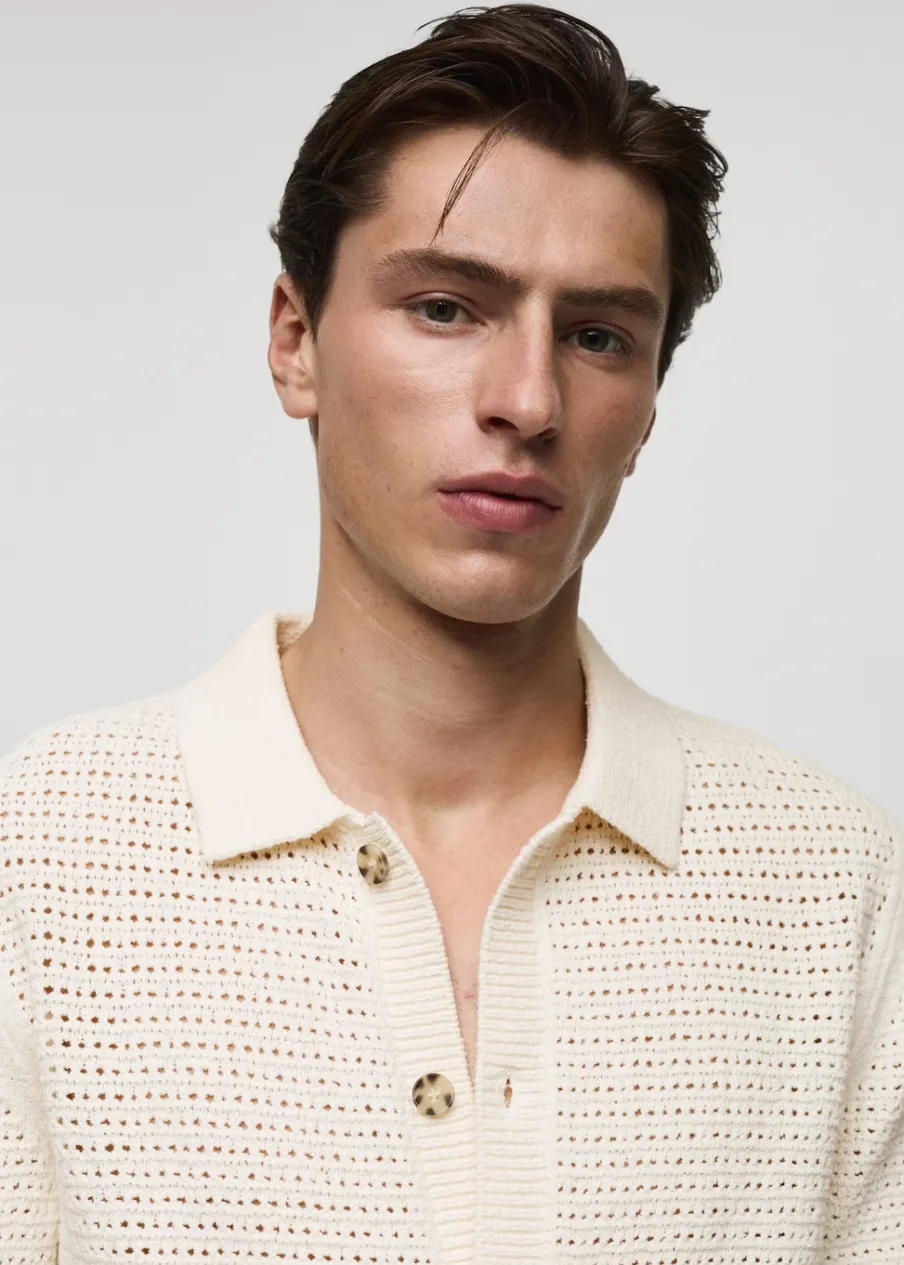 Tkanina mieszanka bawełny. Ażurowy model. Kontrastowy kołnierzyk polo. Prosty dół. Model ma 185 cm wzrostu i nosi rozmiar M. Szydełkowa tkanina. Zapięcie na guziki z przodu. Prążkowane wykończenie na dekolcie, rękawach i u dołu. Krótki rękaw z prążkowaniem.