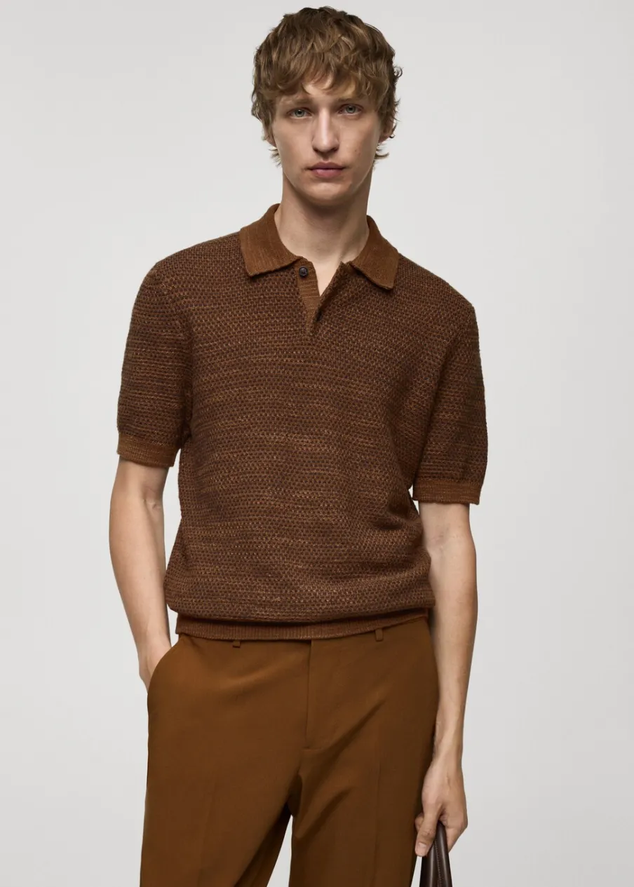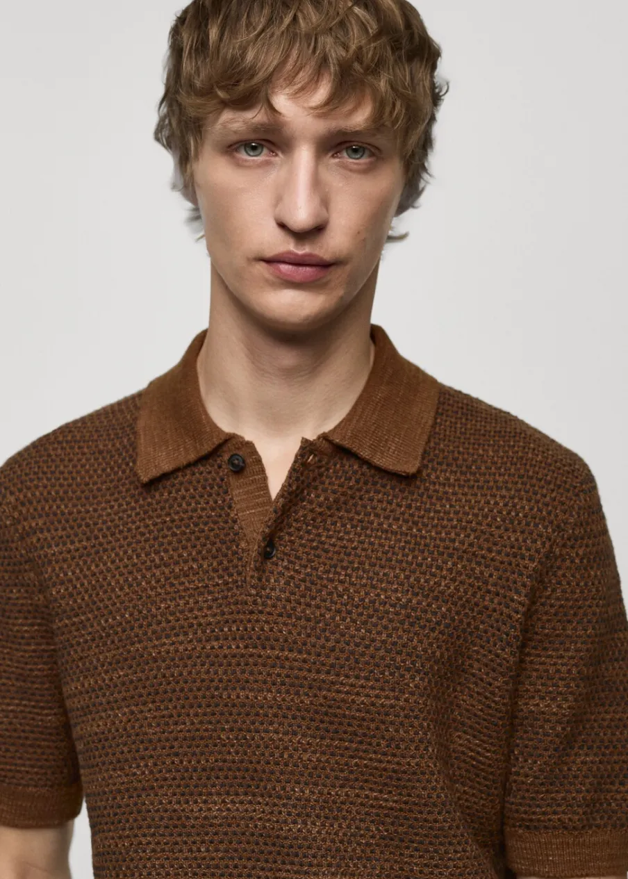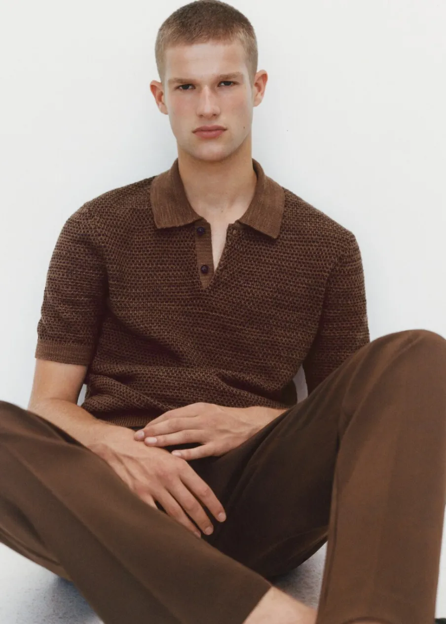 Krój regular. Cienka dzianina bawełniana. Dwukolorowa tkanina z drobną teksturą. Kontrastowy kołnierzyk polo. Zapięcie na guziki. Prosty dół. Model ma 190 cm wzrostu i nosi rozmiar M. Krótki rękaw z prążkowaniem.