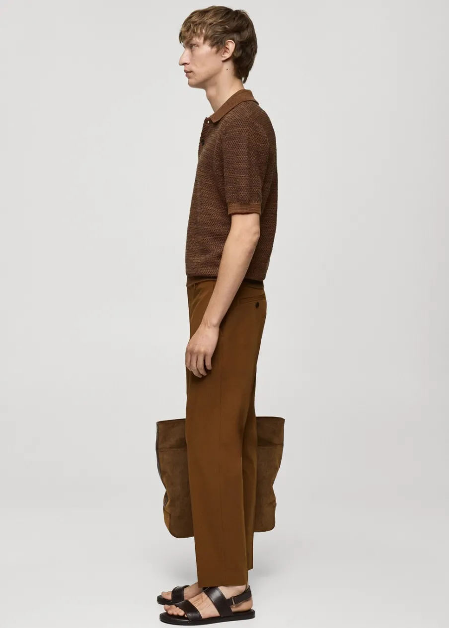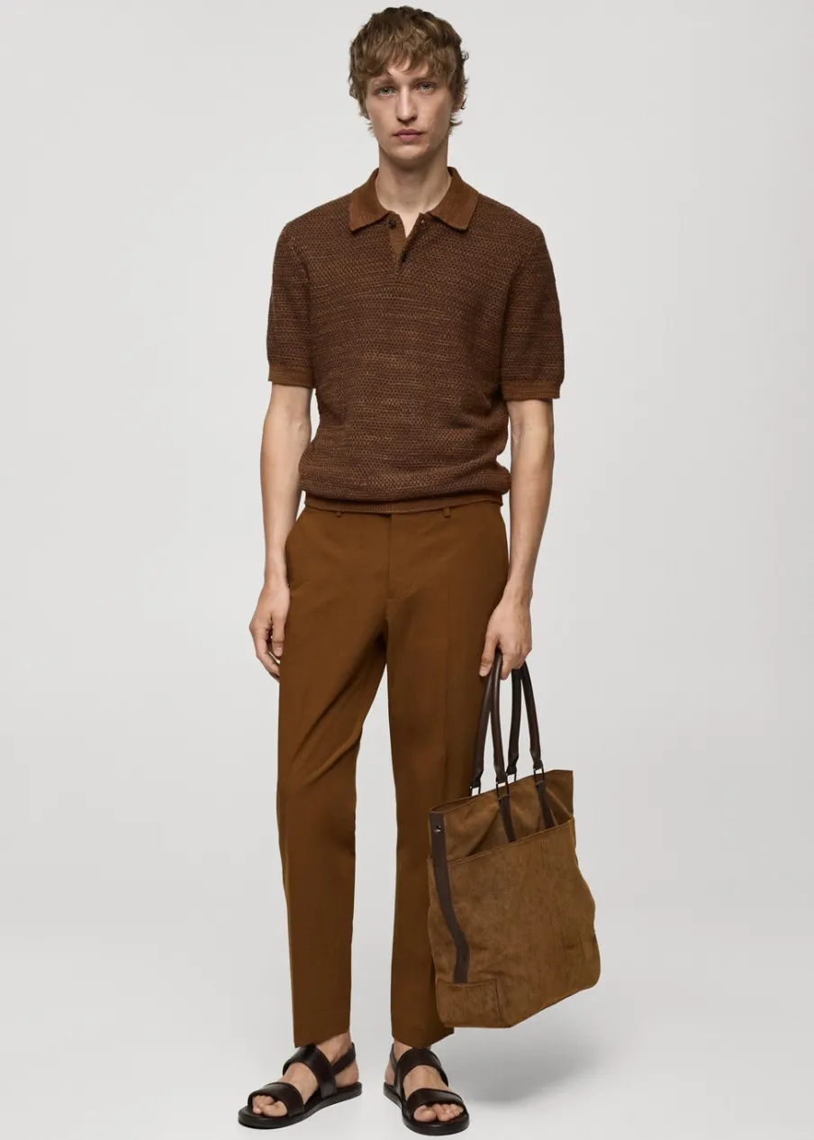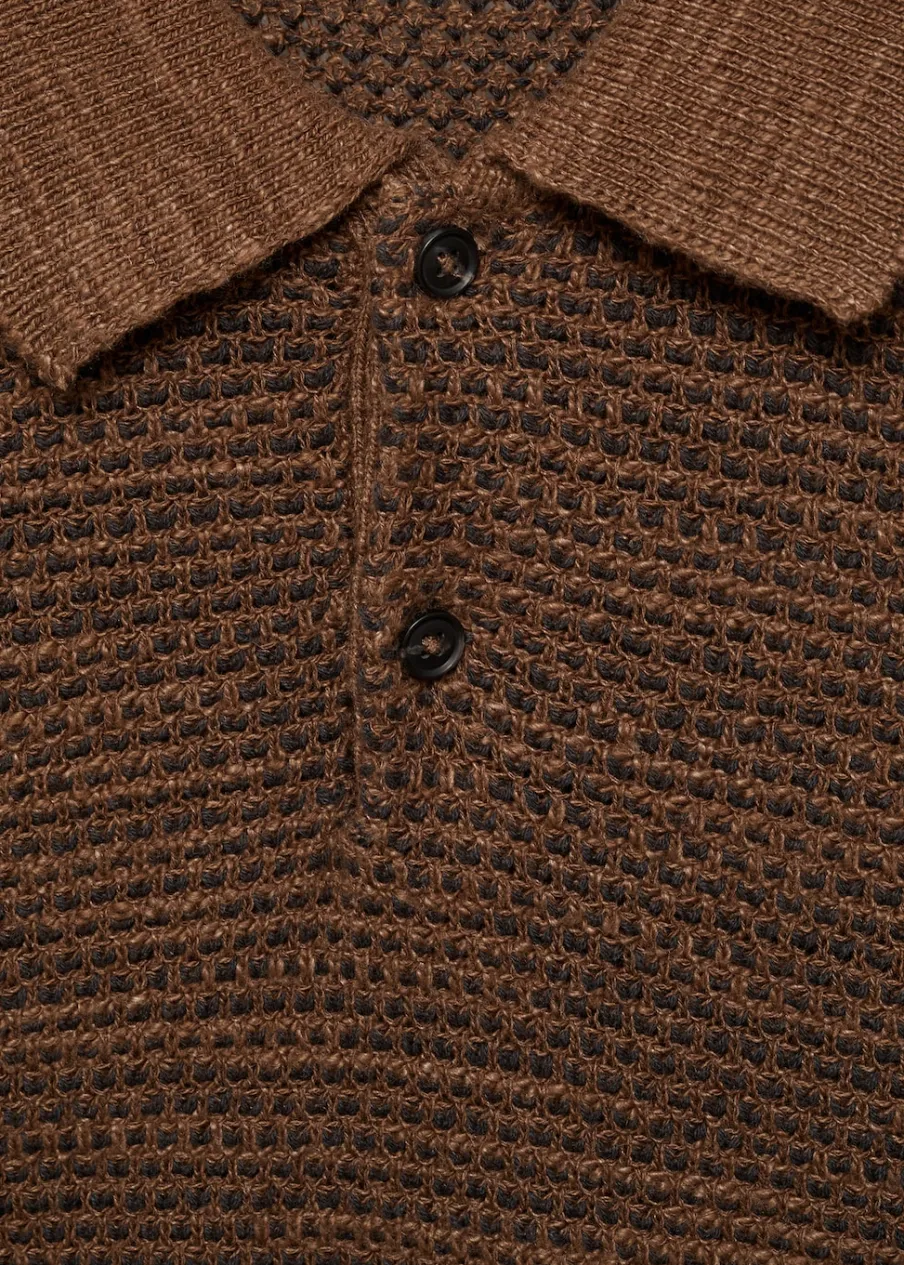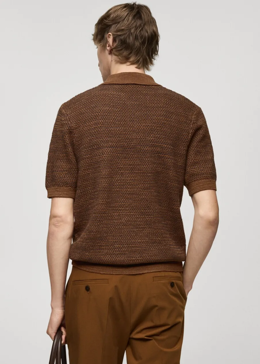 Krój regular. Cienka dzianina bawełniana. Dwukolorowa tkanina z drobną teksturą. Kontrastowy kołnierzyk polo. Zapięcie na guziki. Prosty dół. Model ma 190 cm wzrostu i nosi rozmiar M. Krótki rękaw z prążkowaniem.