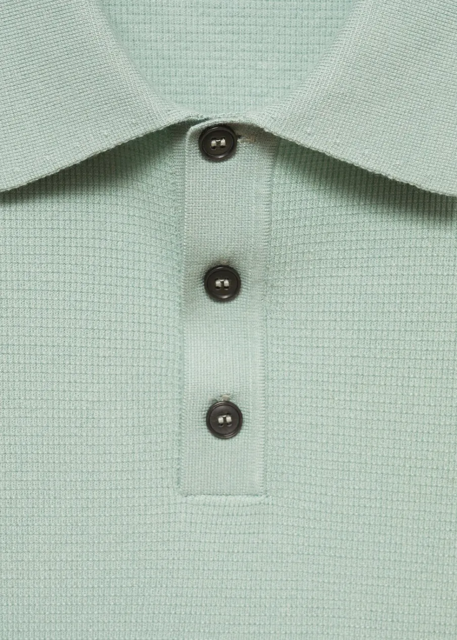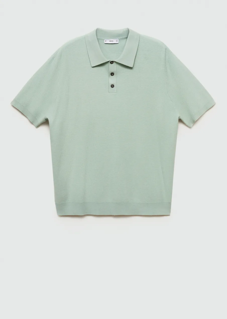Delikatna dzianina z mikrostrukturą. Kołnierzyk polo z zapięciem na guziki. Prosty dół z prążkowanym wykończeniem. Model ma 190 cm wzrostu i nosi rozmiar M. Krótki rękaw z prążkowaniem.