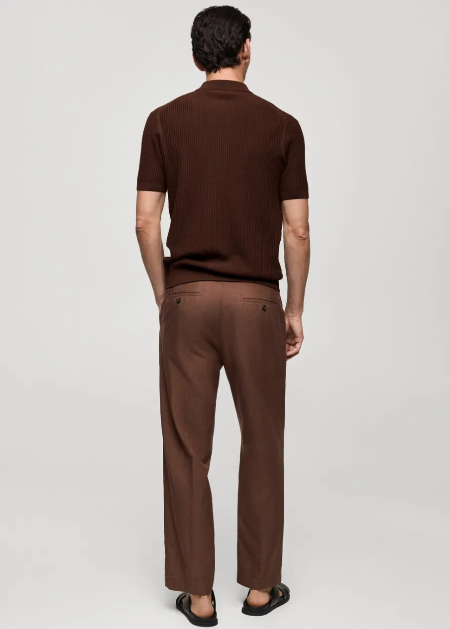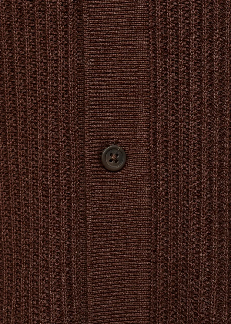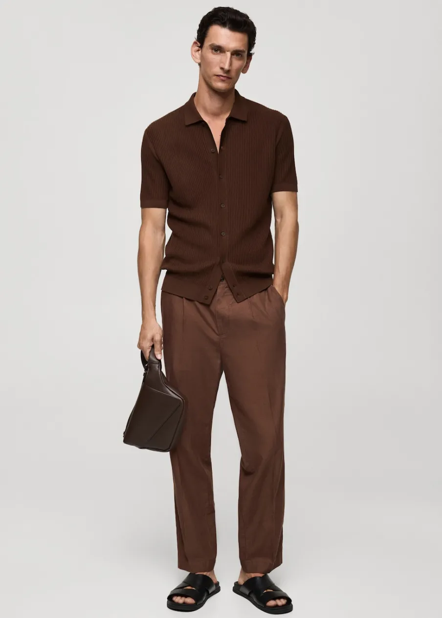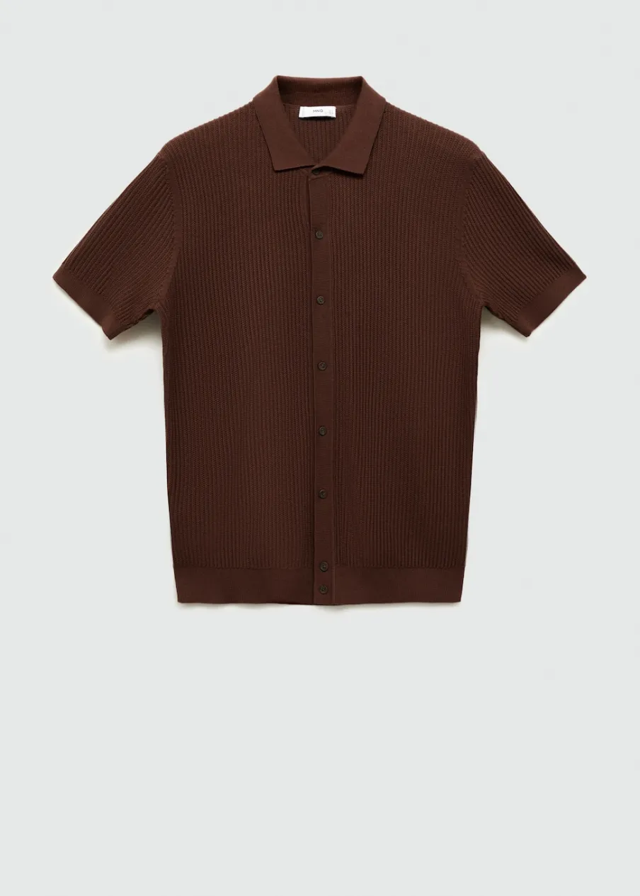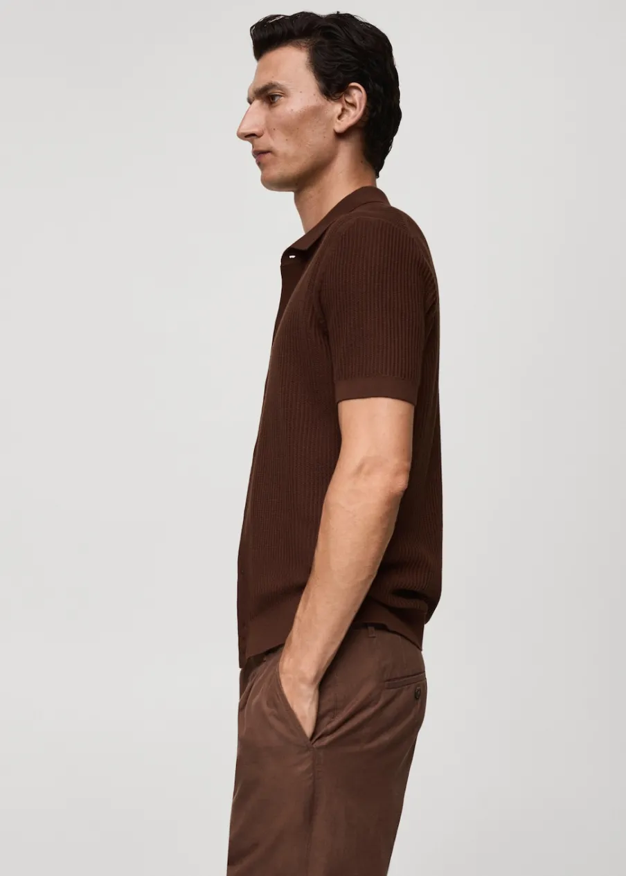 Tkanina z cienkiej dzianiny. Krój regular. Tekstura ze splotami tworzącymi prążki. Koszulowy kołnierz. Krótki rękaw. Prosty dół. Model ma 190 cm wzrostu i nosi rozmiar M. Zapięcie na guziki z przodu. Zapięcie z przodu. Model standardowy. Model prosty. Kołnierzyk polo. Tkanina z 100% bawełny.