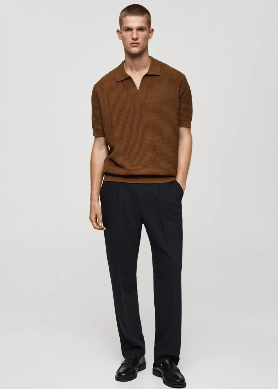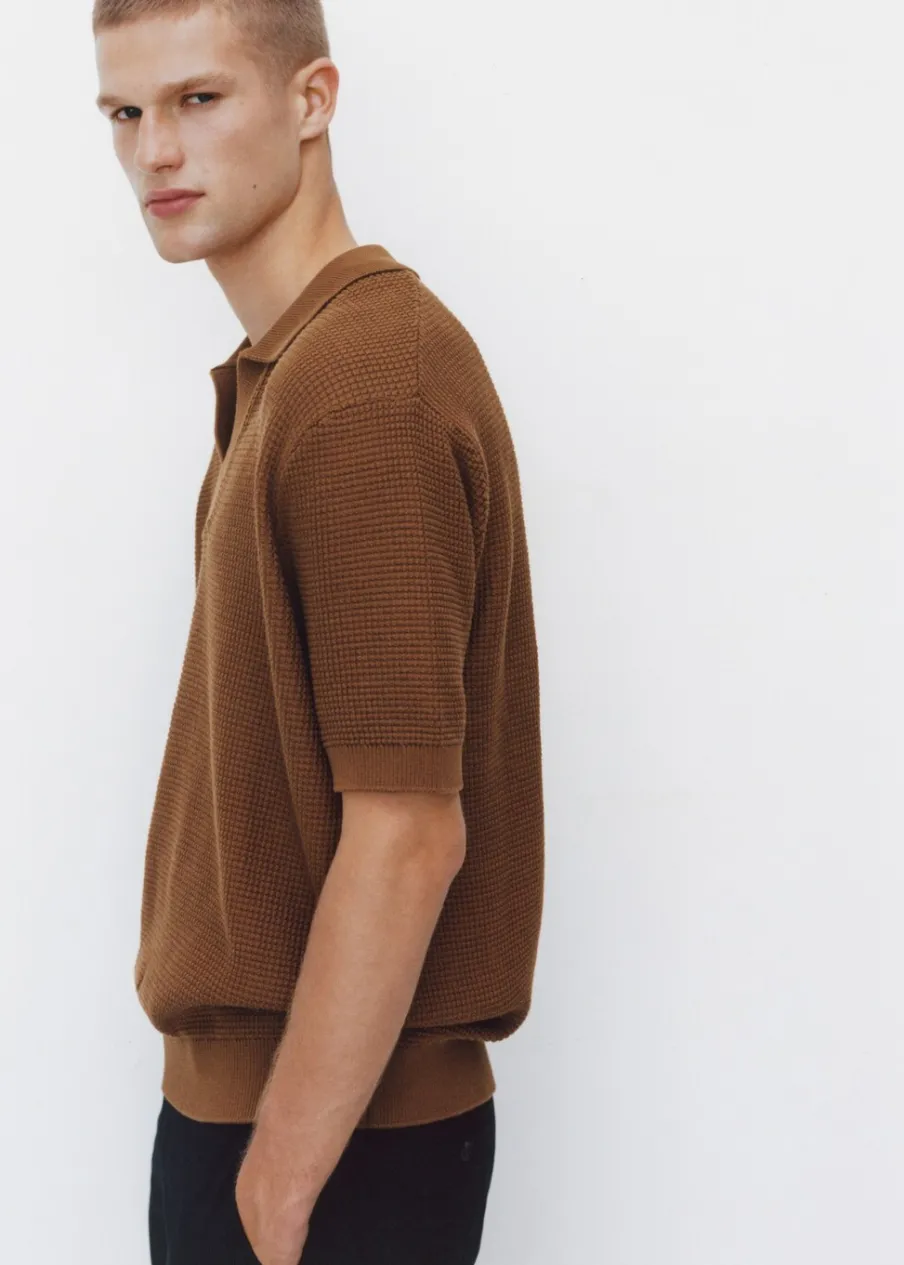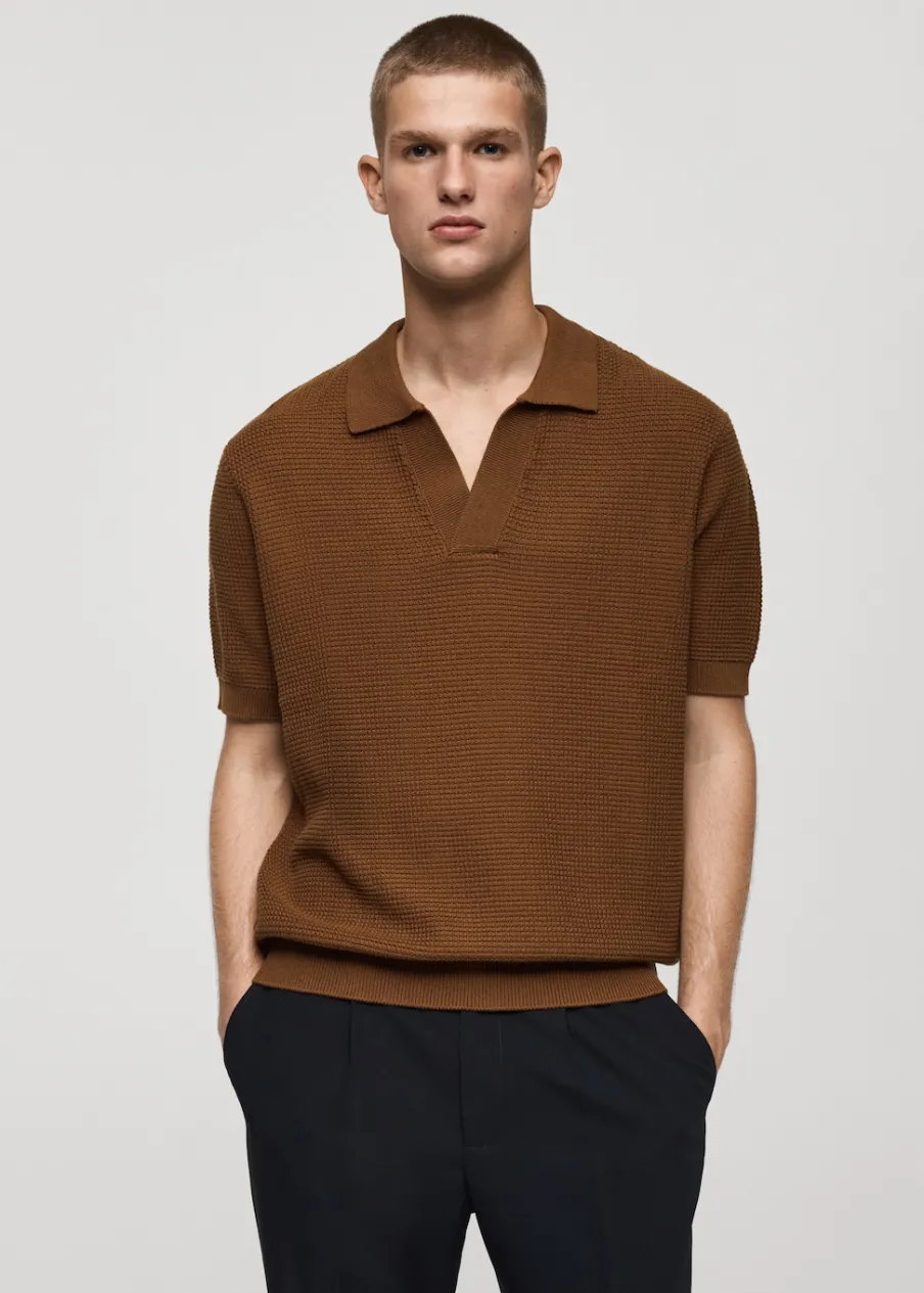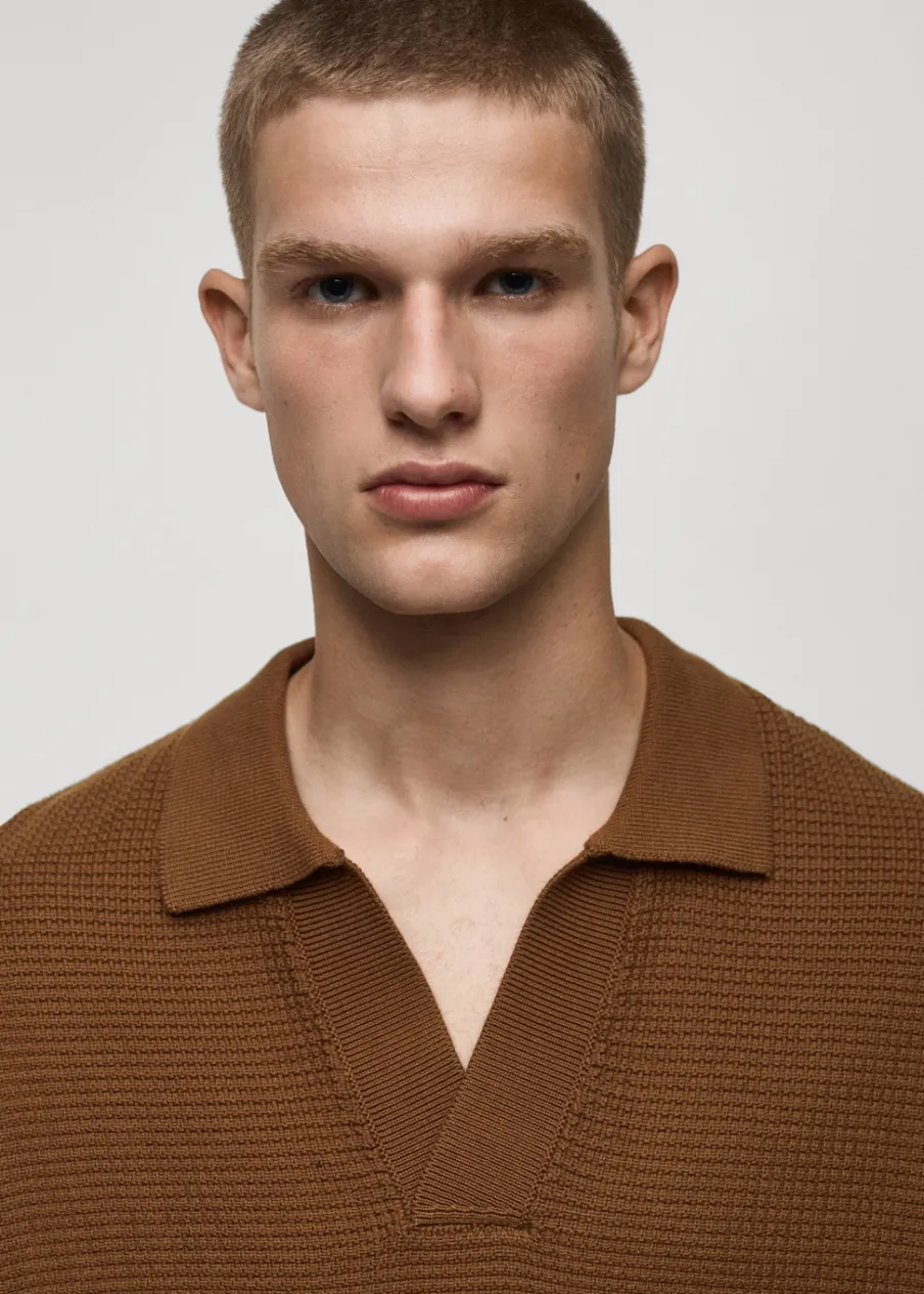 Model prosty. Wykończenie z mikroteksturą. Kołnierzyk polo z dekoltem w serek bez zapięcia. Krótki rękaw. Prosty dół. Model ma 190 cm wzrostu i nosi rozmiar M. Dzianina o średniej grubości. Prążkowane wykończenie na dekolcie, rękawach i u dołu. Tkanina z 100% bawełny.