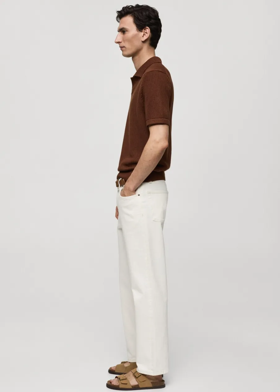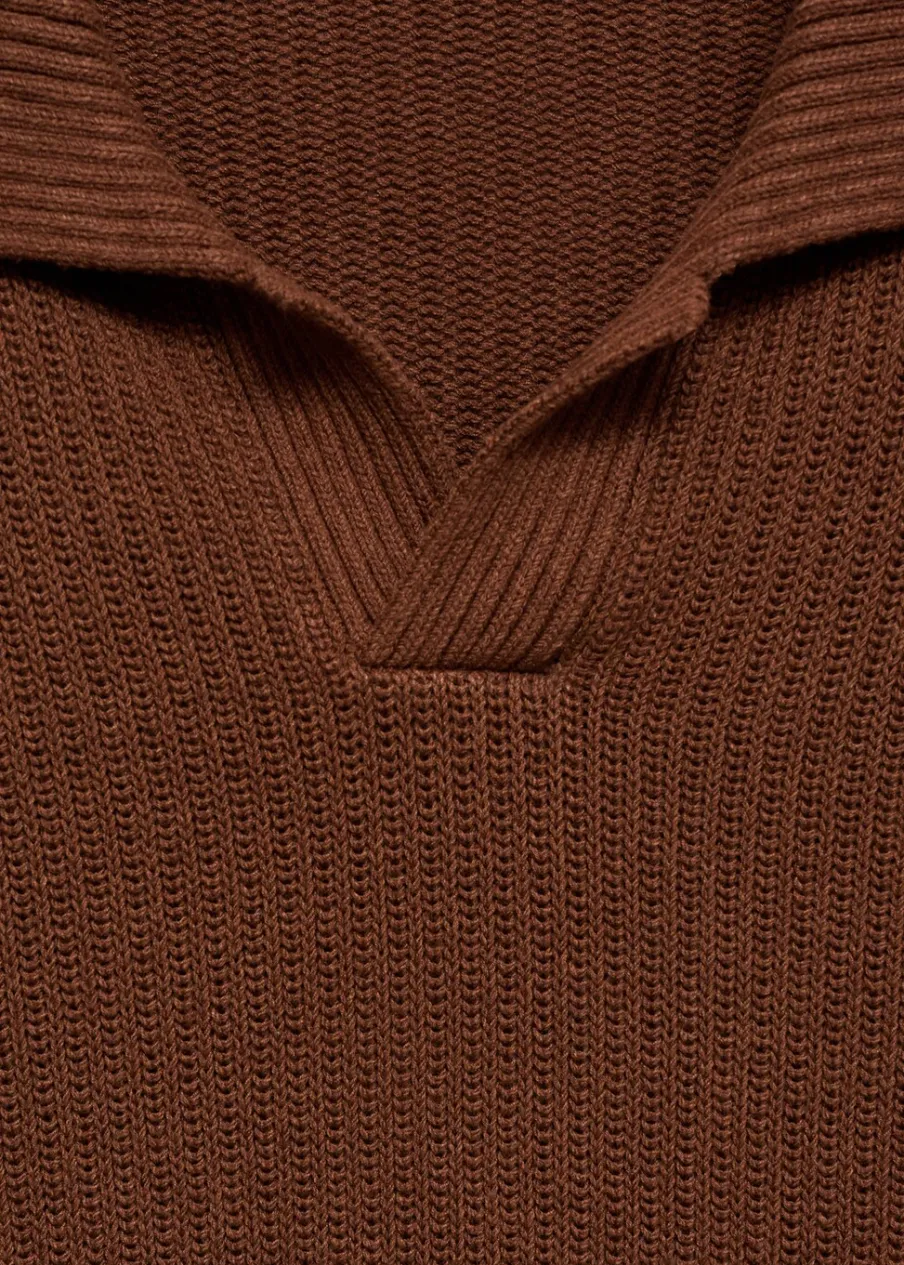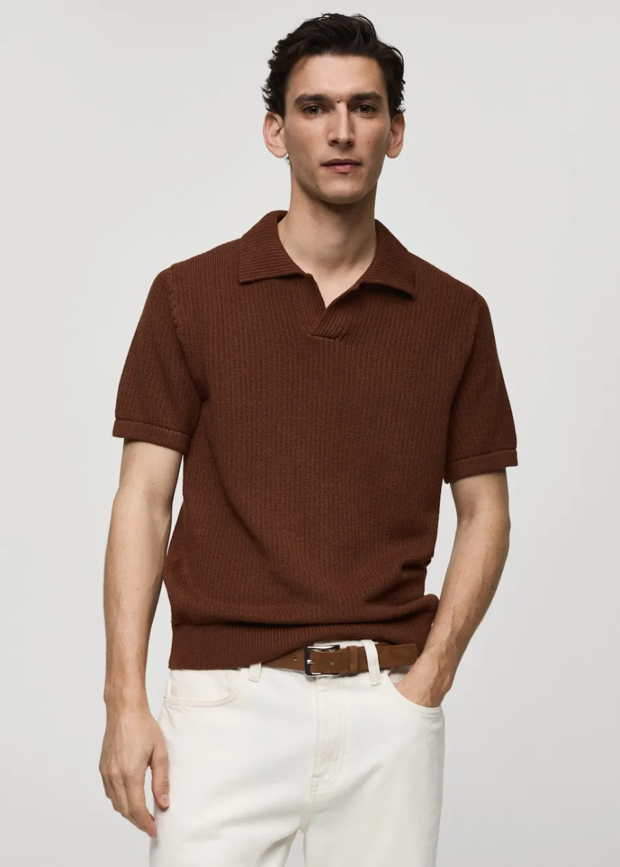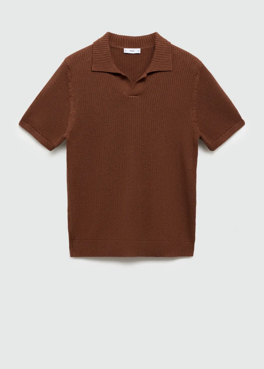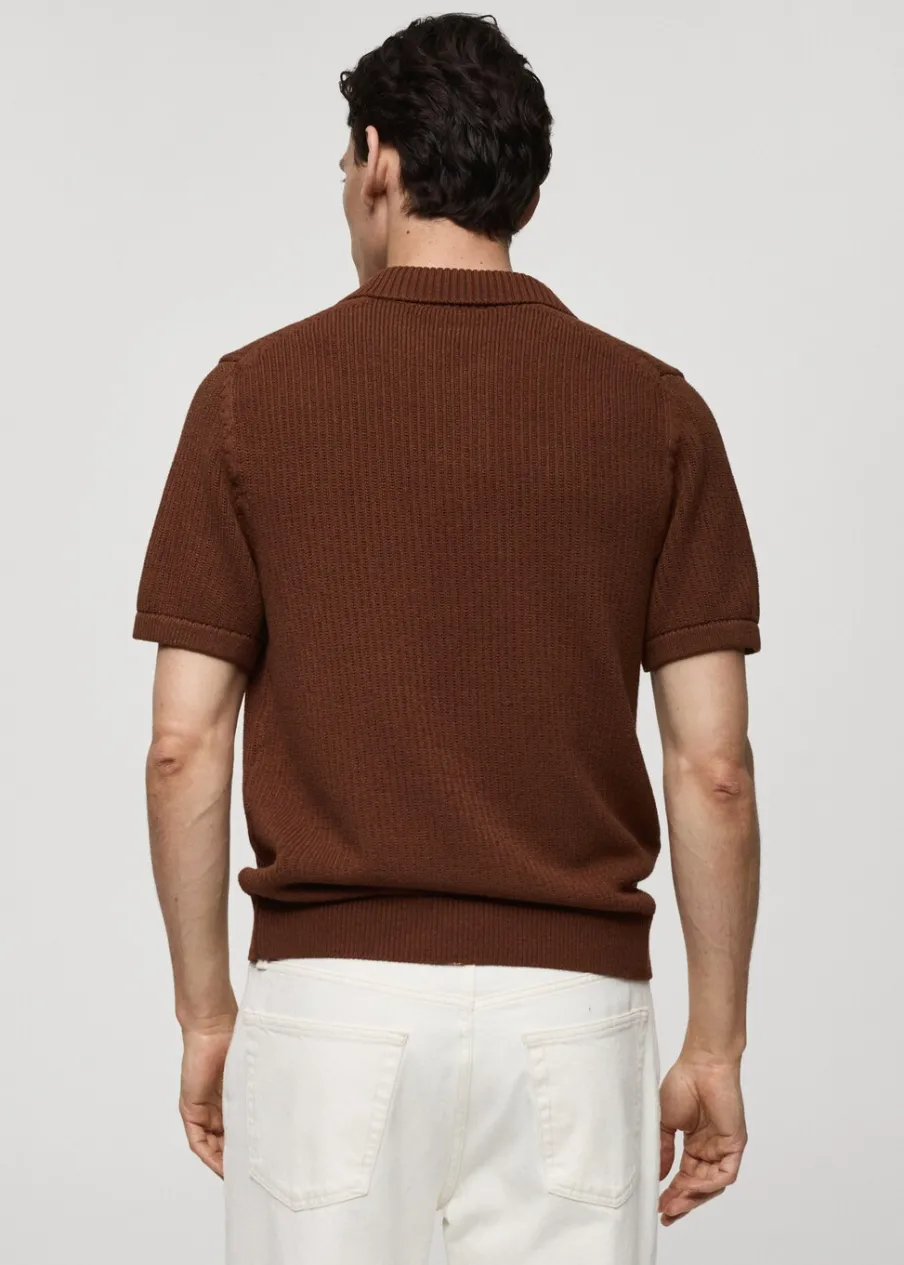 Tkanina mieszanka bawełny. Tkanina z grubej dzianiny. Kołnierzyk polo z dekoltem w serek bez zapięcia. Krótki rękaw. Elastyczna gumka u dołu. Model ma 185 cm wzrostu i nosi rozmiar M.
