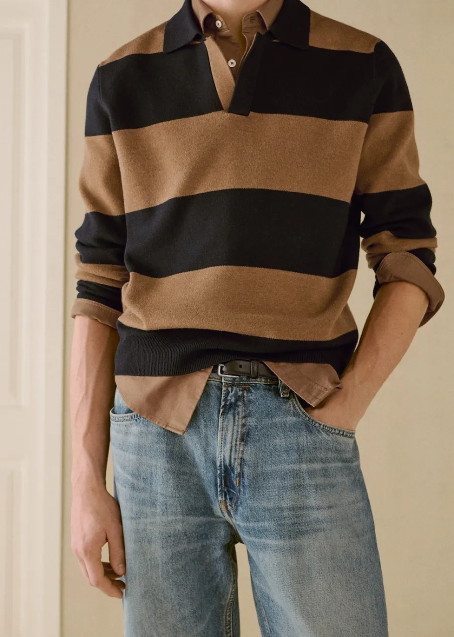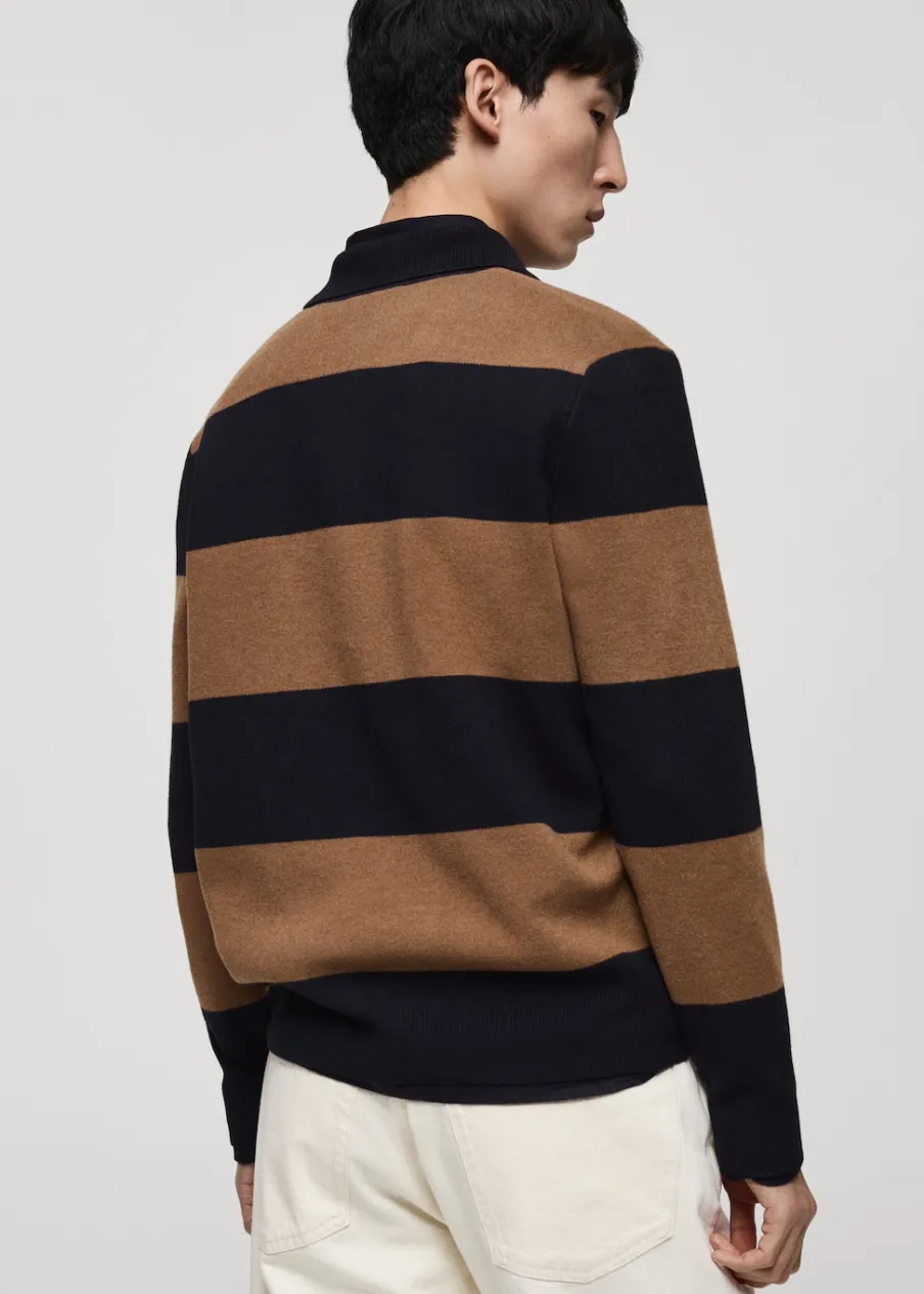 Tkanina z cienkiej dzianiny. Wzór w paski. Kołnierzyk polo. Ściągaczowe wykończenia. Model ma 185 cm wzrostu i nosi rozmiar M.