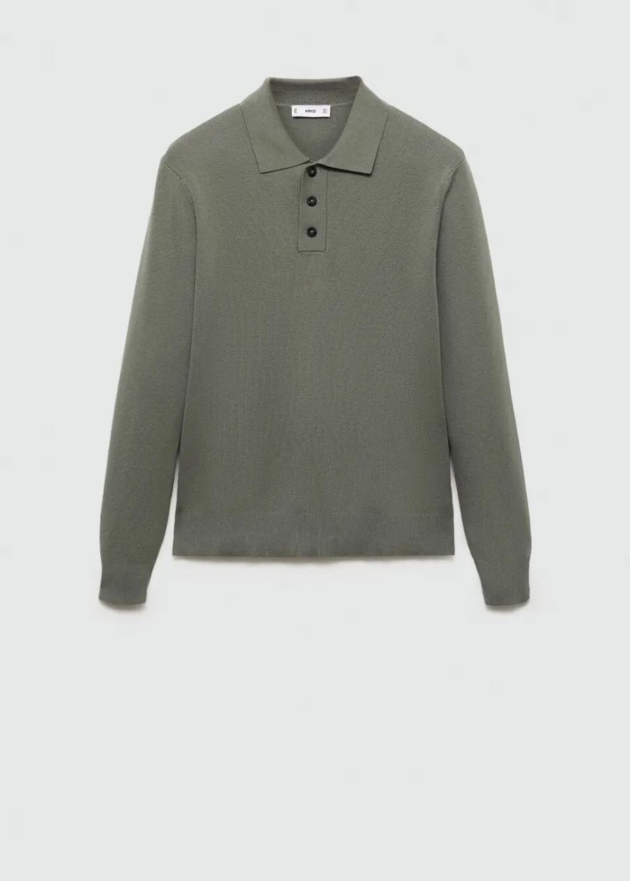 Tkanina mieszanka bawełny. Tkanina z cienkiej dzianiny. Kołnierzyk polo z zapięciem na guziki. Długi rękaw z elastycznymi mankietami. Prosty dół. Prążkowane wykończenie na rękawach i u dołu. Model ma 190 cm wzrostu i nosi rozmiar M.