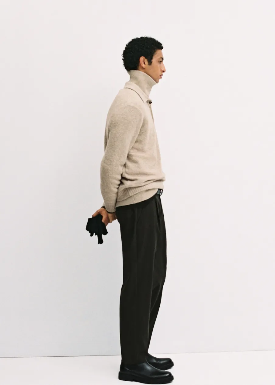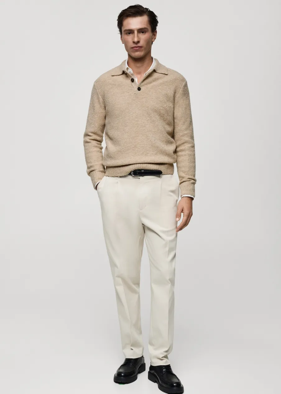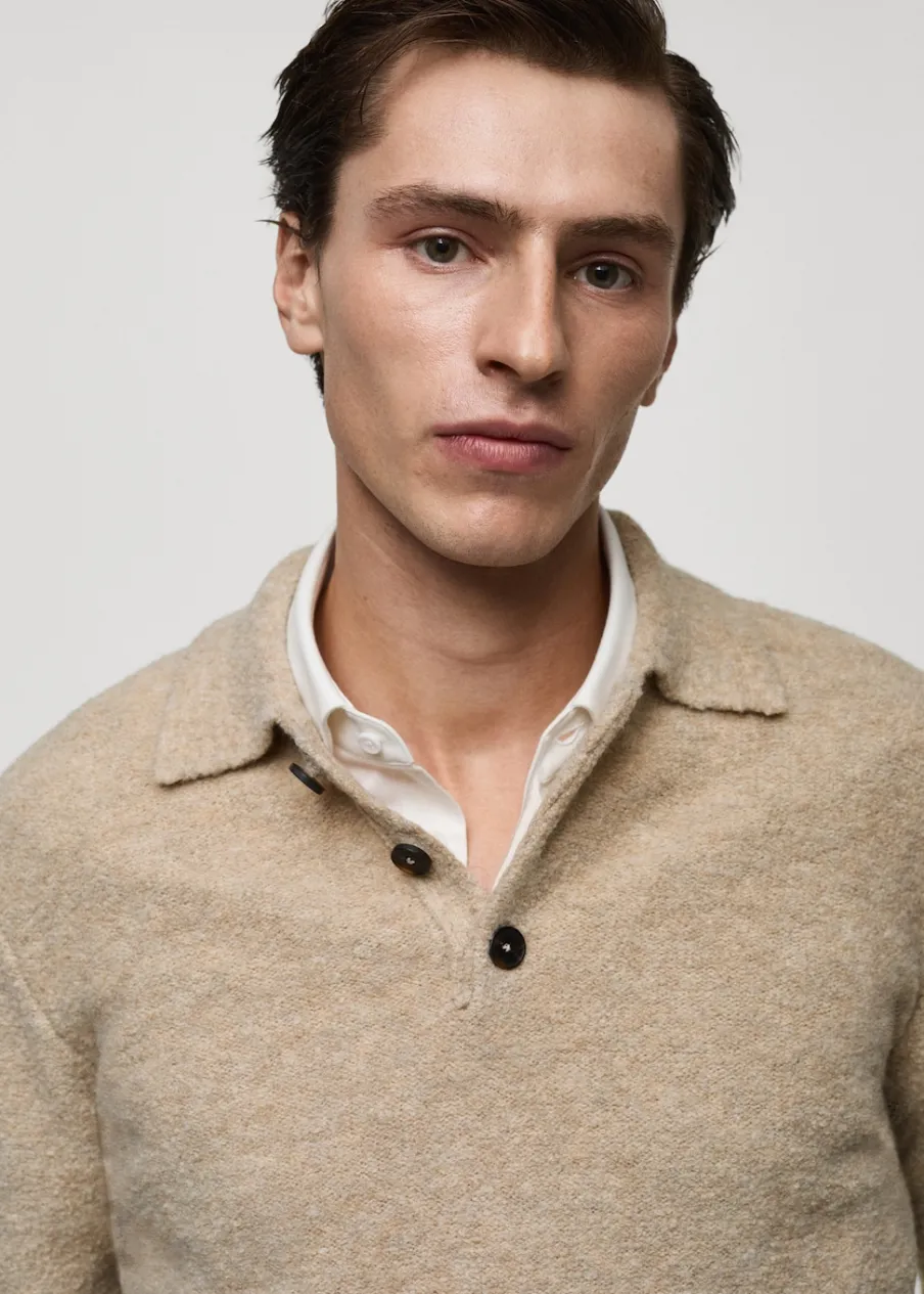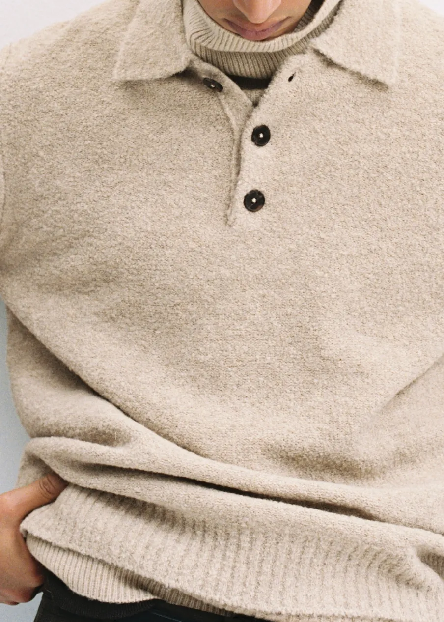 Tkanina mieszanka wełny. Krój regular. Tkanina bouclé. Kołnierzyk polo z zapięciem na guziki. Długi rękaw z elastycznymi mankietami. Prosty dół. Model ma 190 cm wzrostu i nosi rozmiar M.