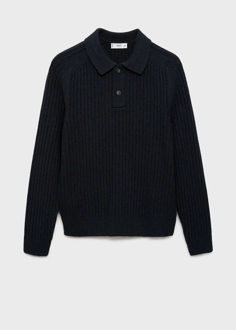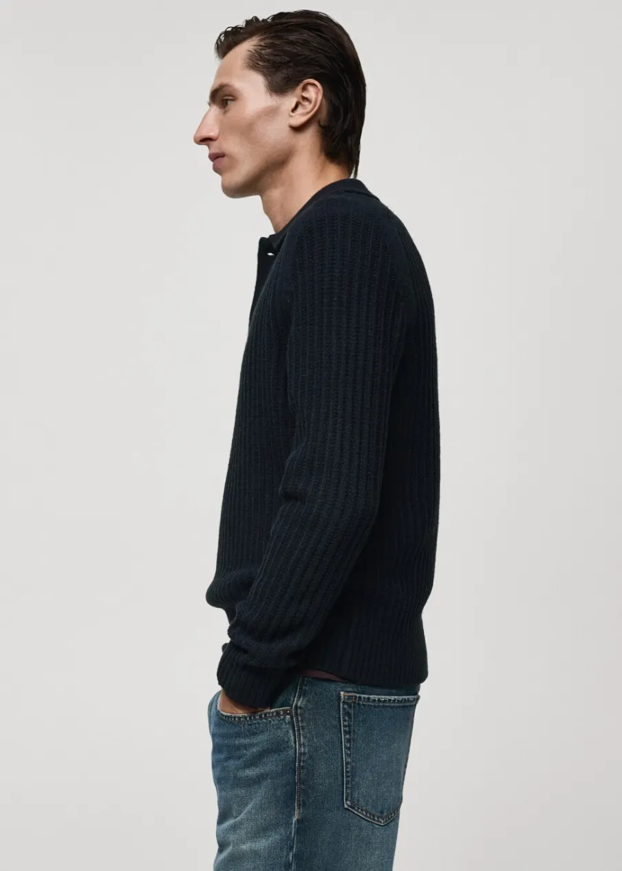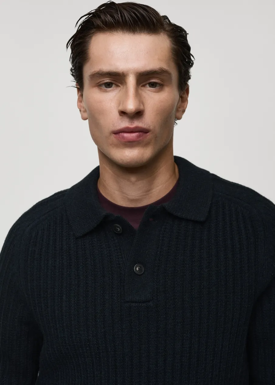 Krój regular. Tkanina mieszanka wełny. Gruba dzianina. Prążkowana tekstura. Kołnierzyk polo z zapięciem na guziki. Model ma 185 cm wzrostu i nosi rozmiar M.