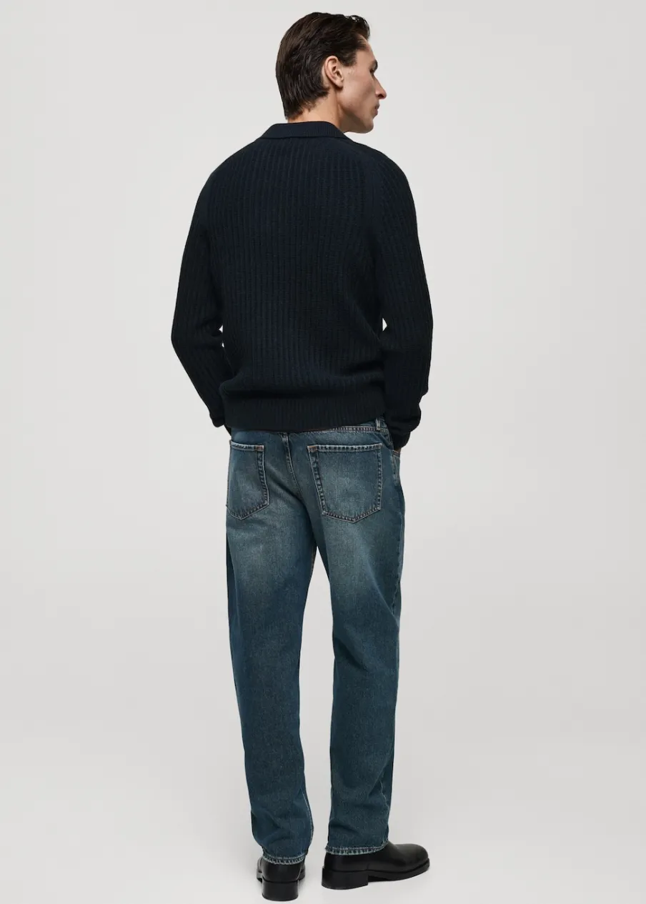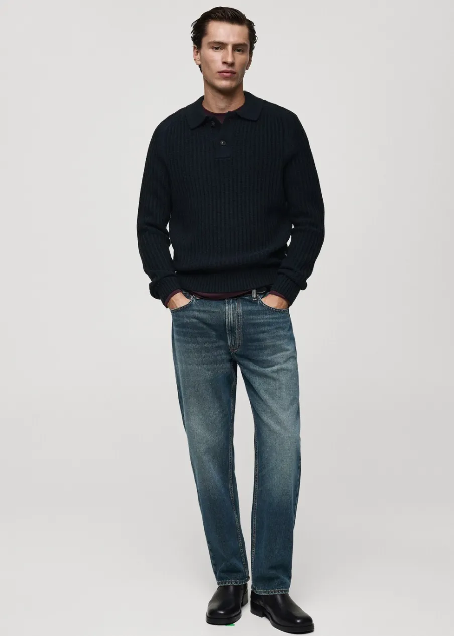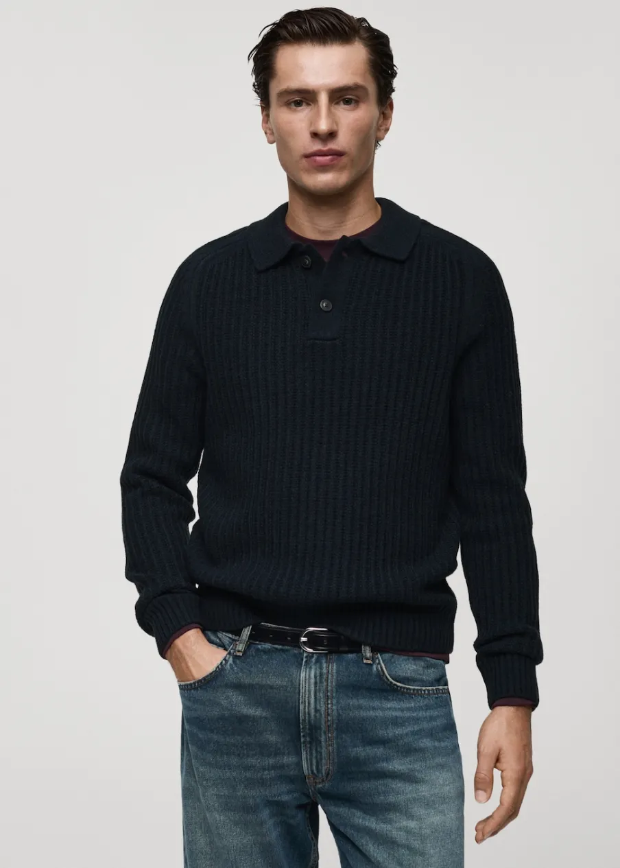 Krój regular. Tkanina mieszanka wełny. Gruba dzianina. Prążkowana tekstura. Kołnierzyk polo z zapięciem na guziki. Model ma 185 cm wzrostu i nosi rozmiar M.