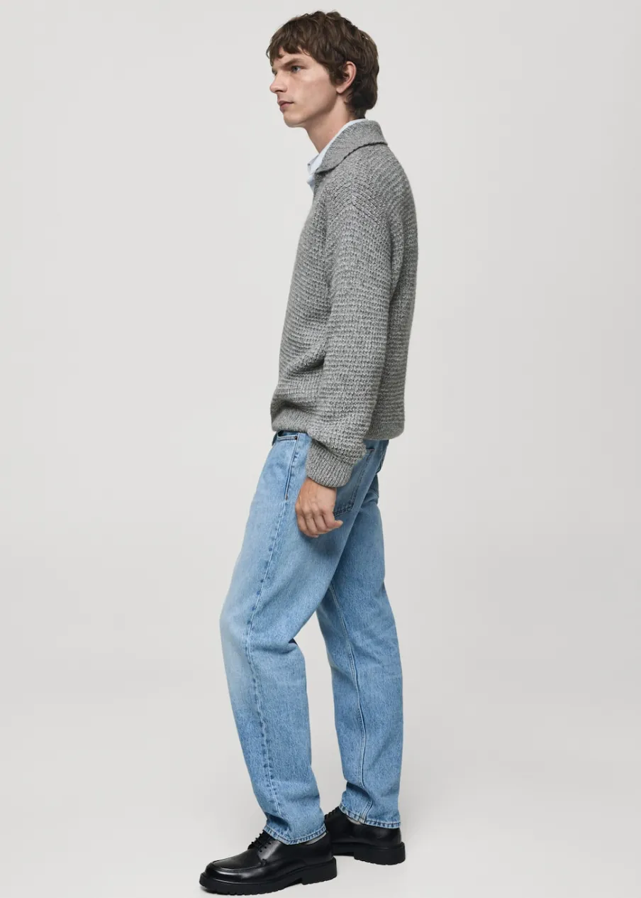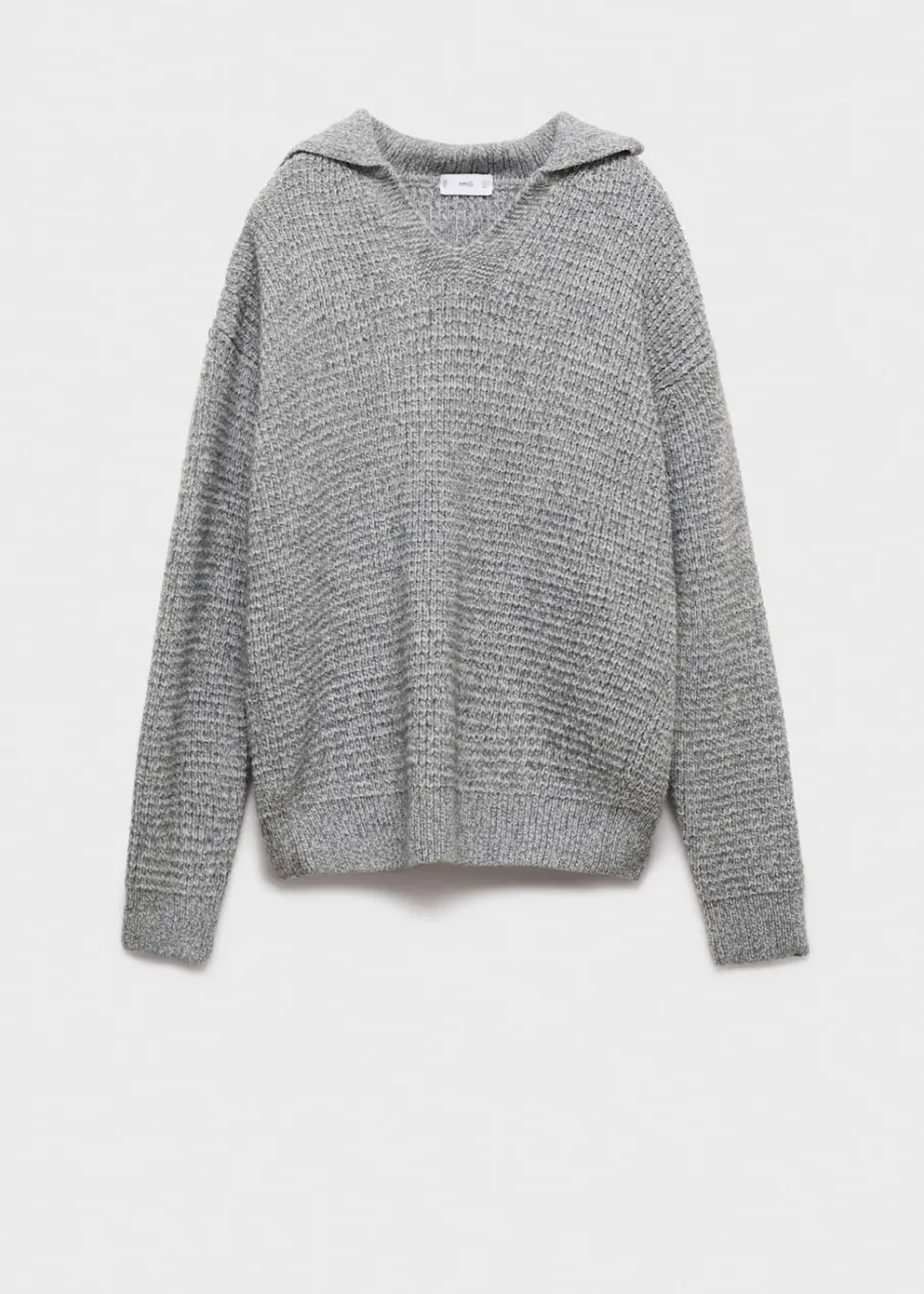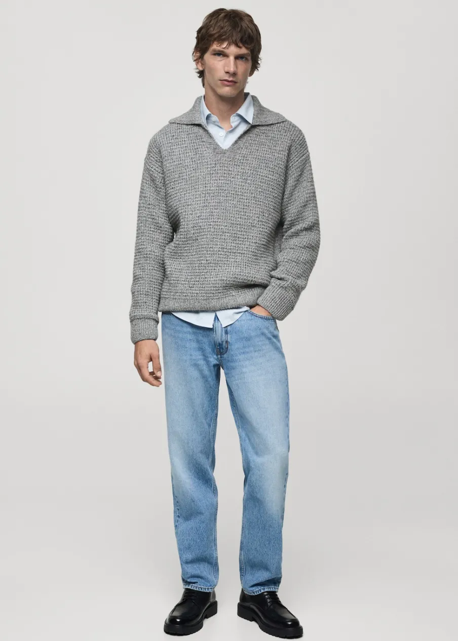 Tkanina mieszana z włoskiej wełny. Deseń melanżowy. Gruba dzianina z warkoczami. Długi rękaw. Kołnierzyk polo. Model ma 185 cm wzrostu i nosi rozmiar M. Kampania z Antoinem Griezmannem.