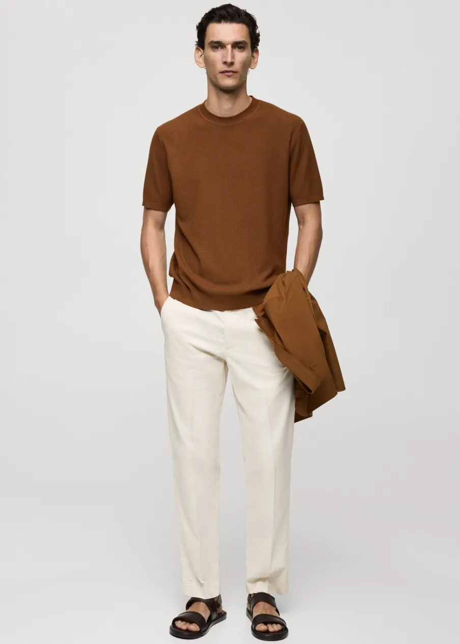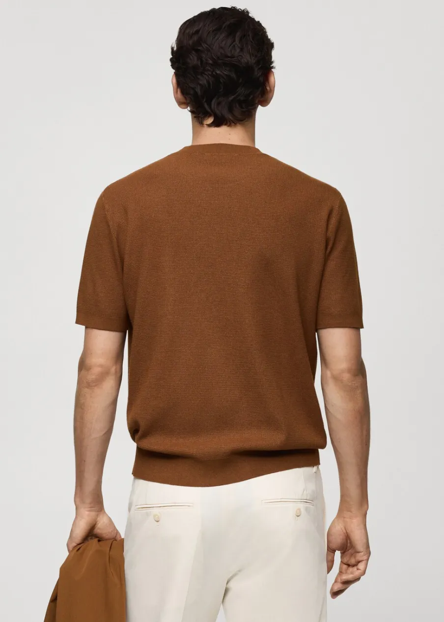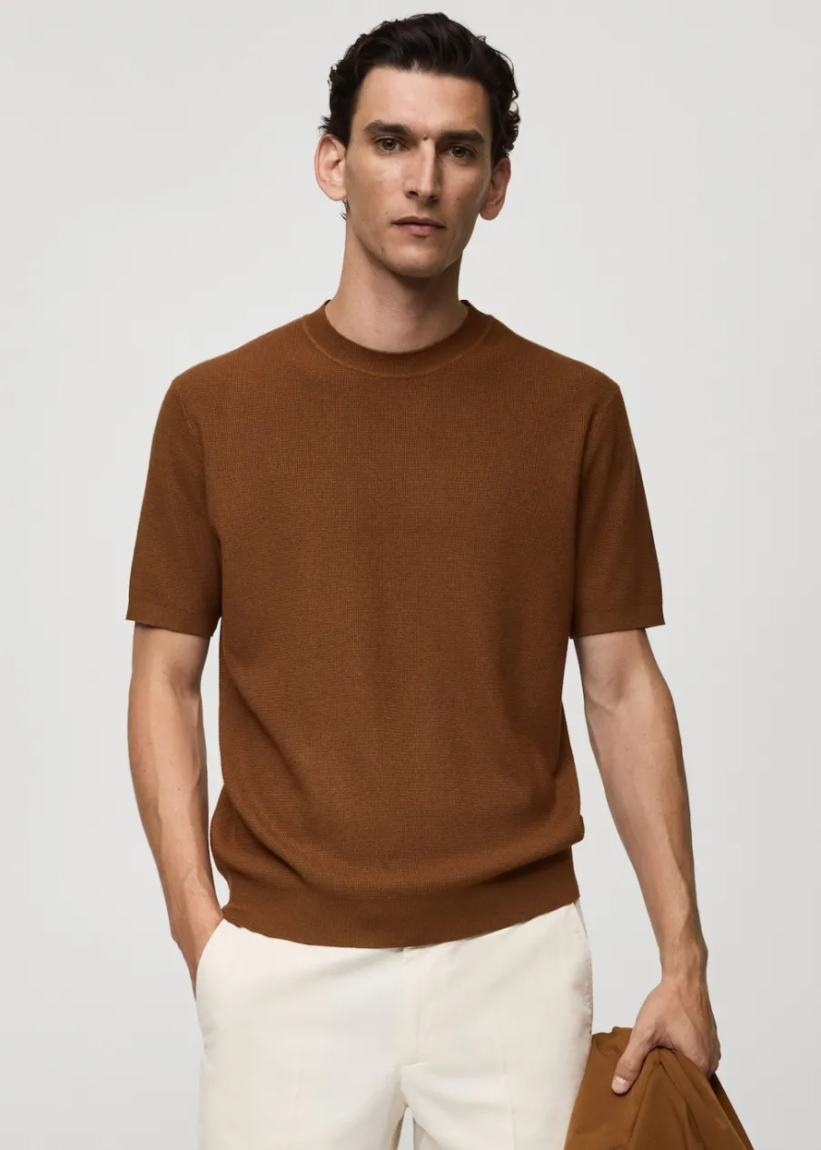 Delikatna dzianina z mikrostrukturą. Model prosty. Okrągły dekolt. Krótki rękaw. Prosty dół. Model ma 190 cm wzrostu i nosi rozmiar M. Prążkowane wykończenie na dekolcie, rękawach i u dołu.