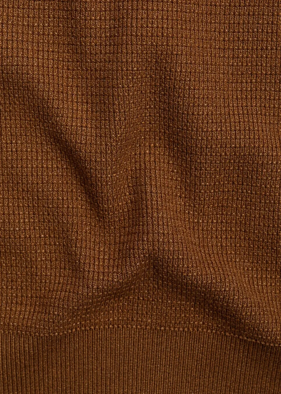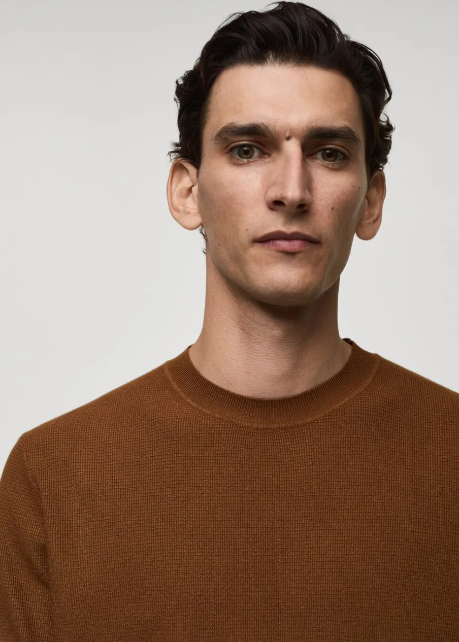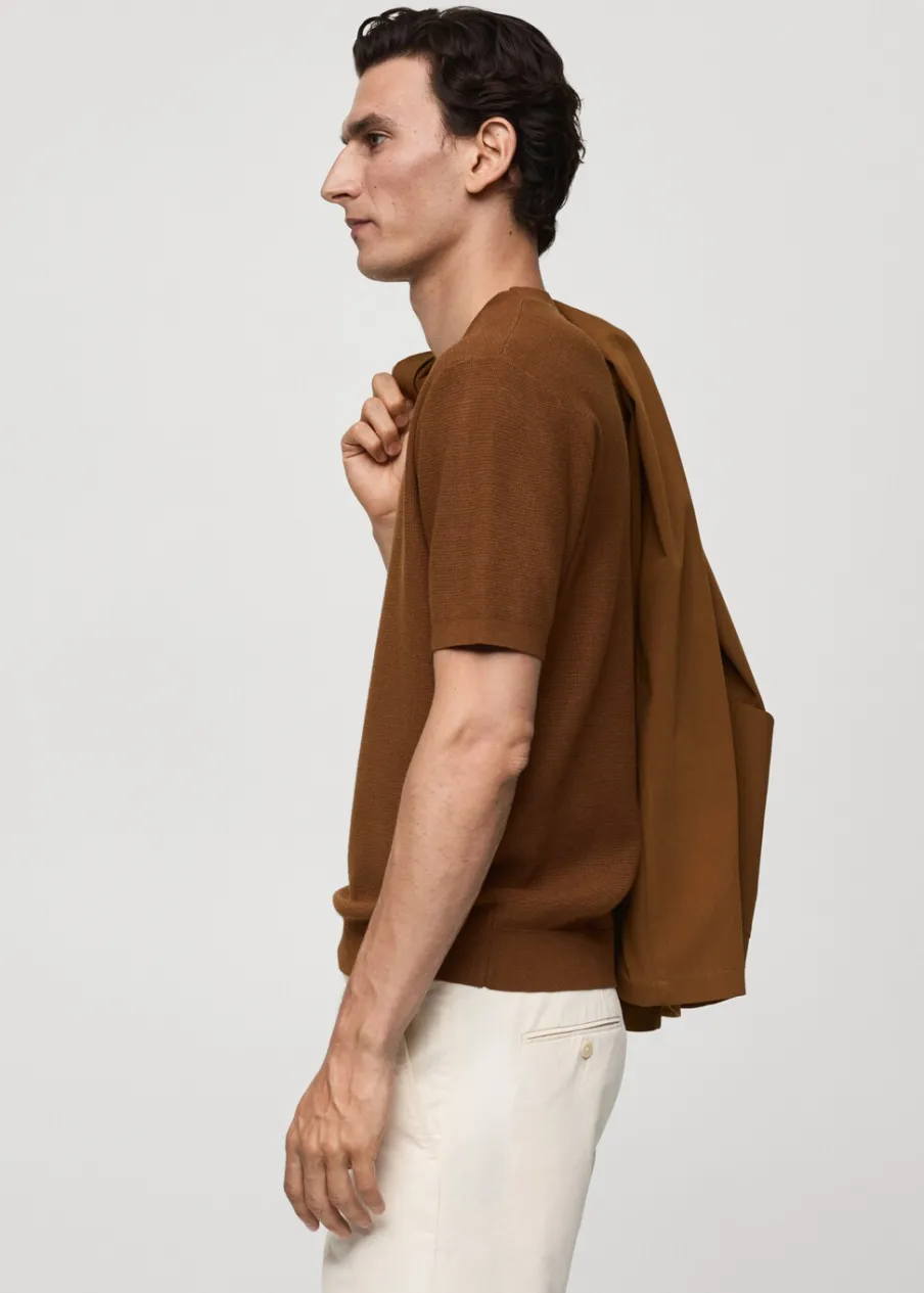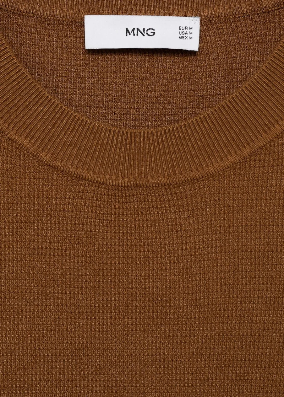 Delikatna dzianina z mikrostrukturą. Model prosty. Okrągły dekolt. Krótki rękaw. Prosty dół. Model ma 190 cm wzrostu i nosi rozmiar M. Prążkowane wykończenie na dekolcie, rękawach i u dołu.