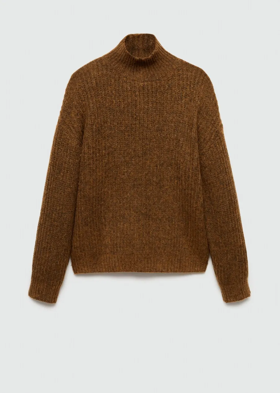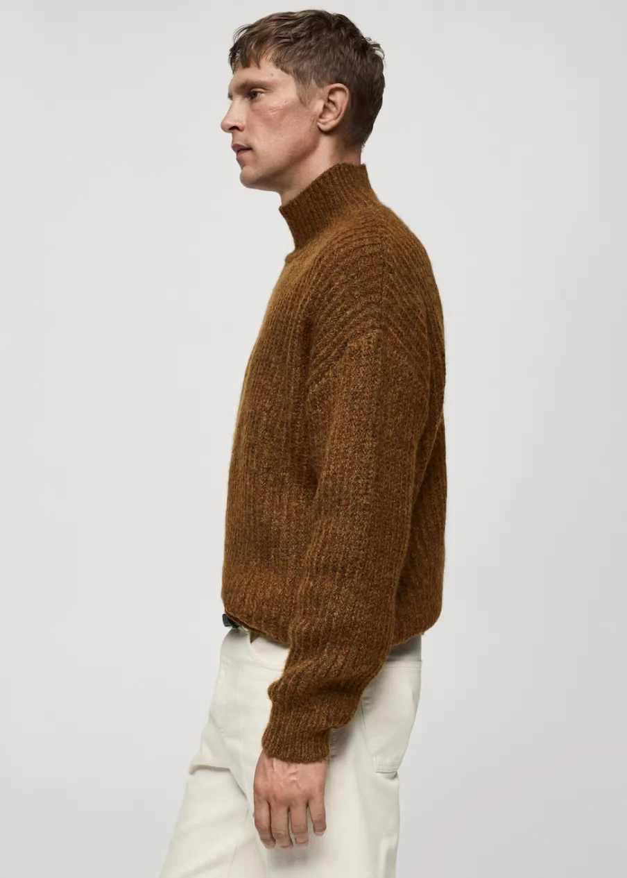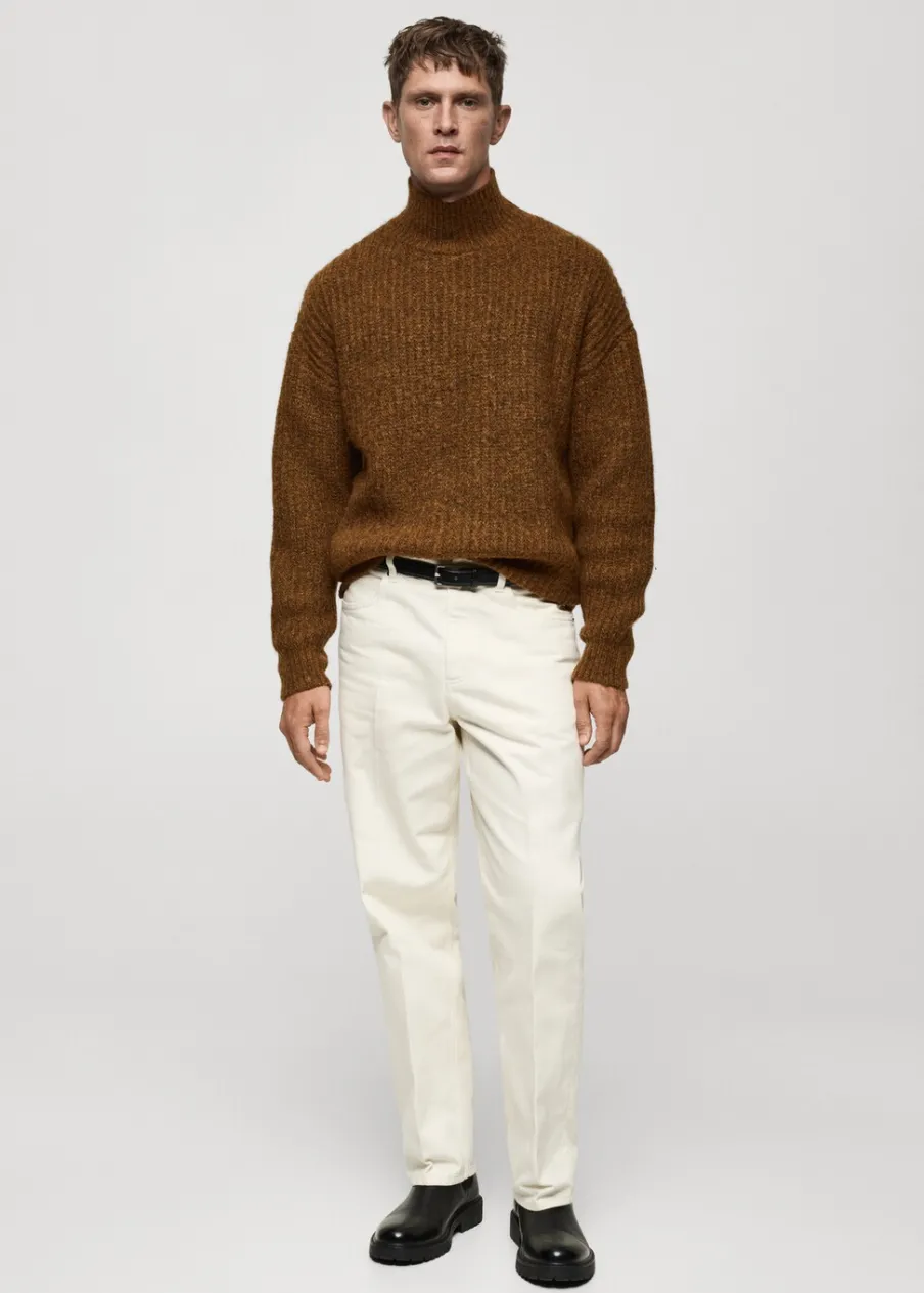 Tkanina z grubej dzianiny. Ściągaczowa tkanina. Półgolf. Elastyczne ściągacze. Model ma 185 cm wzrostu i nosi rozmiar M.