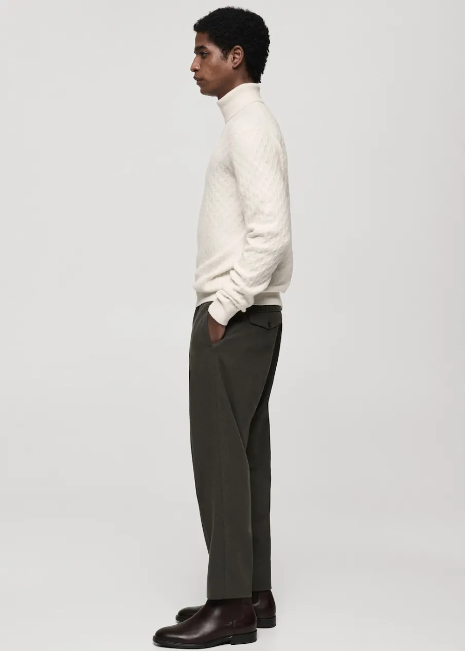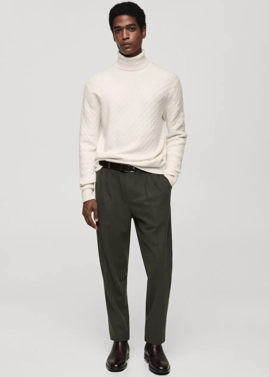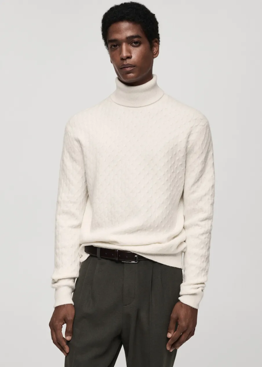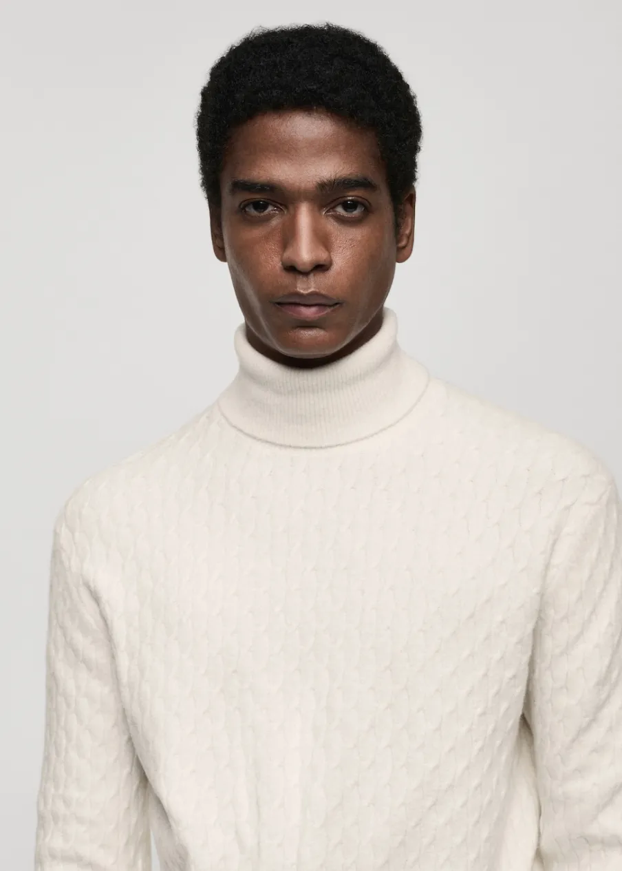 Krój regular. Golf. Dzianina strukturalna. Ściągaczowe wykończenia. Model ma 185 cm wzrostu i nosi rozmiar M.