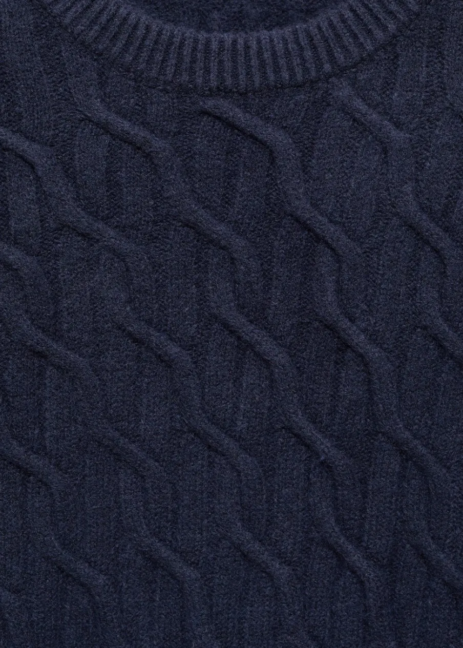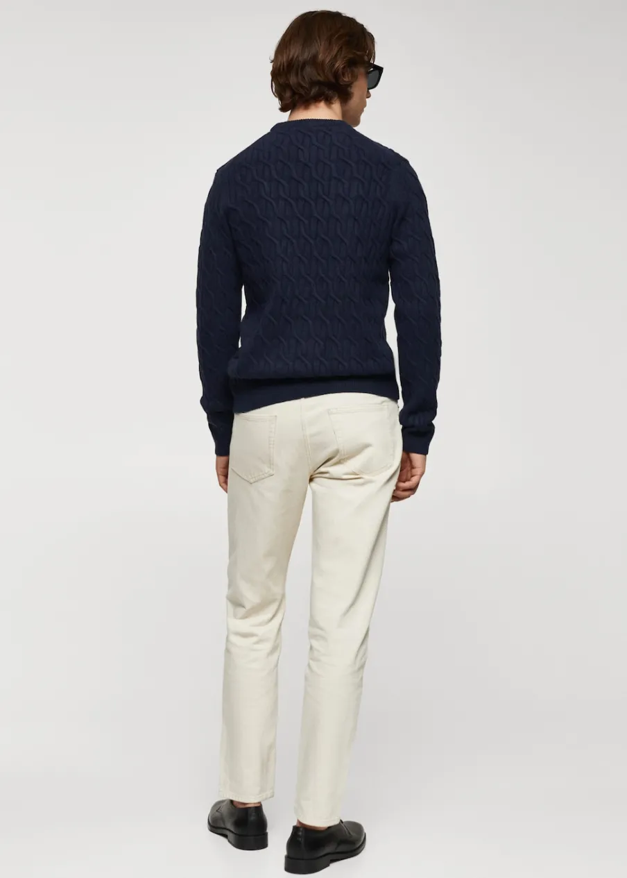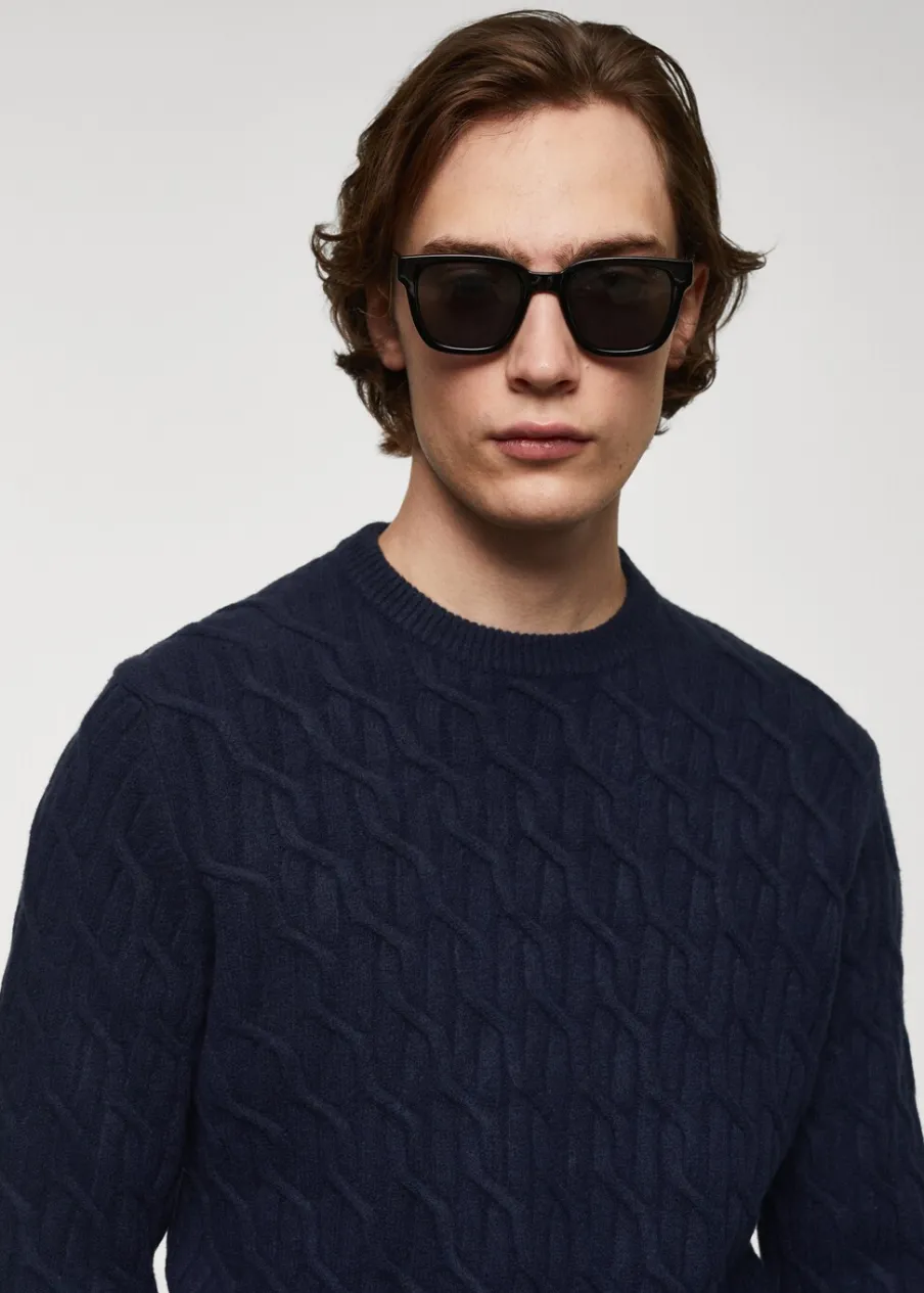 Dzianina średniej grubości. Model pleciony. Okrągły dekolt. Długi rękaw. Prosty dół. Model ma 190 cm wzrostu i nosi rozmiar M. Prążkowane wykończenie na dekolcie, rękawach i u dołu.