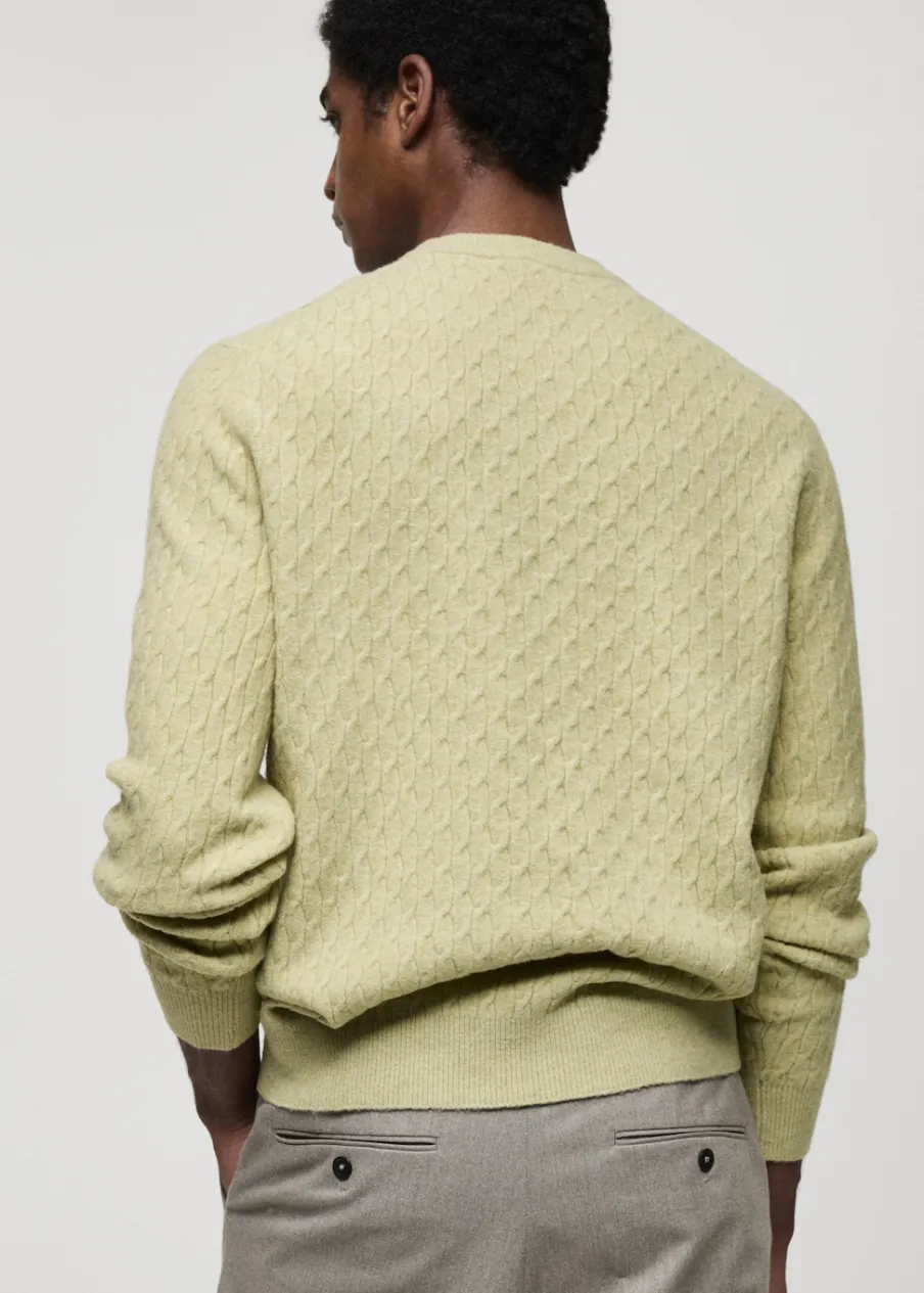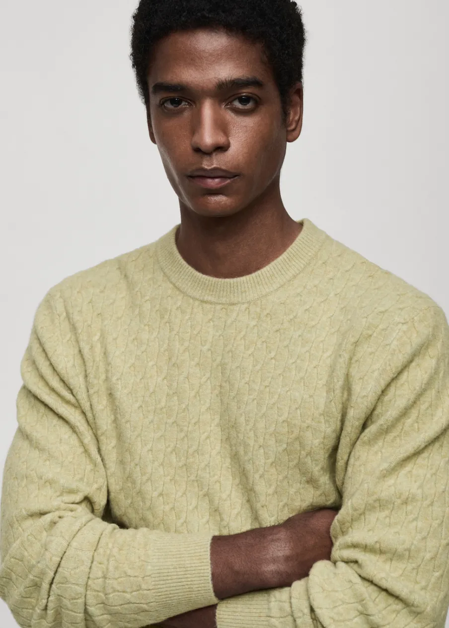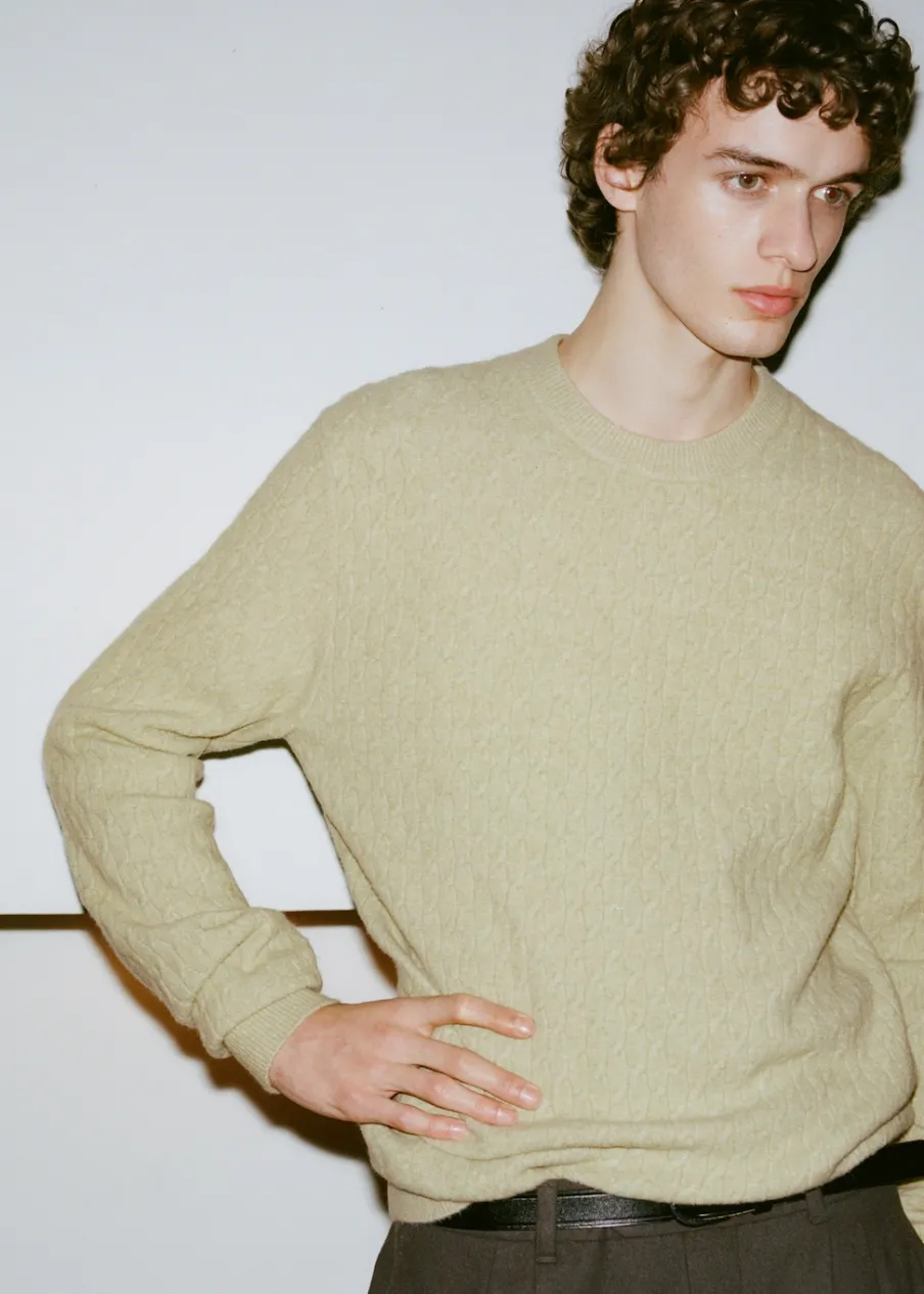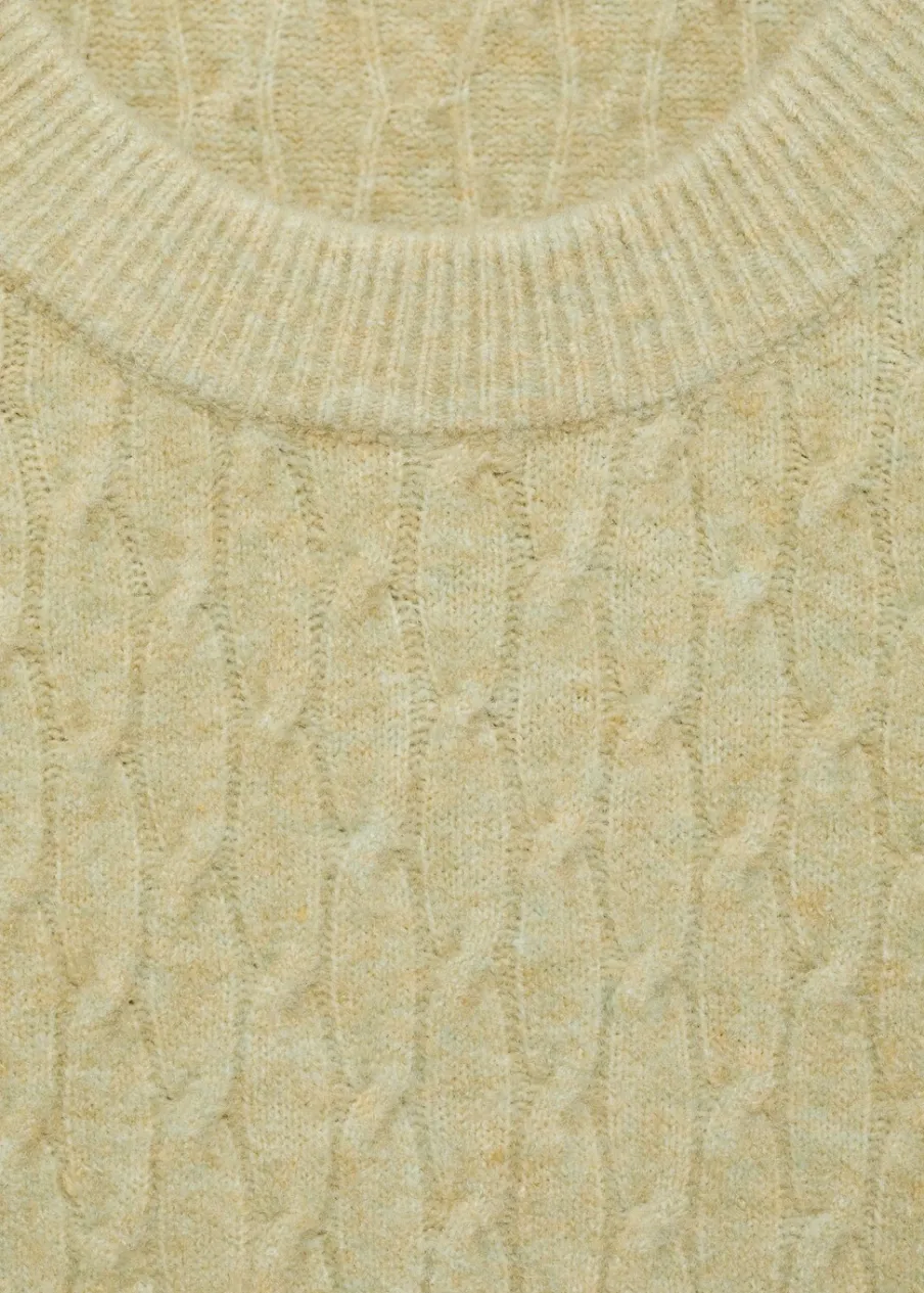Dzianina ze splotem. Dzianina średniej grubości. Okrągły dekolt. Prążkowane wykończenie na dekolcie, rękawach i u dołu. Model ma 185 cm wzrostu i nosi rozmiar M.