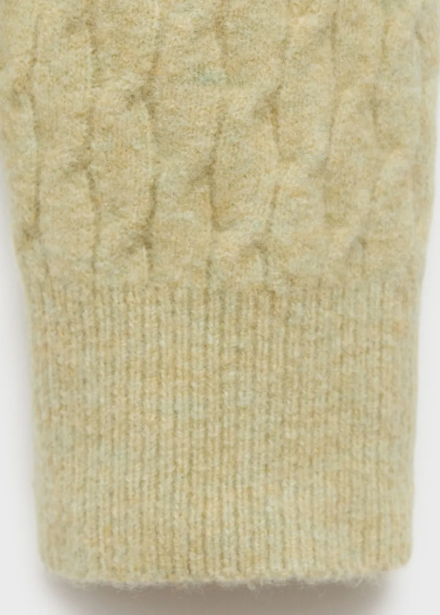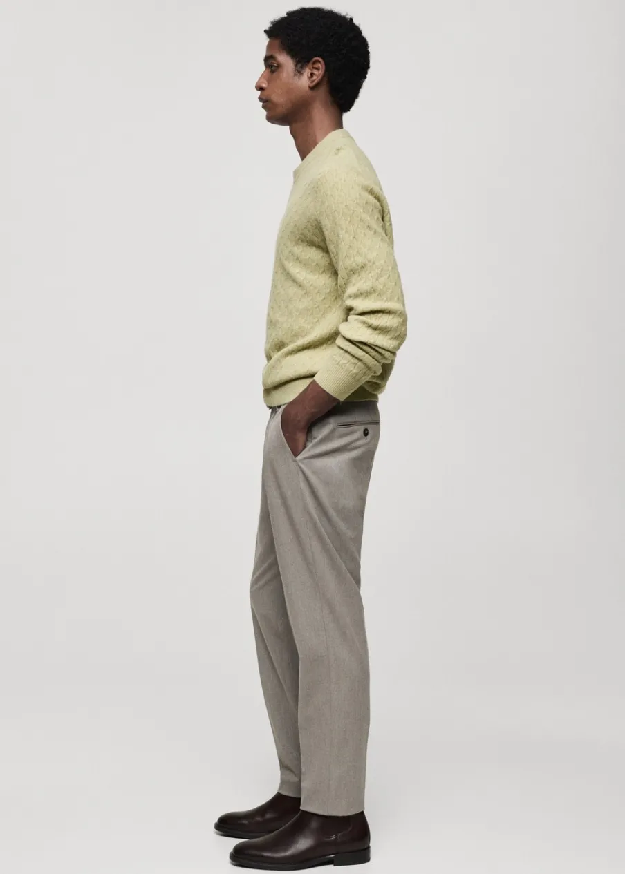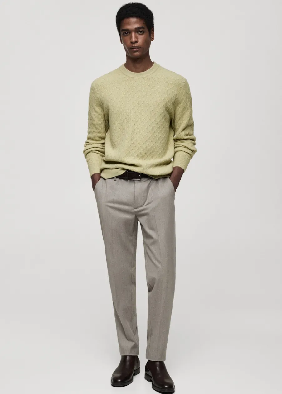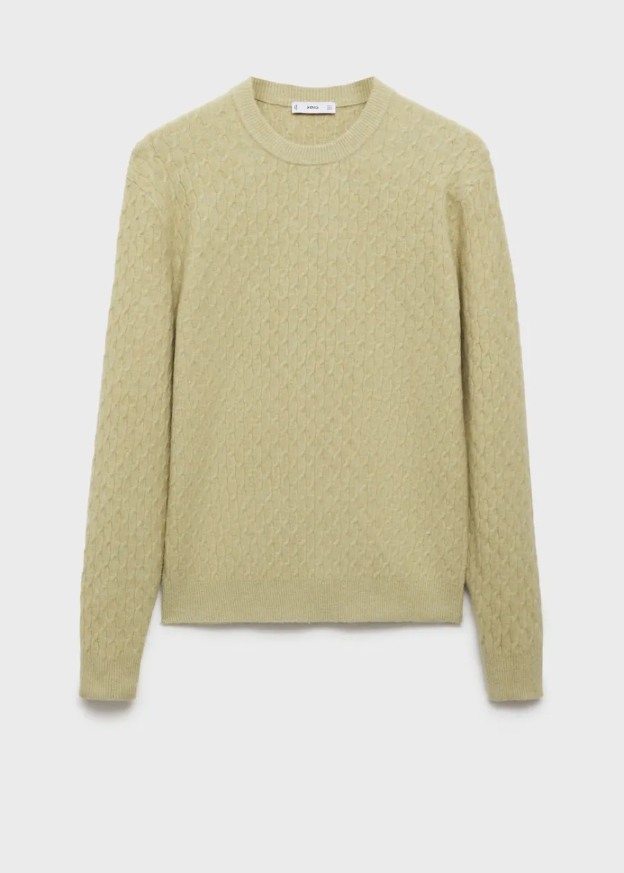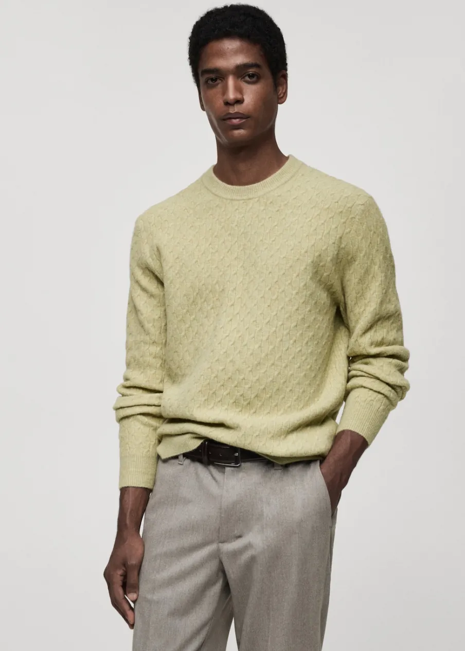 Dzianina ze splotem. Dzianina średniej grubości. Okrągły dekolt. Prążkowane wykończenie na dekolcie, rękawach i u dołu. Model ma 185 cm wzrostu i nosi rozmiar M.