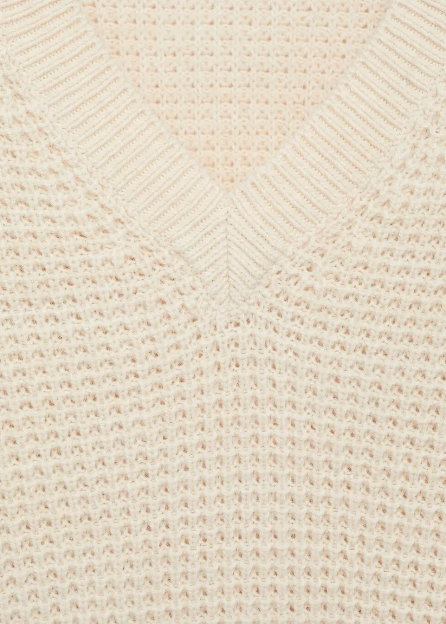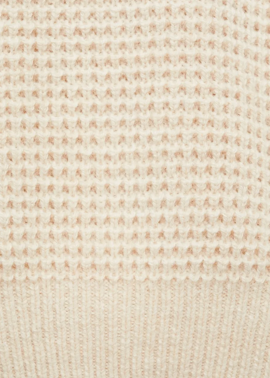 Model standardowy. Tkanina z grubej dzianiny. Dzianina z teksturą w kratę. Dekolt V. Krój regular. Długi rękaw z elastycznymi mankietami. Prosty dół. Prążkowane wykończenie na dekolcie, rękawach i u dołu. Model ma 190 cm wzrostu i nosi rozmiar M. Długi rękaw. Mieszanka wełny organicznej i alpaki.