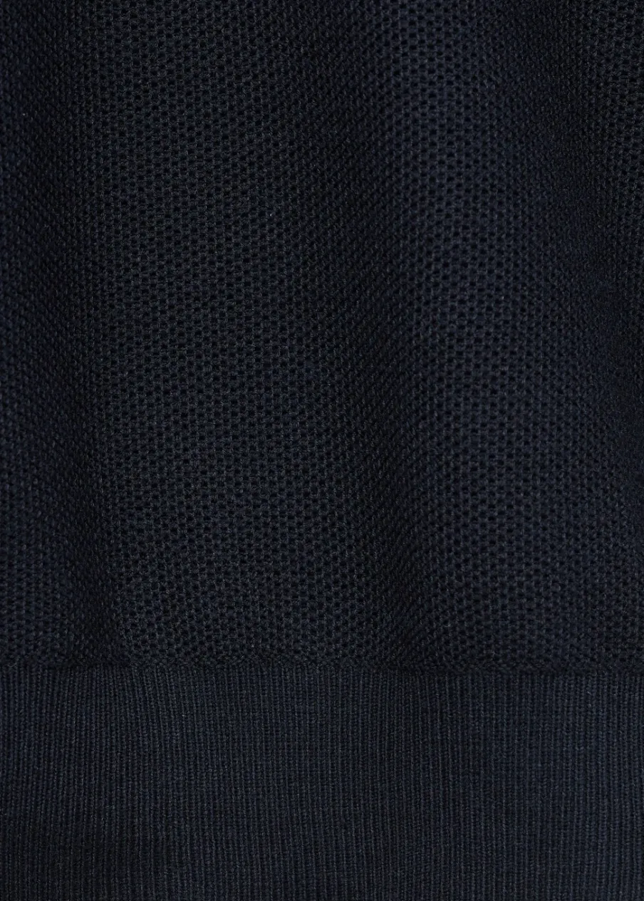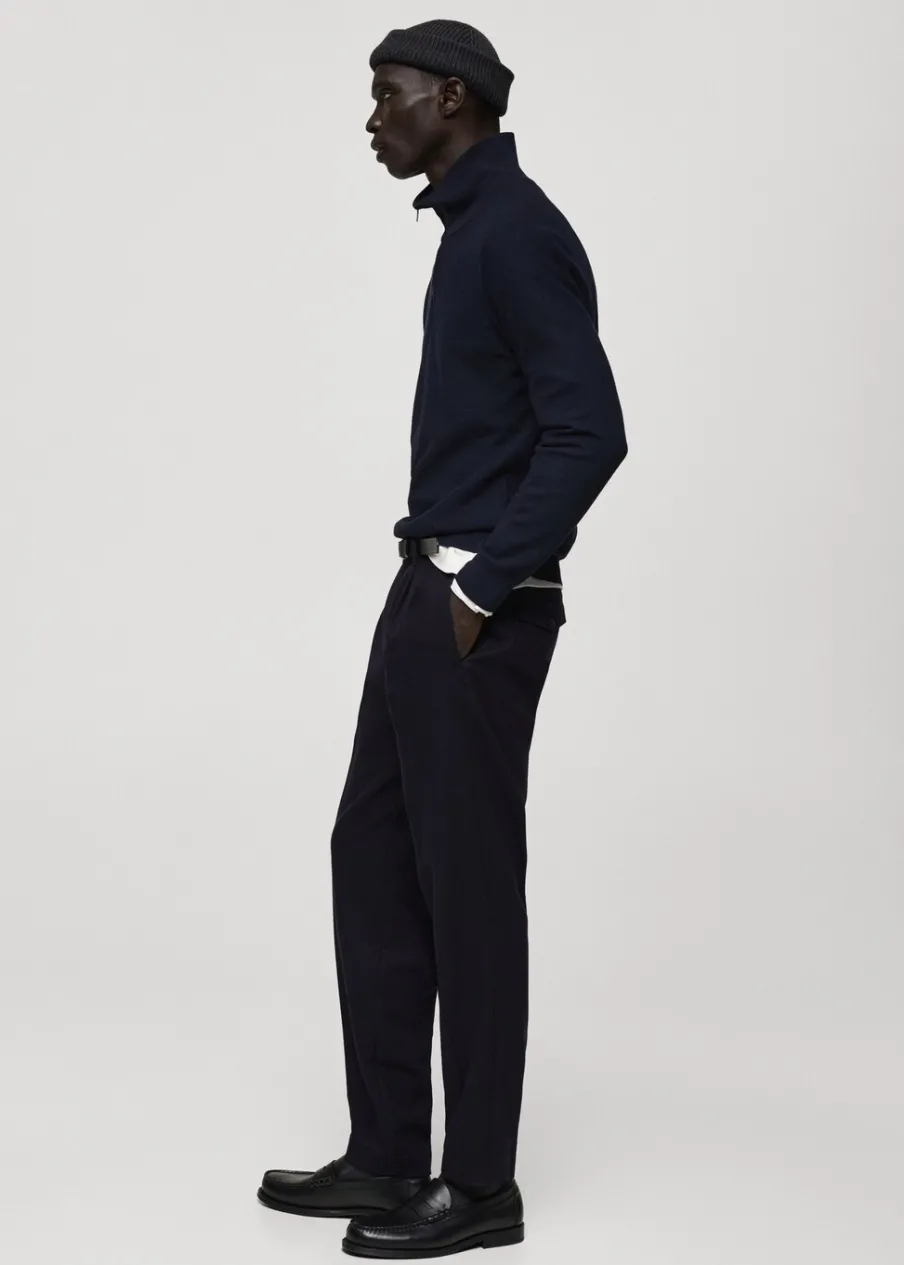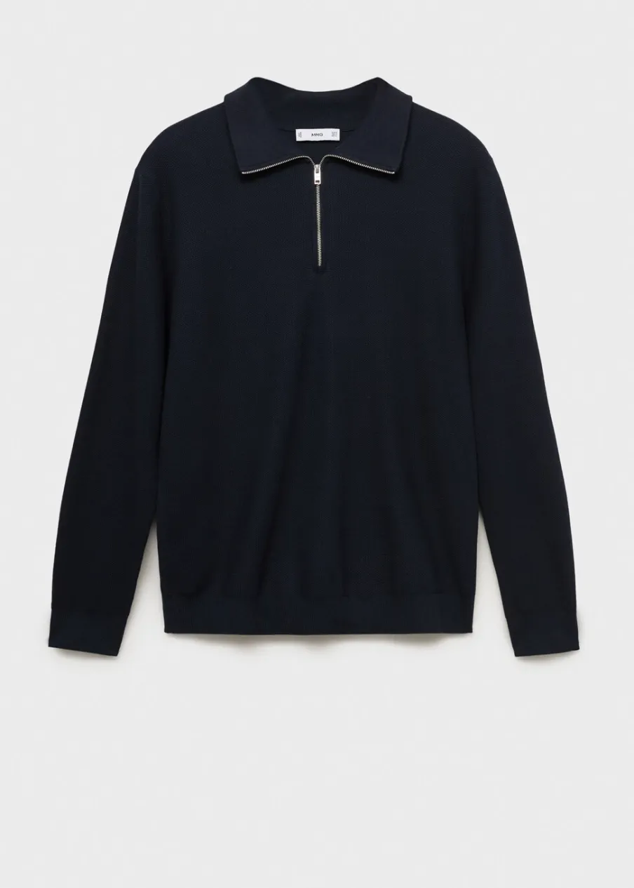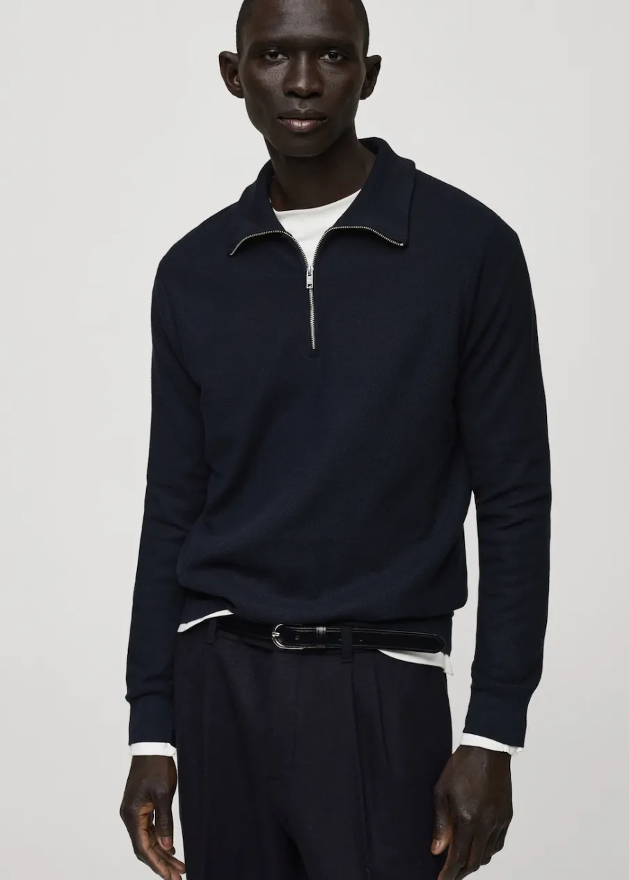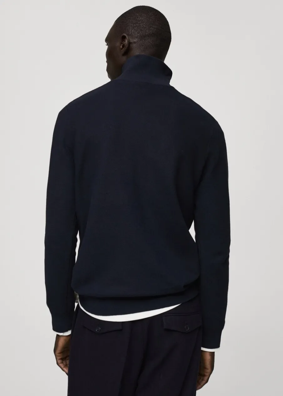 Krój regular. Bawełniana tkanina. Tkanina z cienkiej dzianiny. Wzór z drobną fakturą. Kominowy kołnierz. Zapięcie na zamek na dekolcie. Kołnierz, mankiety i dół z prążkowanej dzianiny. Model ma 185 cm wzrostu i nosi rozmiar M.