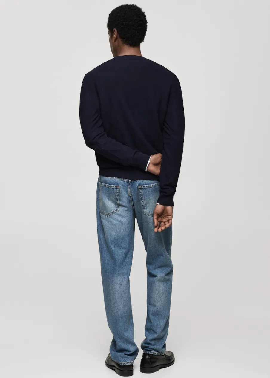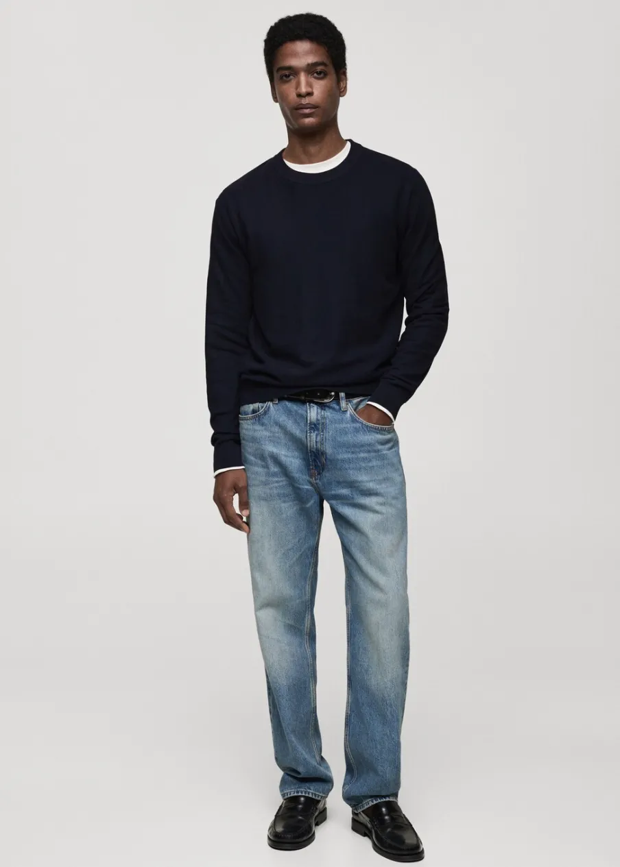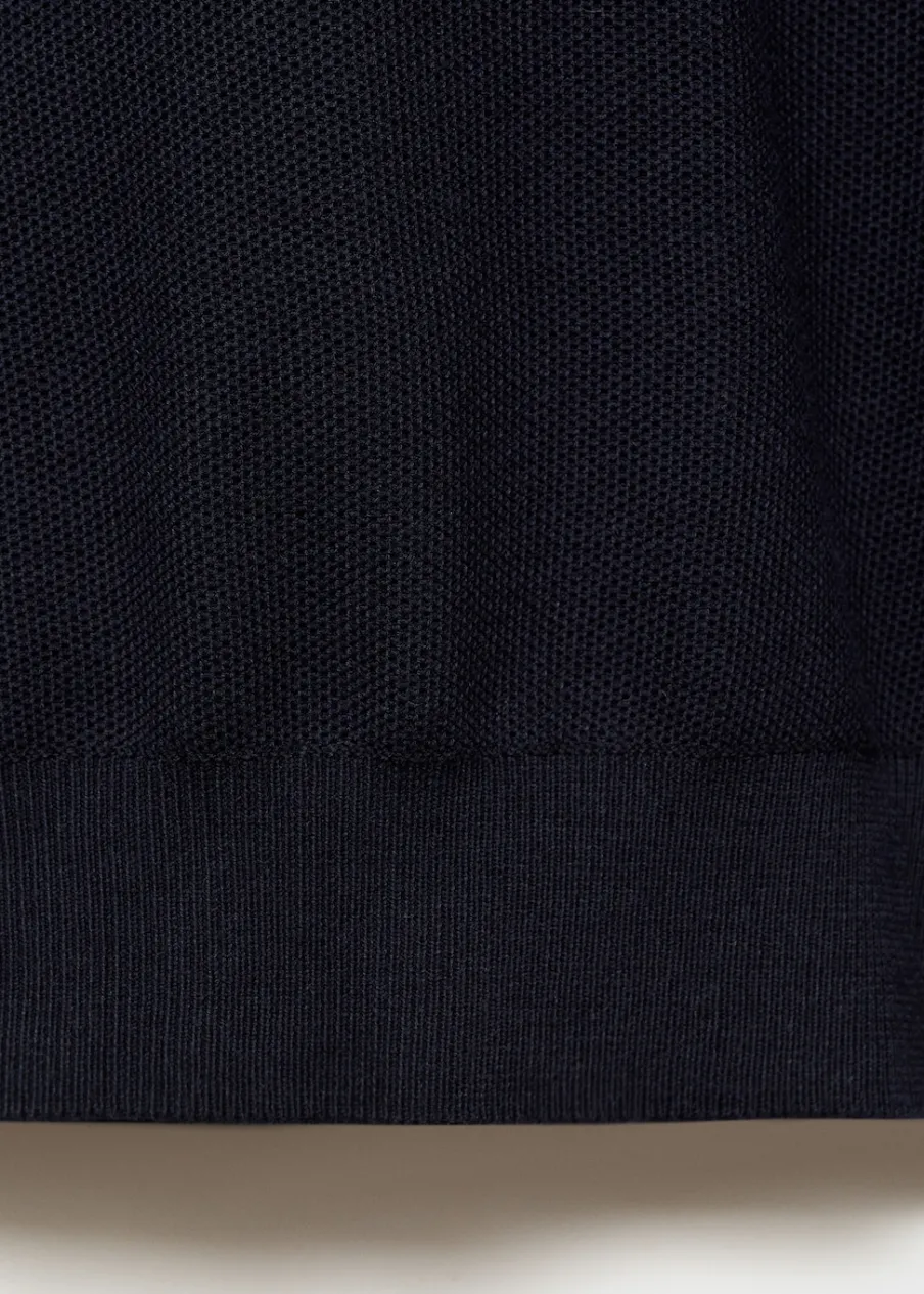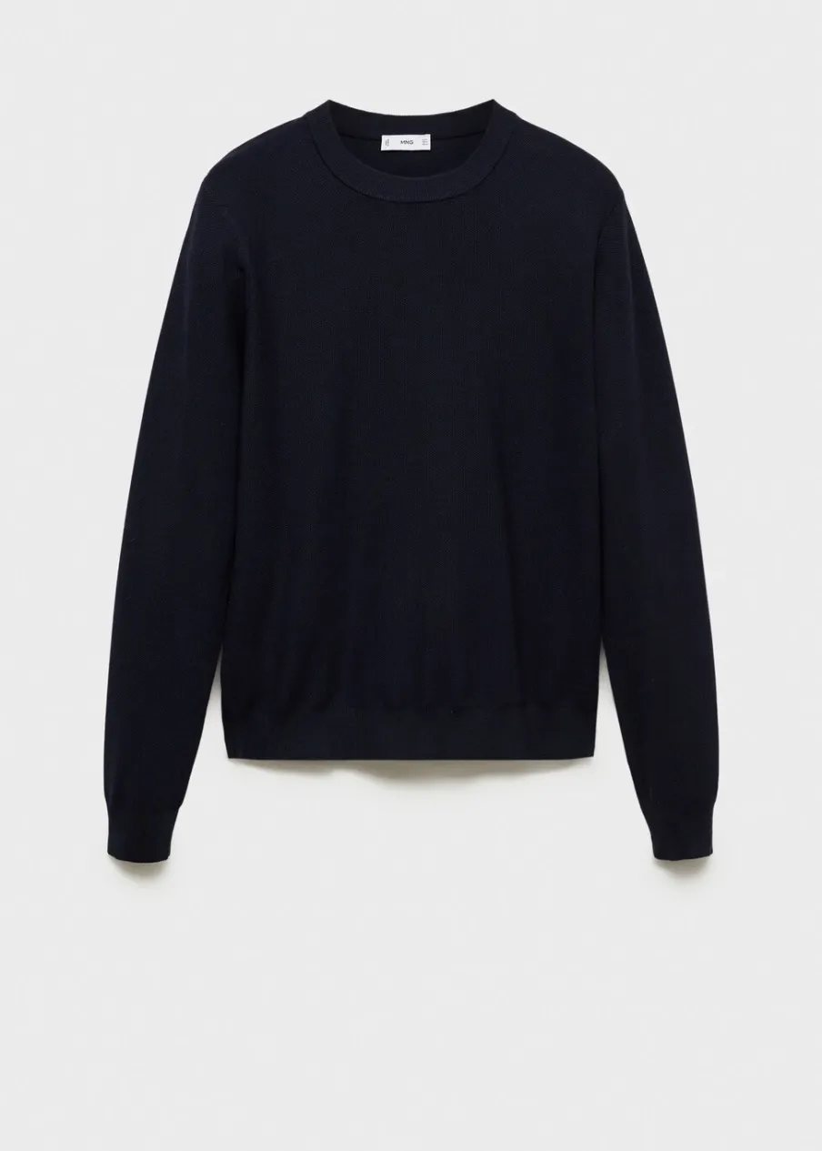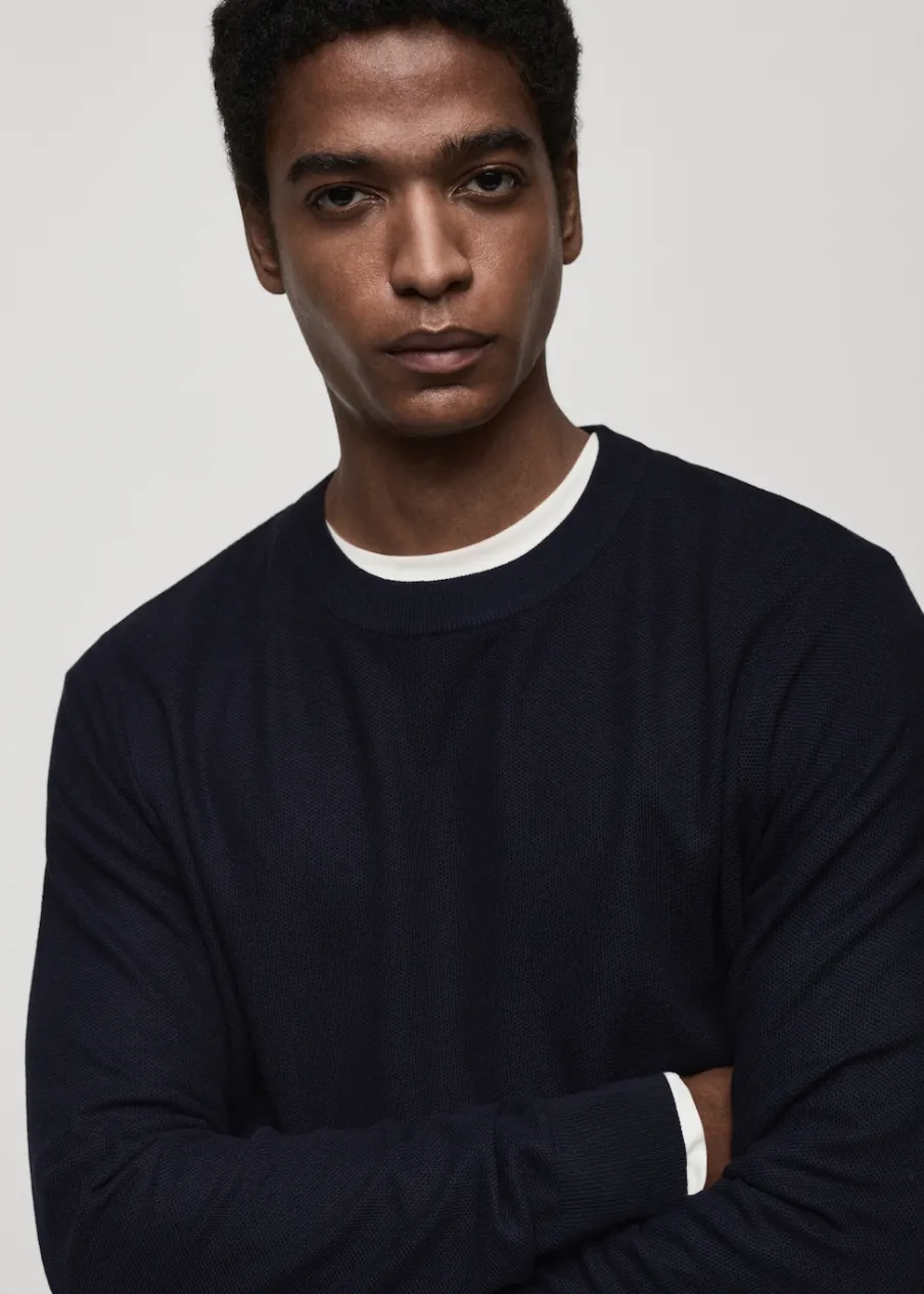 Tkanina mieszanka bawełny. Tkanina z cienkiej dzianiny. Wzór z drobną fakturą. Okrągły dekolt. Prążkowane wykończenie na dekolcie, rękawach i u dołu. Model ma 185 cm wzrostu i nosi rozmiar M.