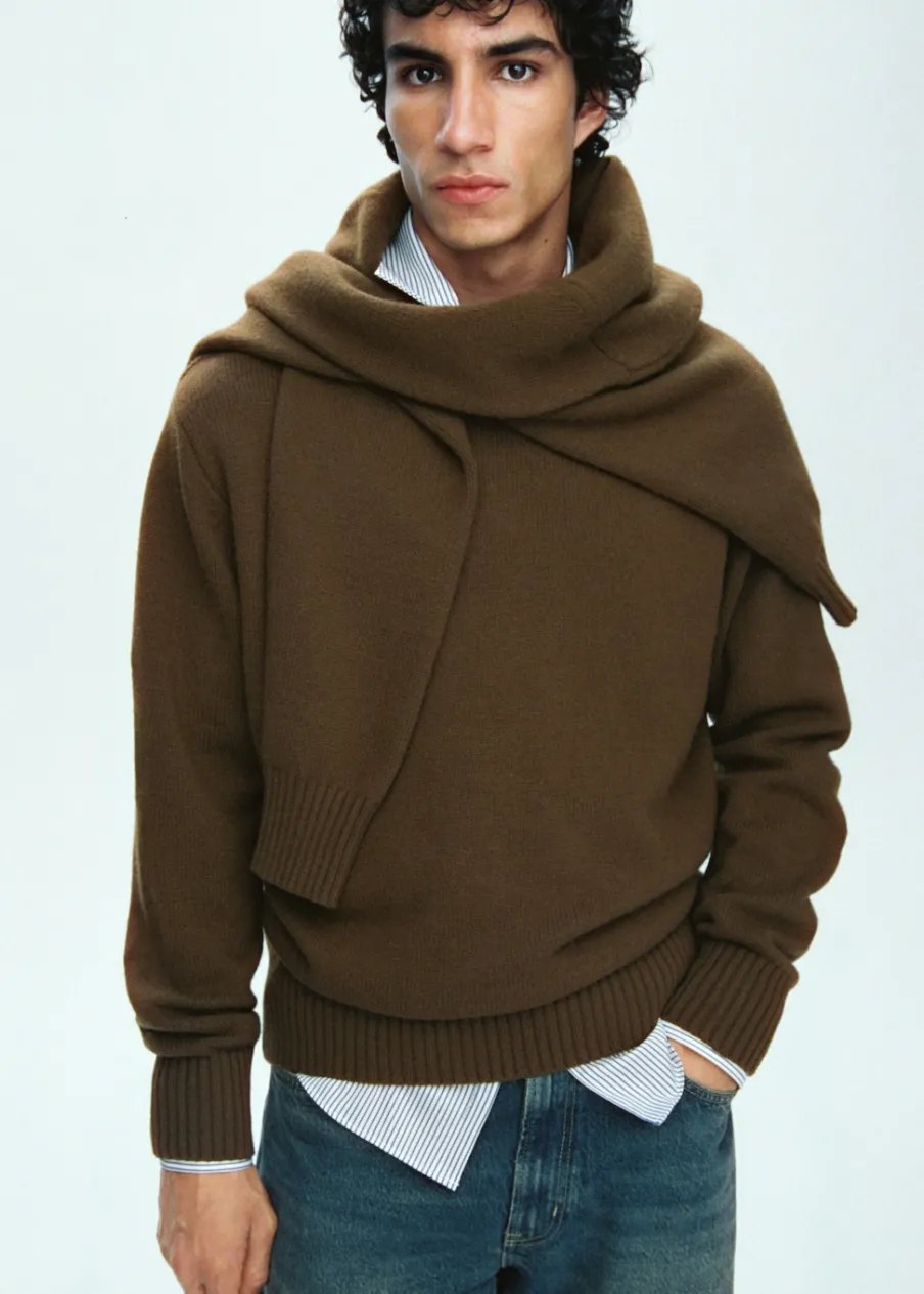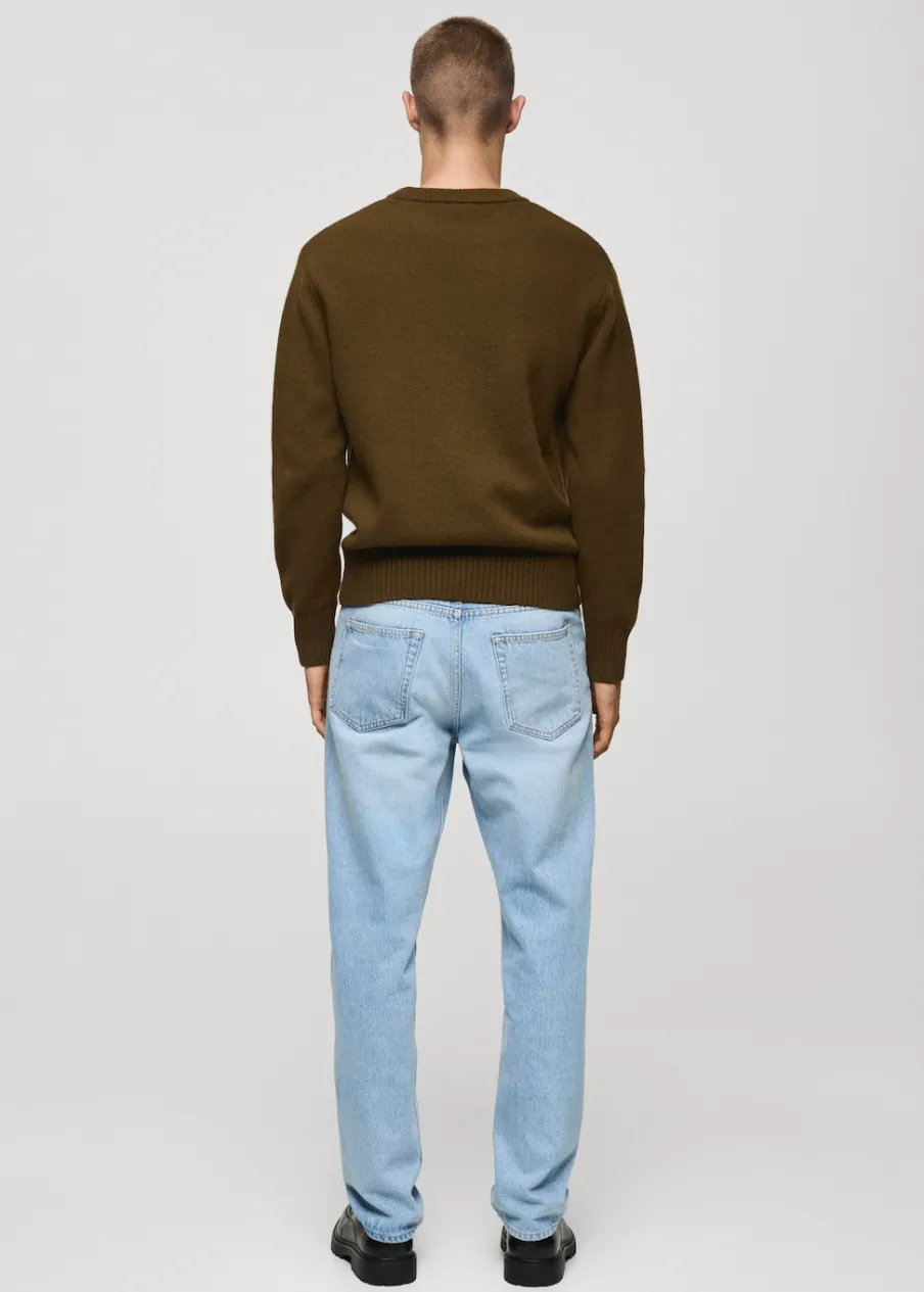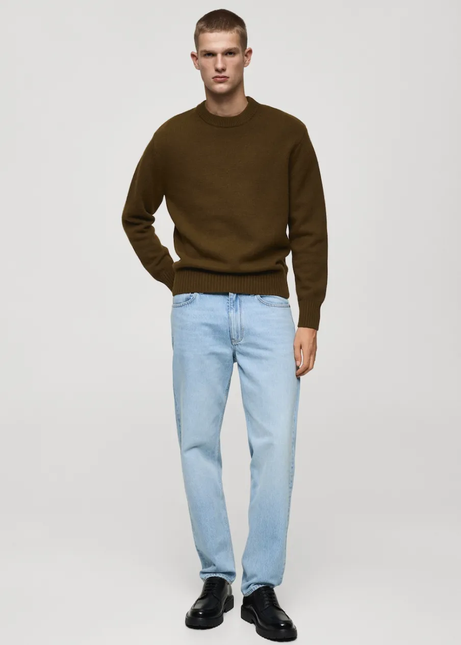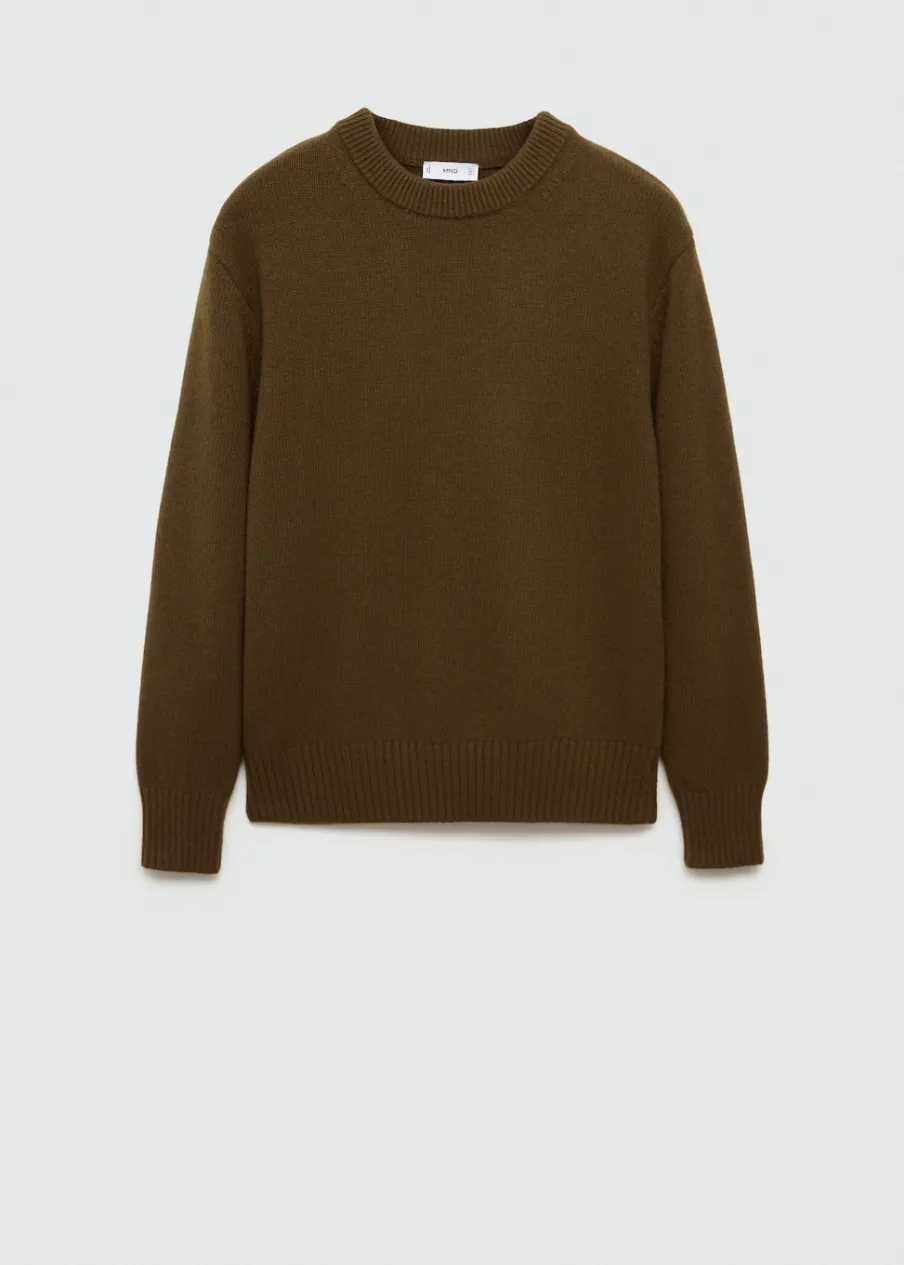 Tkanina mieszanka wełny. Tkanina z grubej dzianiny. Krój regular. Okrągły dekolt. Długi rękaw z elastycznymi mankietami. Prosty dół. Model ma 190 cm wzrostu i nosi rozmiar M. Prążkowane wykończenie na dekolcie, rękawach i u dołu.