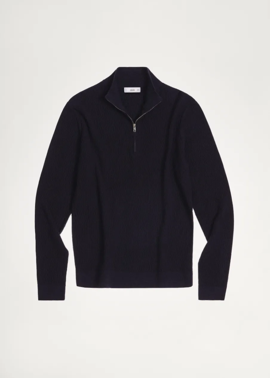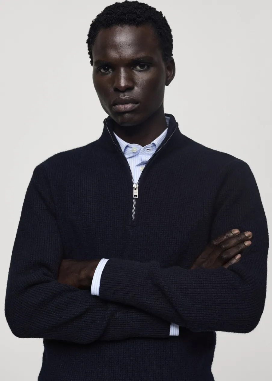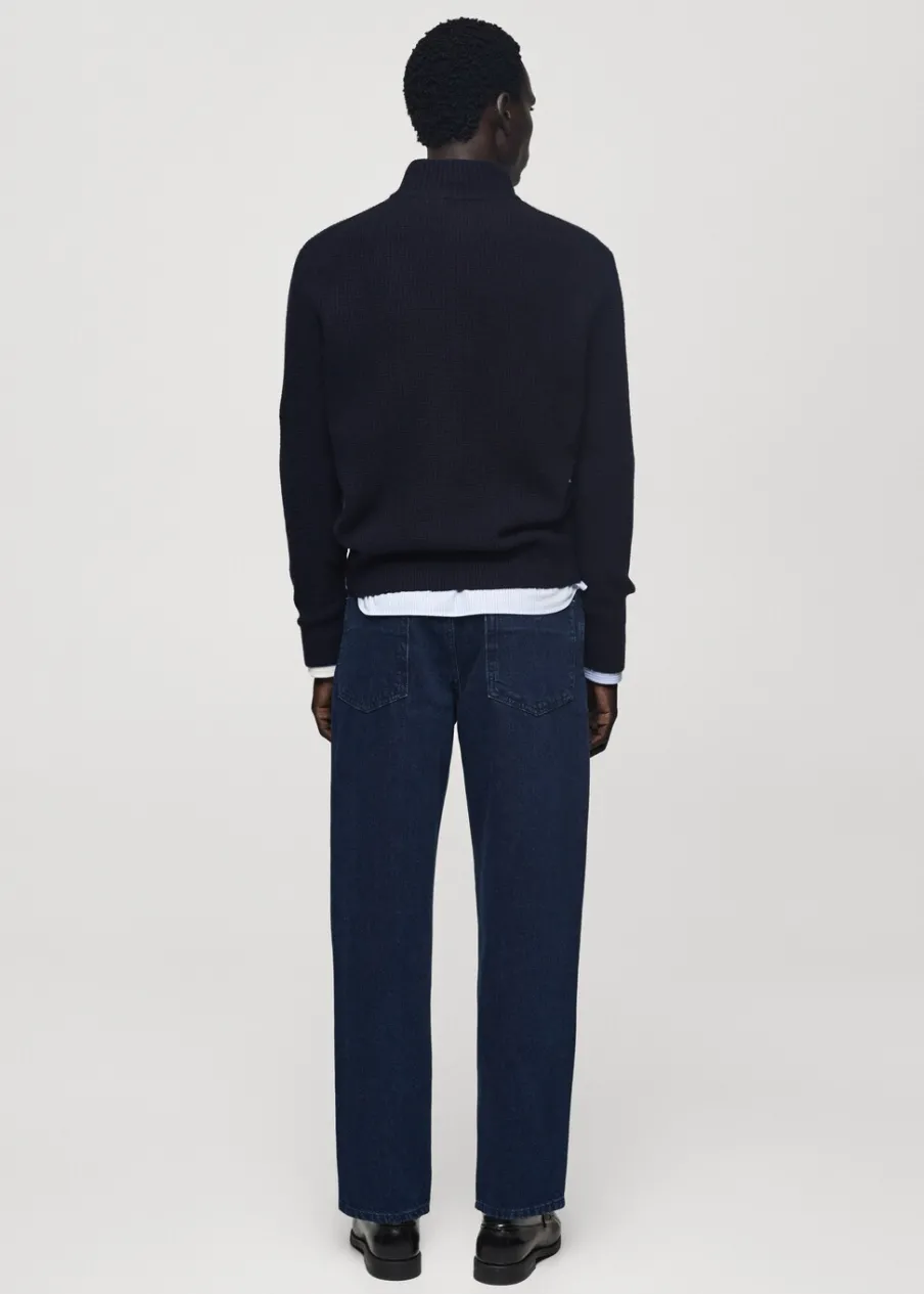 Krój regular. Dzianina średniej grubości. Materiały z recyklingu. Długi rękaw. Półgolf na zamek. Ściągaczowe wykończenia. Model ma 185 cm wzrostu i nosi rozmiar M. Kolory niebieski i biały są dostępne tylko online.
