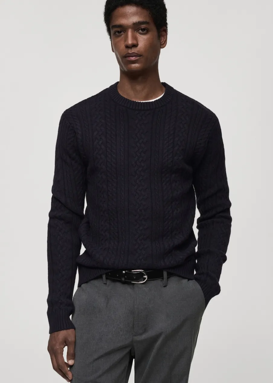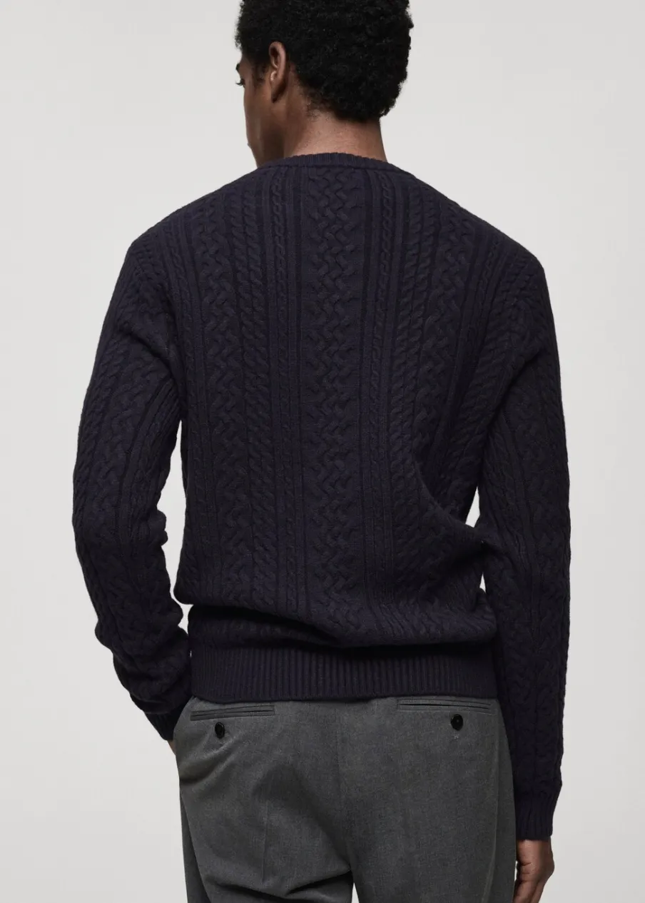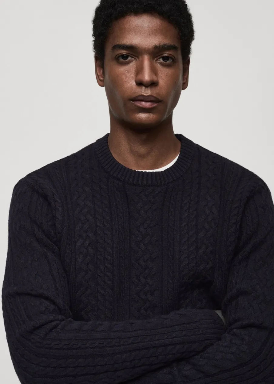 Durva kötésű anyag, fonott dizájn, kerek nyakkivágás, nyaknál, ujj végén és az alján bordázott, a modell testmagassága 185 cm és M-es méretet visel.