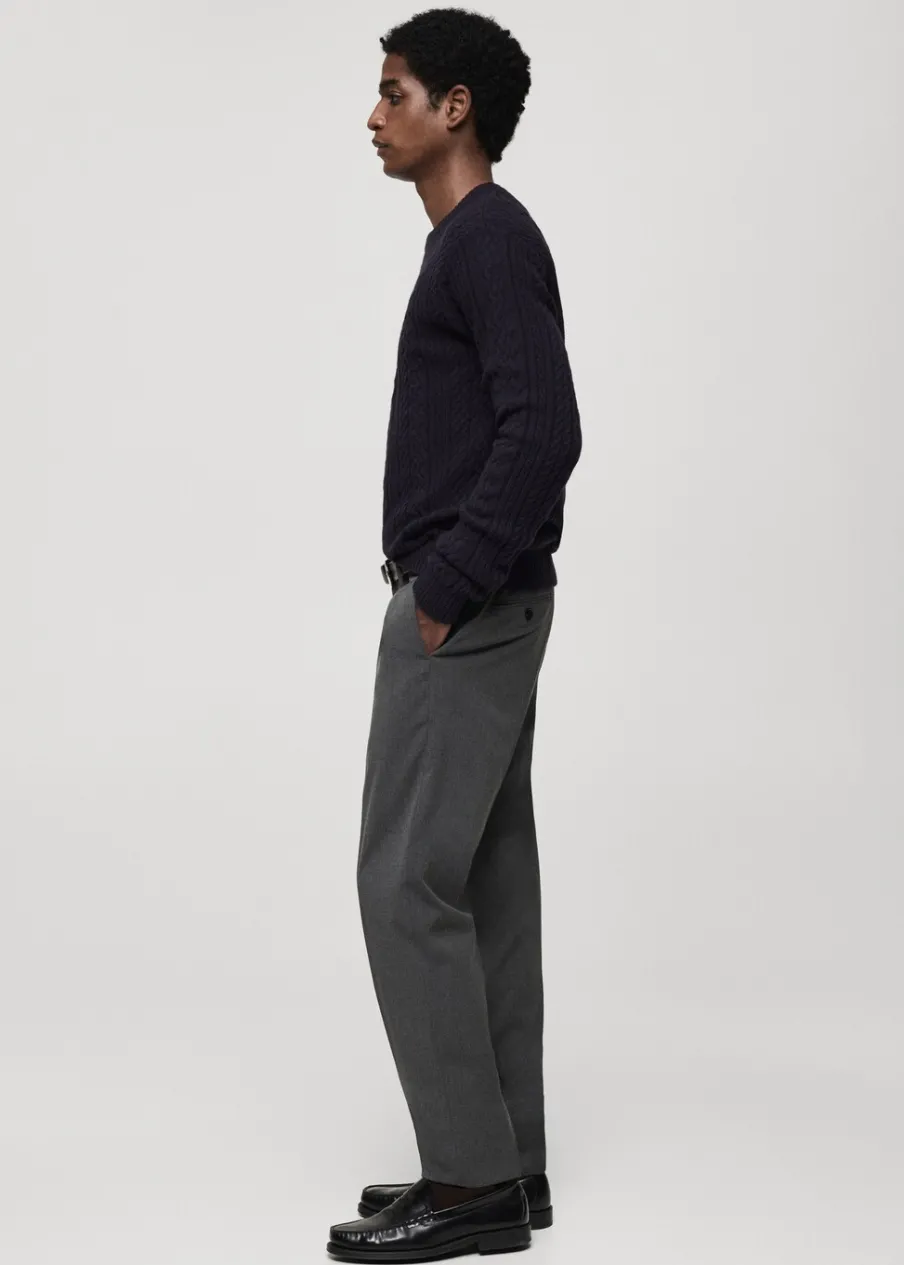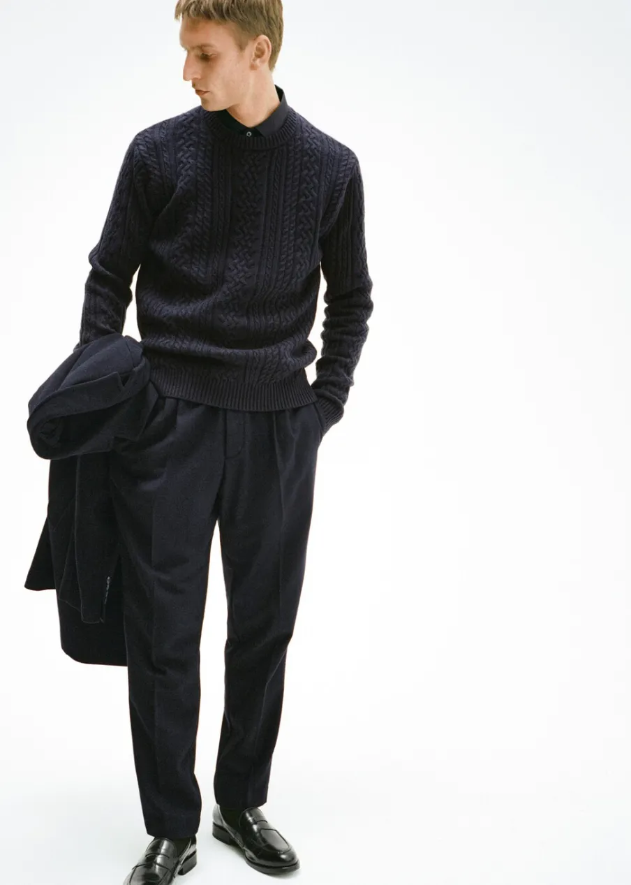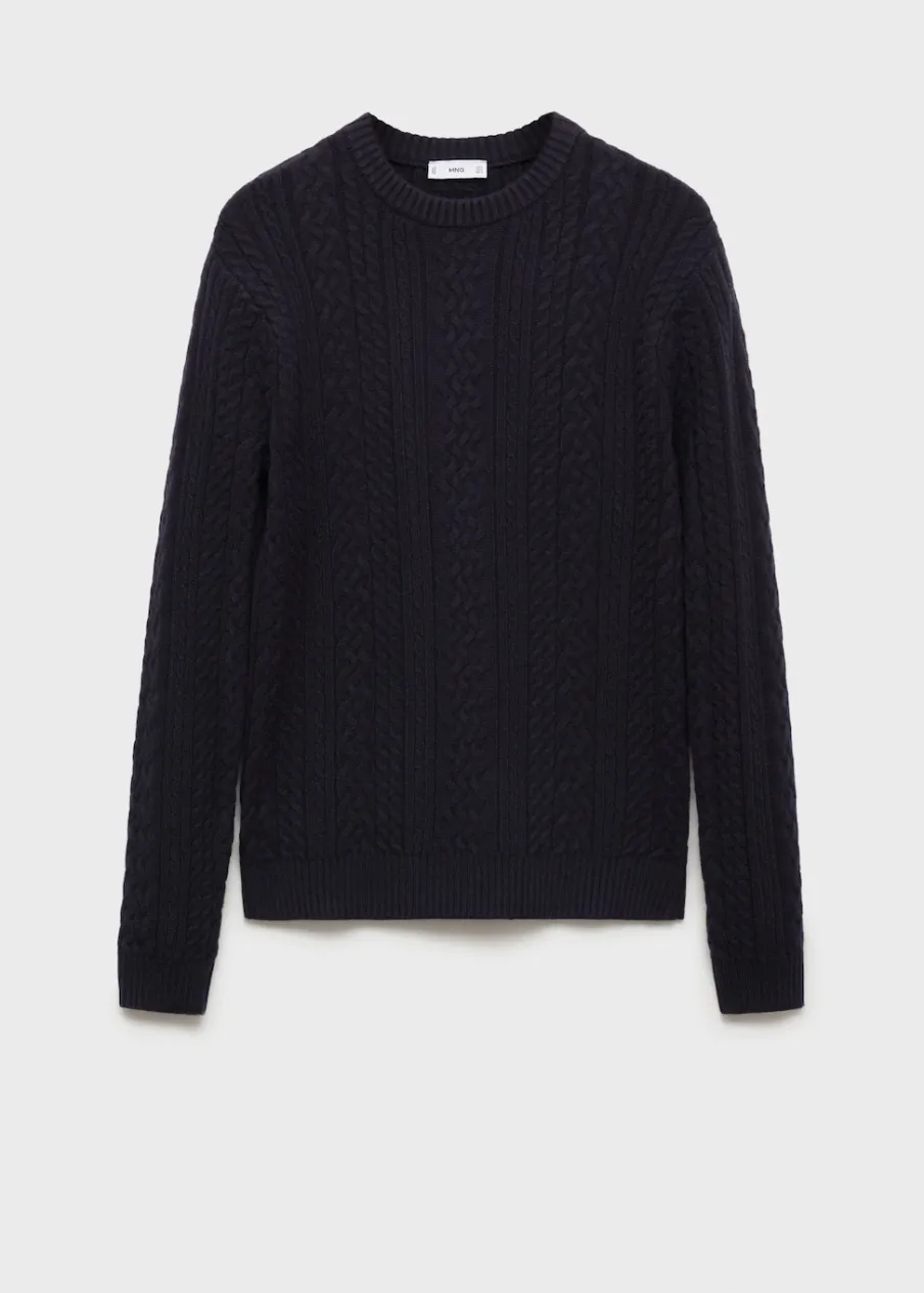 Durva kötésű anyag, fonott dizájn, kerek nyakkivágás, nyaknál, ujj végén és az alján bordázott, a modell testmagassága 185 cm és M-es méretet visel.