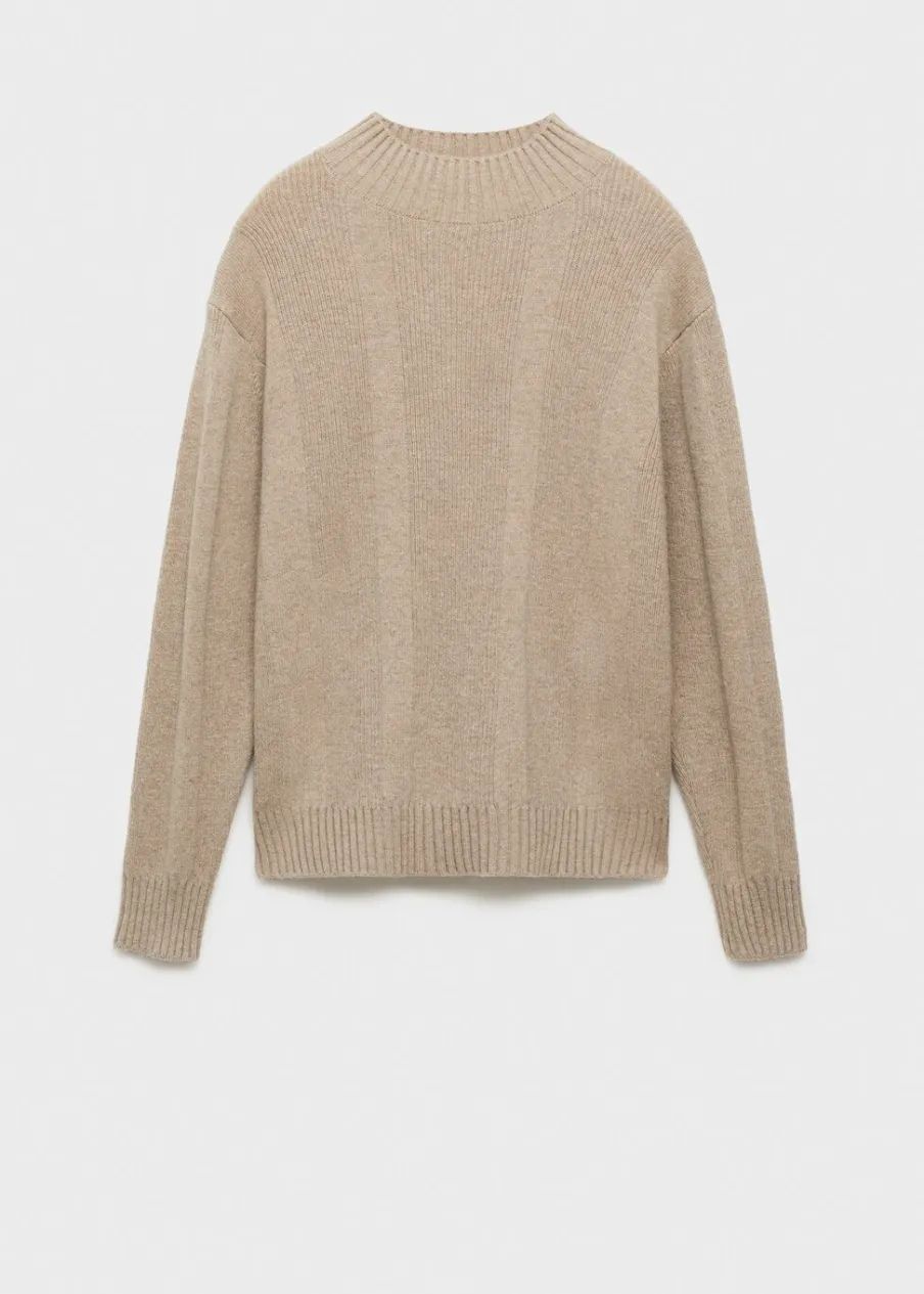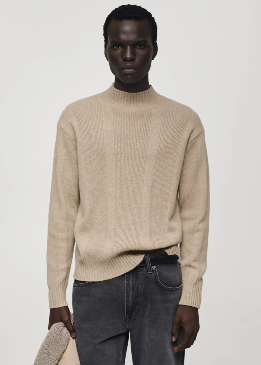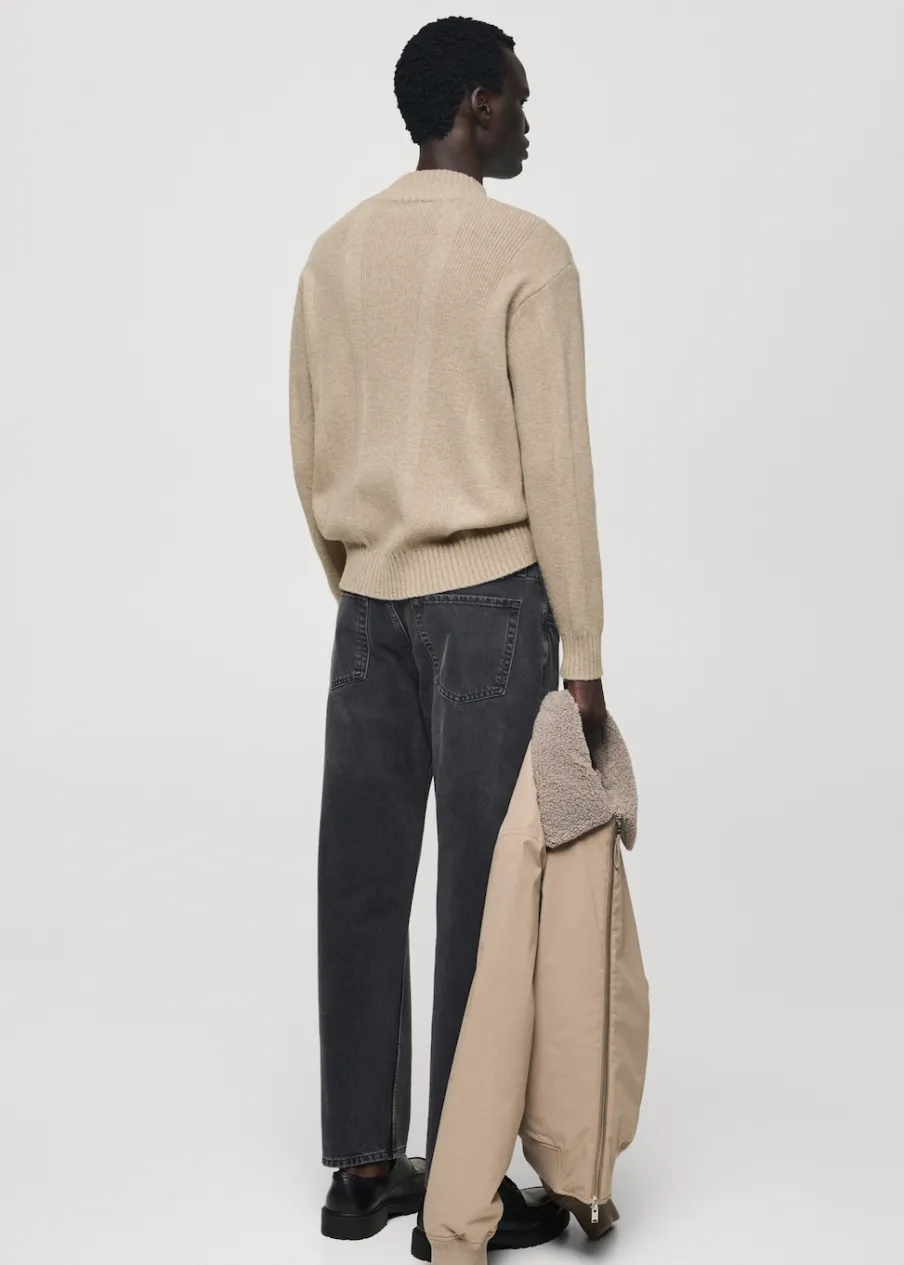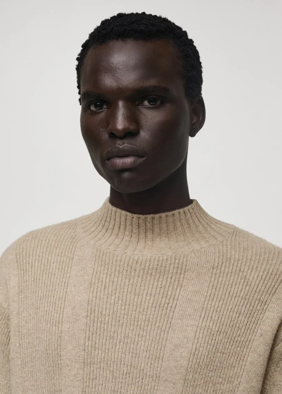 Krój regular. Wełniana tkanina. Dzianina strukturalna. Długi rękaw. Prążkowane wykończenie na dekolcie, rękawach i u dołu. Model ma 185 cm wzrostu i nosi rozmiar M.