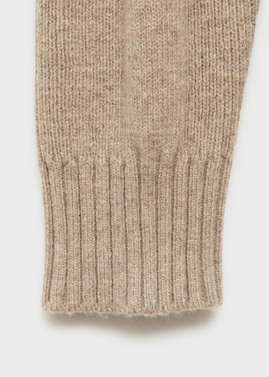 Regular fit, gyapjú anyag, strukturált kötött anyag, hosszú ujj, bordás végek a nyakon, az ujjakon és alul, a modell testmagassága 185 cm és M-es méretet visel.