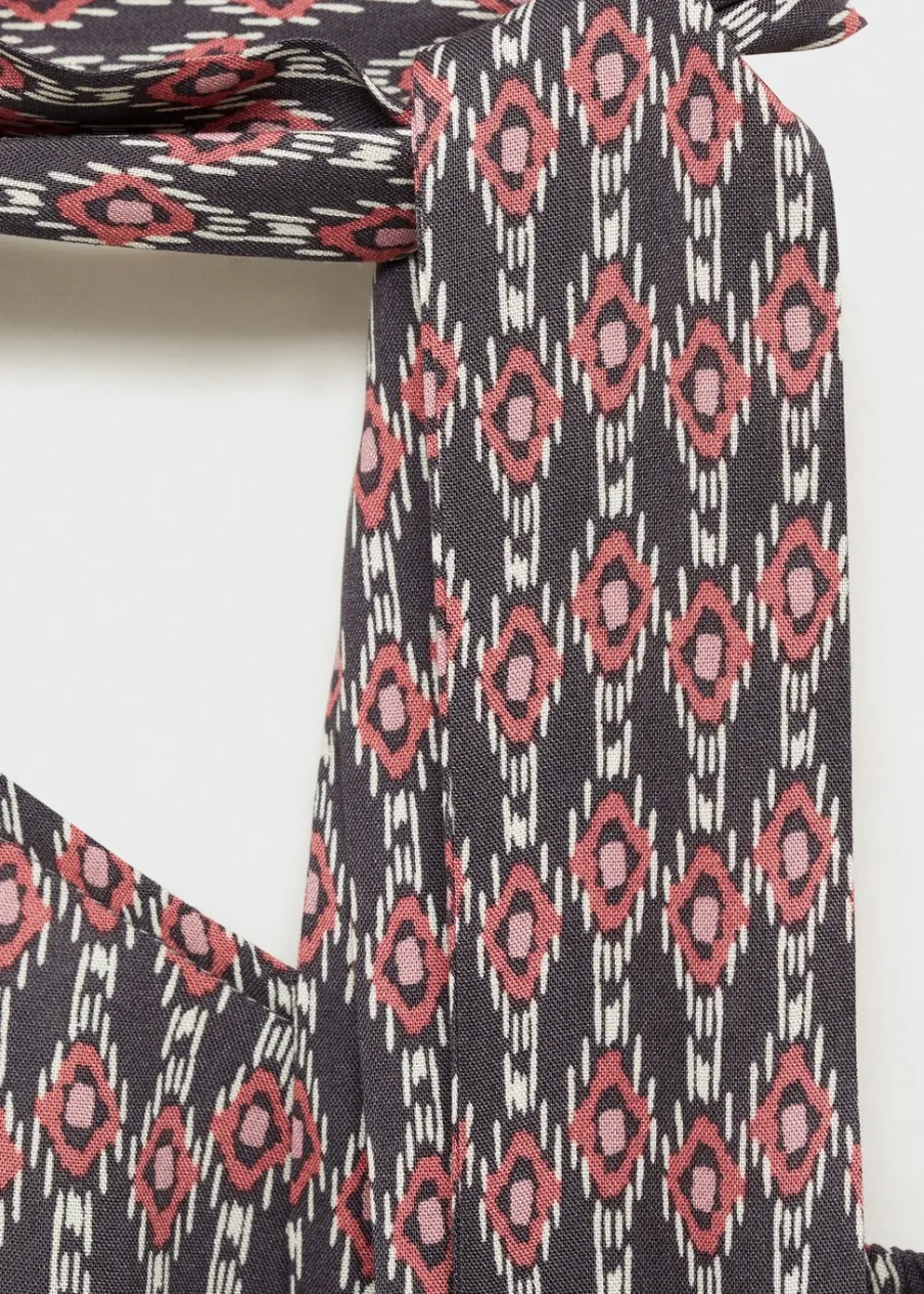 OpisGeometryczny wzór. Asymetryczny krój. Wiązanie przy szyi. Długi rękaw. Total look.