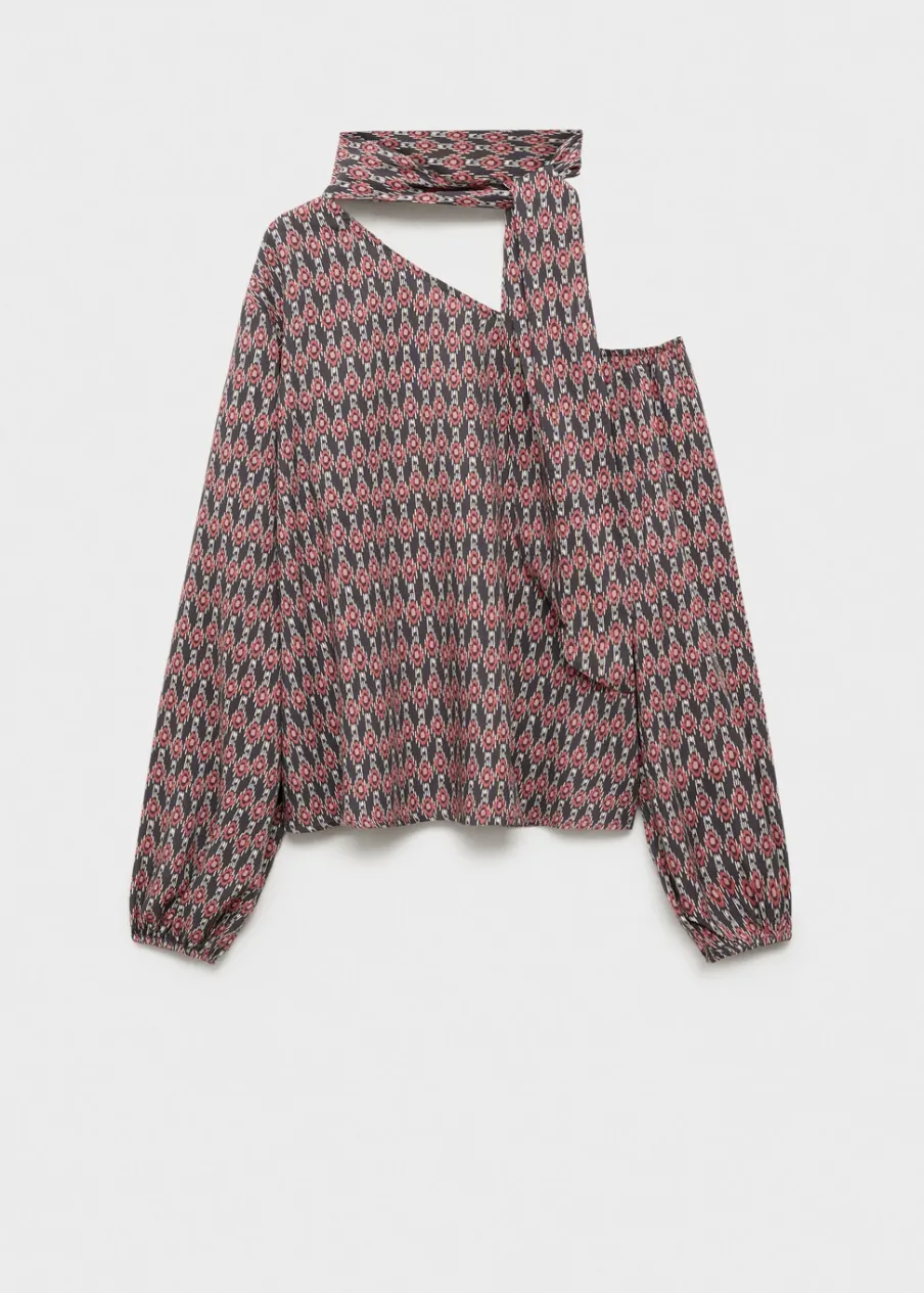 Geometryczny wzór. Asymetryczny krój. Wiązanie przy szyi. Długi rękaw. Total look.