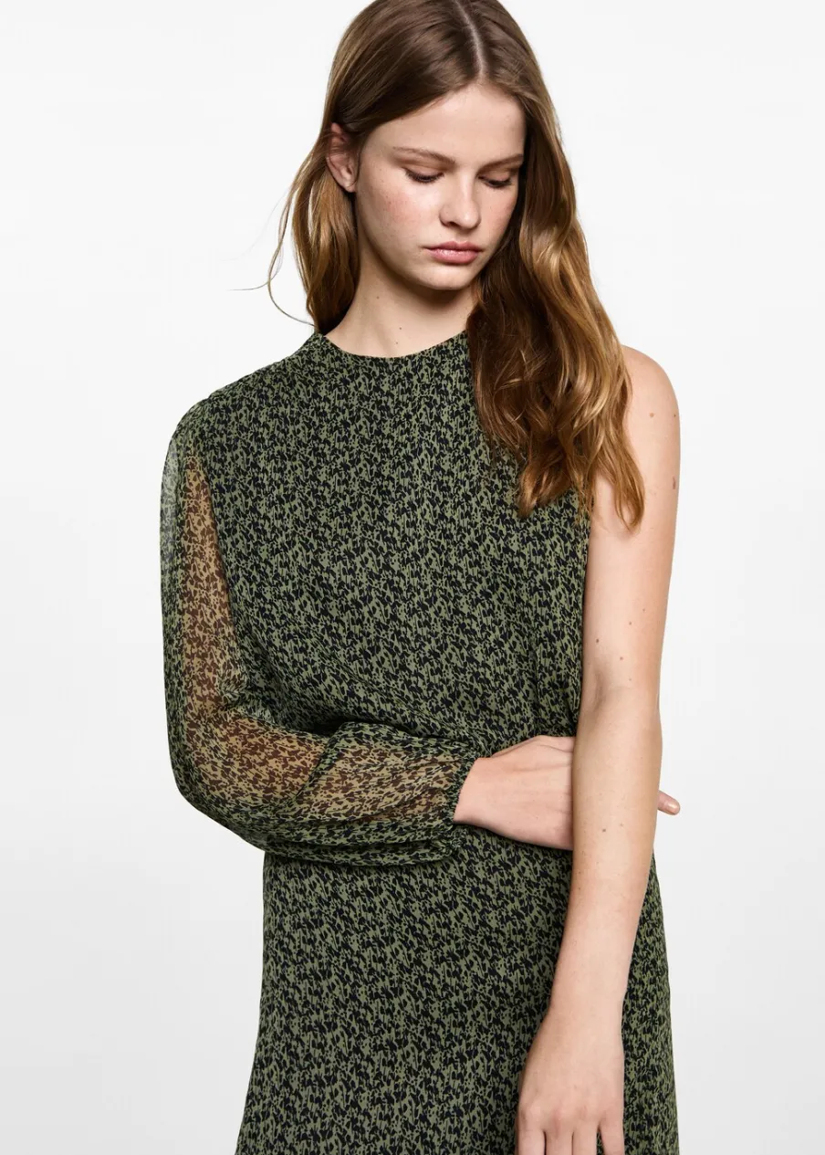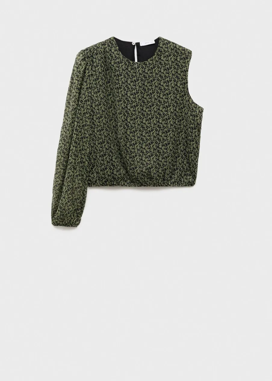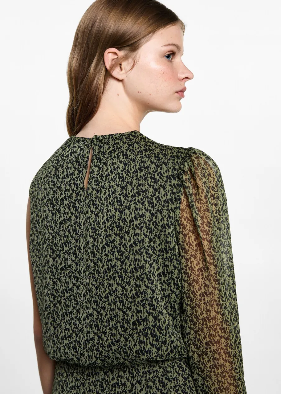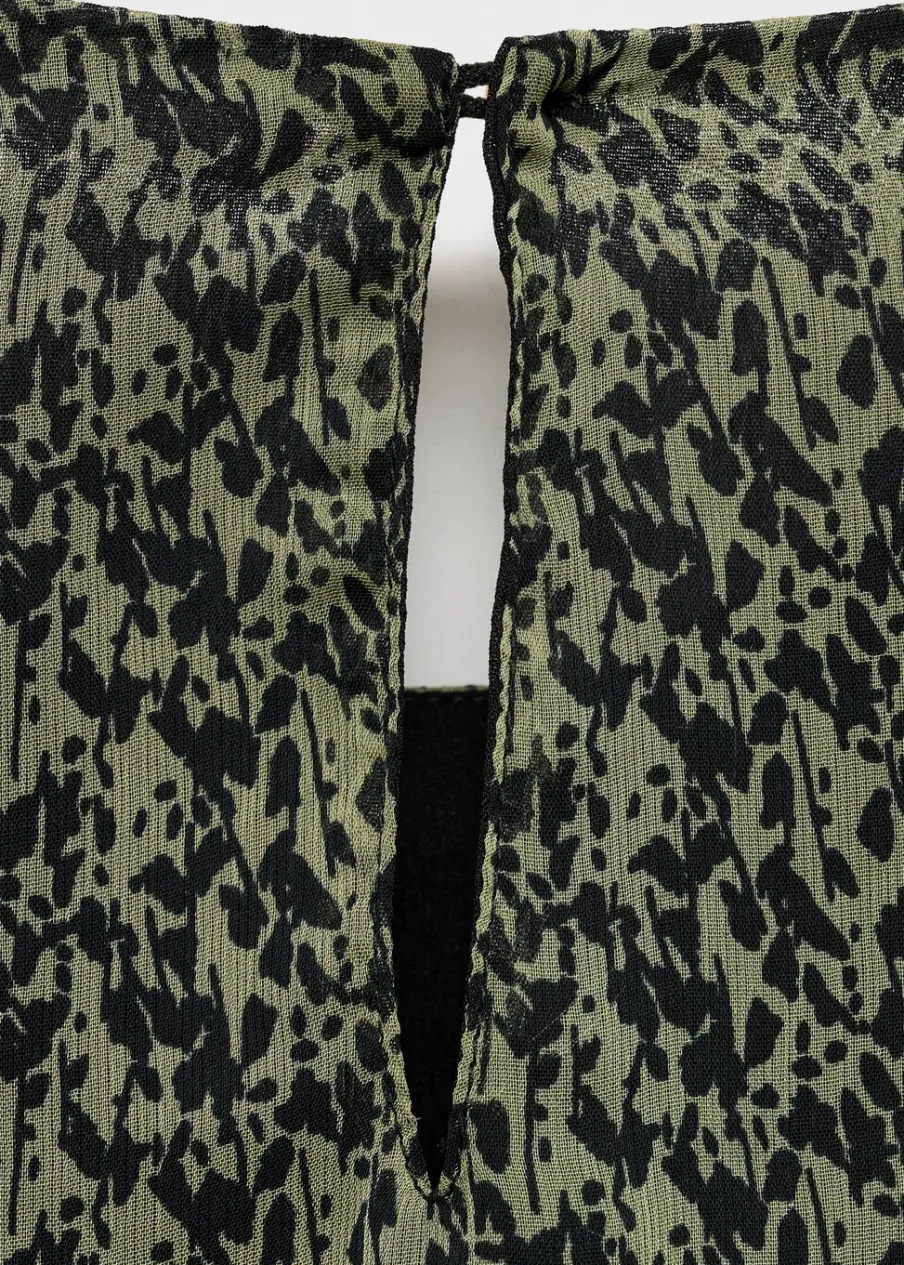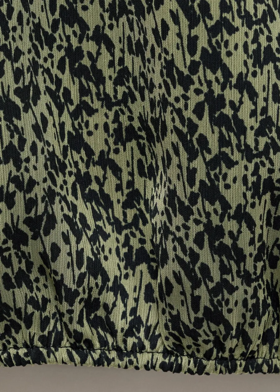 OpisLejąca tkanina. Abstrakcyjny wzór. Okrągły dekolt. Długi bufiasty rękaw. Elastyczne mankiety. Total look.