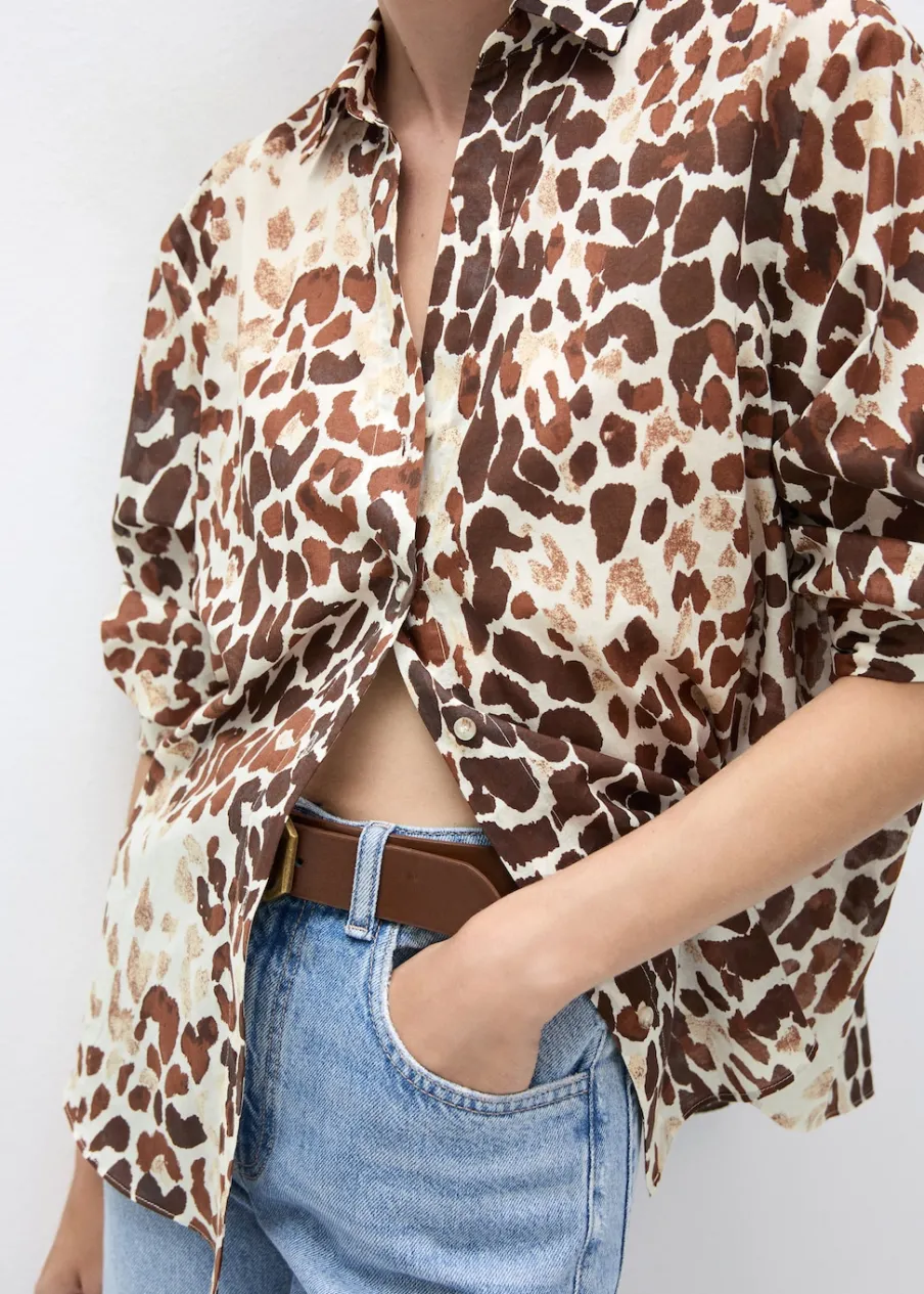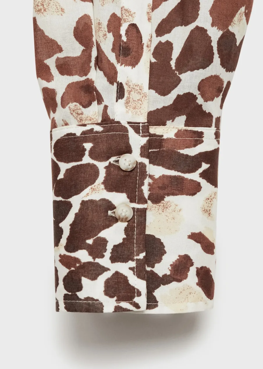Wzór w lamparcie cętki. Model prosty. Zwierzęcy wzór. Kwiatowy wzór. Koszulowy kołnierz. Długi rękaw z guzikami na mankietach. Zapięcie na guziki z przodu. Tkanina z 100% bawełny.