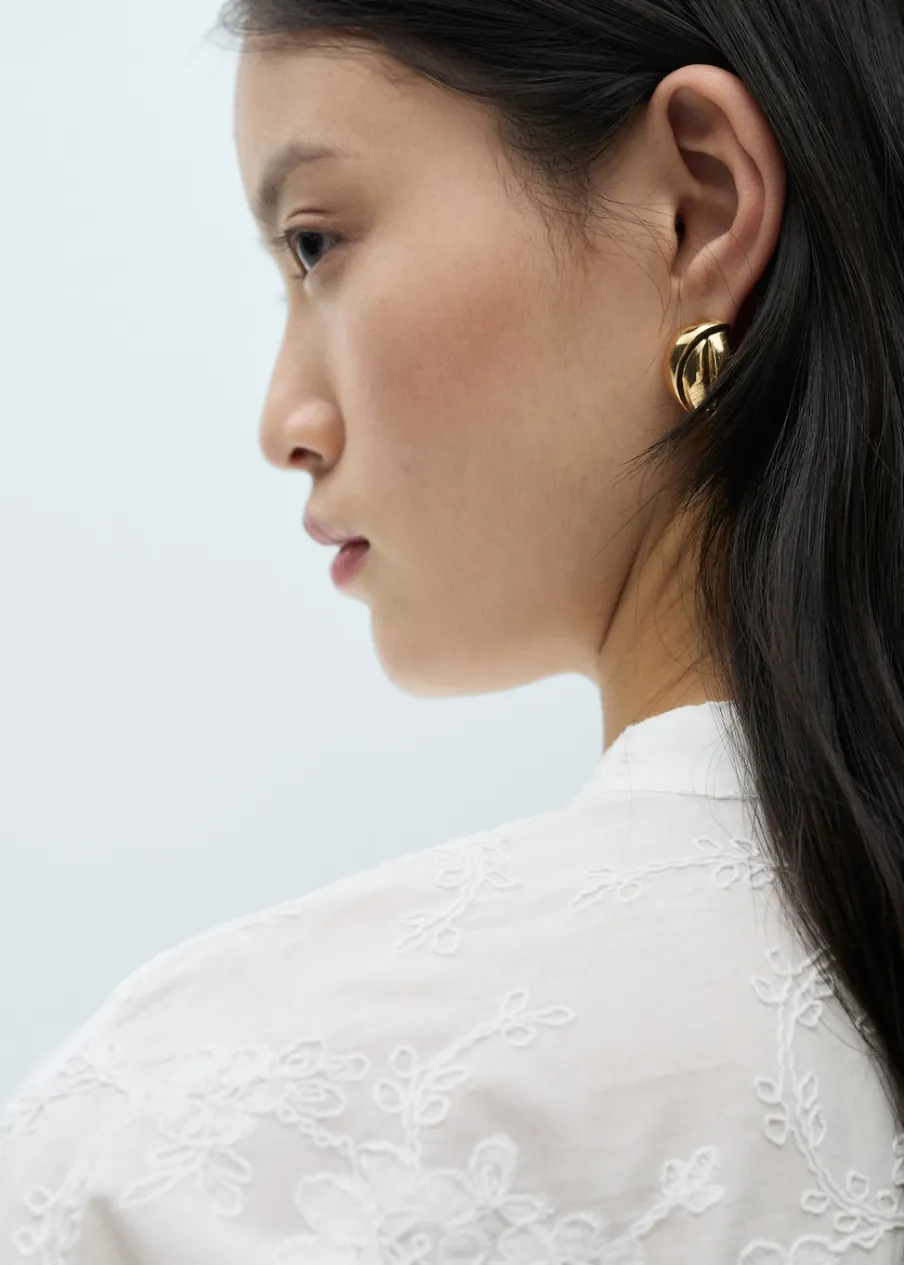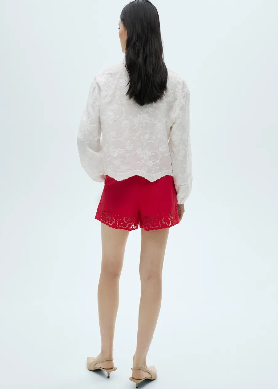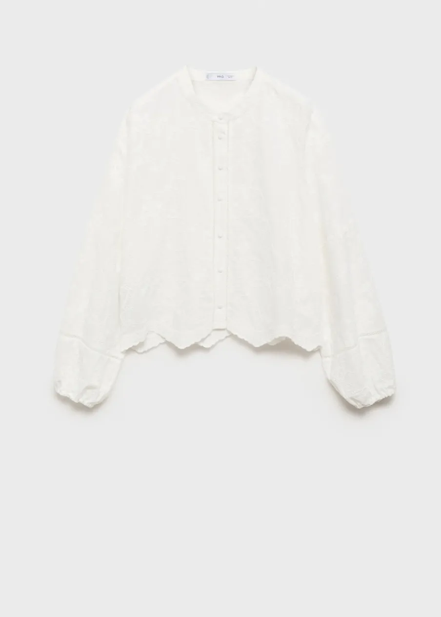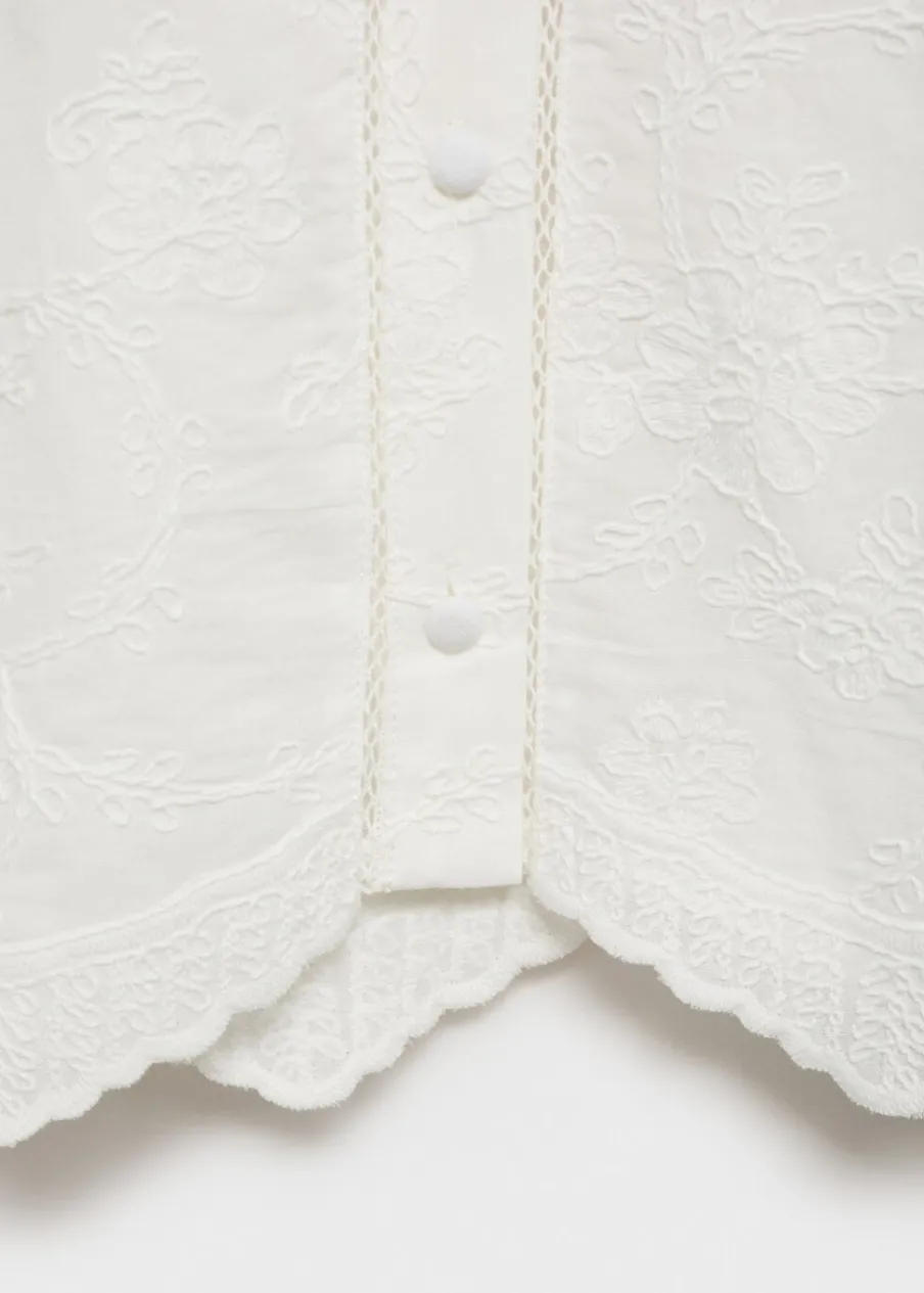 Tkanina z 100% bawełny. Model prosty. Haftowany motyw. Stójkowy kołnierzyk. Długi rękaw. Bufiasty rękaw ze ściągaczem. Zapięcie z przodu na guziki. Asymetryczne wykończenie.