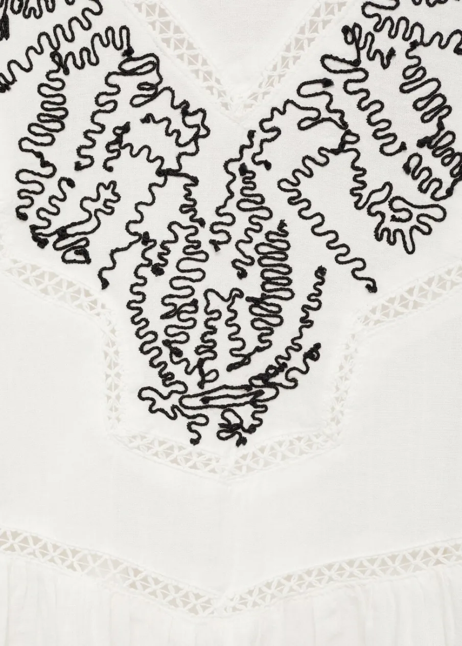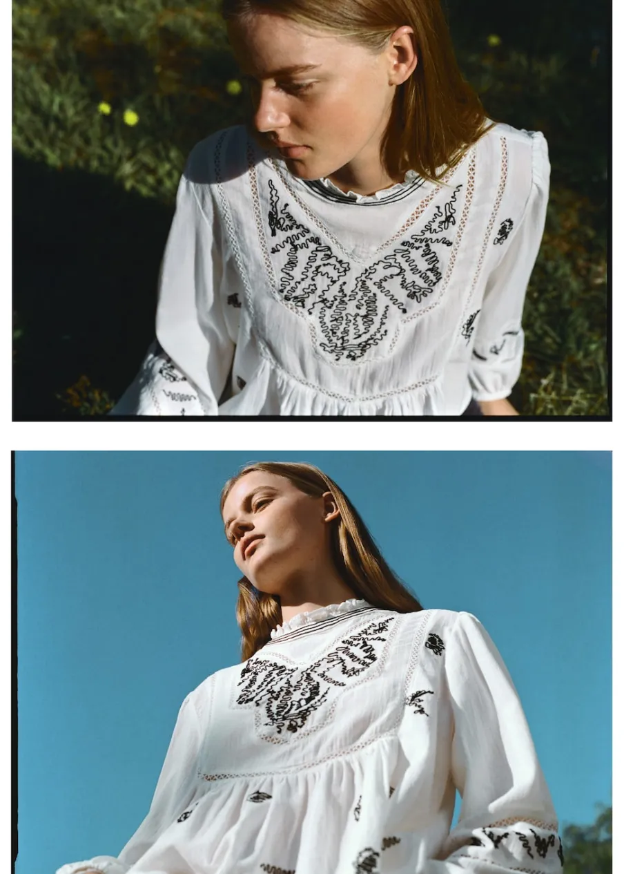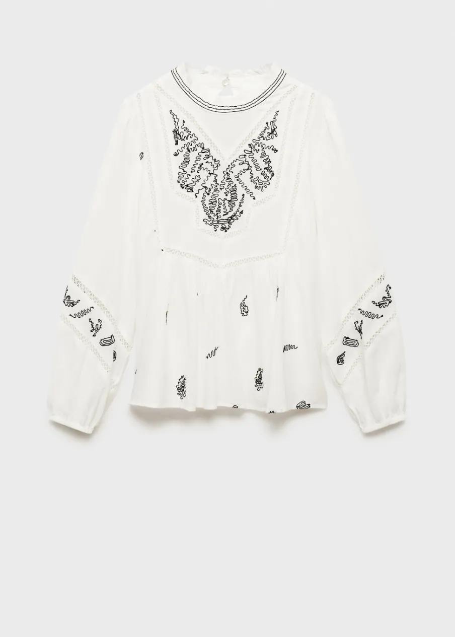 Bawełna 100%. Okrągły dekolt z falbanką. Długi rękaw. Marszczenie na mankiecie. Koronkowe elementy. Rozcięcie na plecach z zapięciem na guzik.