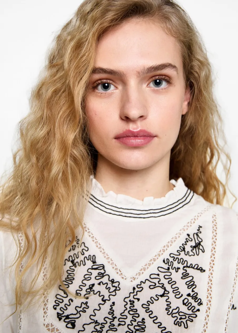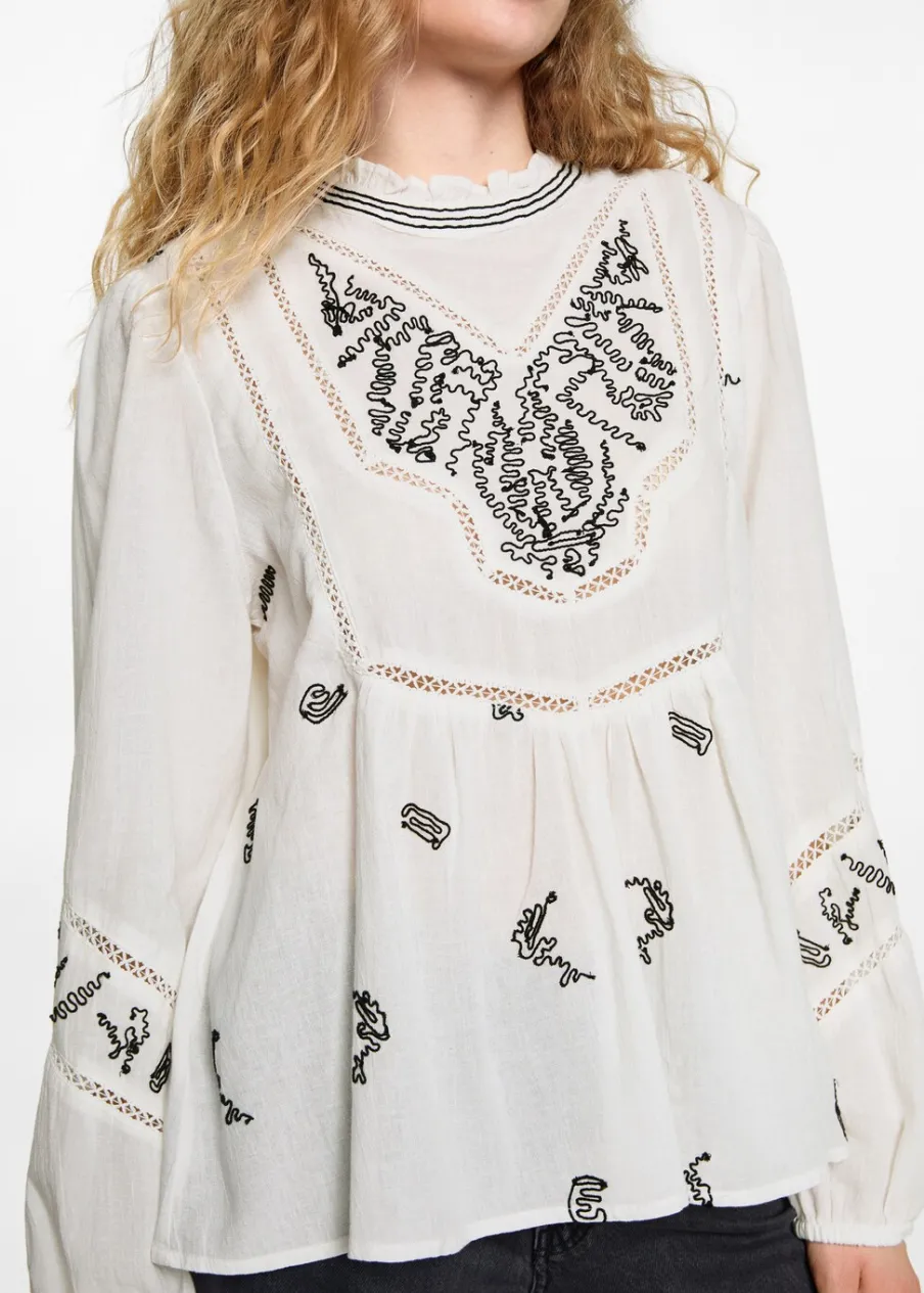 OpisBawełna 100%. Okrągły dekolt z falbanką. Długi rękaw. Marszczenie na mankiecie. Koronkowe elementy. Rozcięcie…
