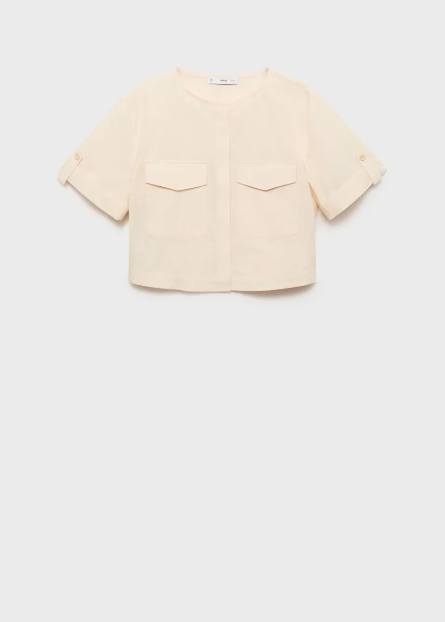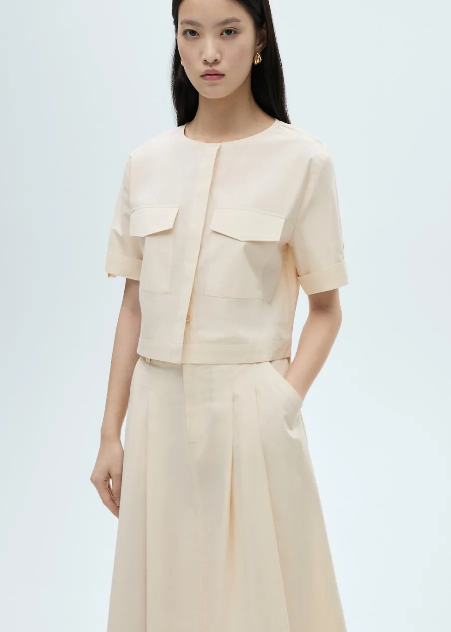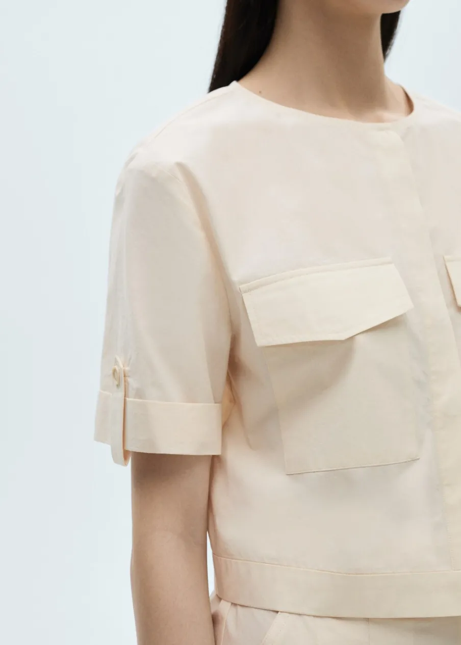 Bawełna 100%. Cienka tkanina. Deseń crop. Model prosty. Okrągły dekolt. Krótki, wywinięty rękaw. Kryte zapięcie na guziki. Zapięcie z przodu na guziki. Dwie kieszenie z patkami z przodu.