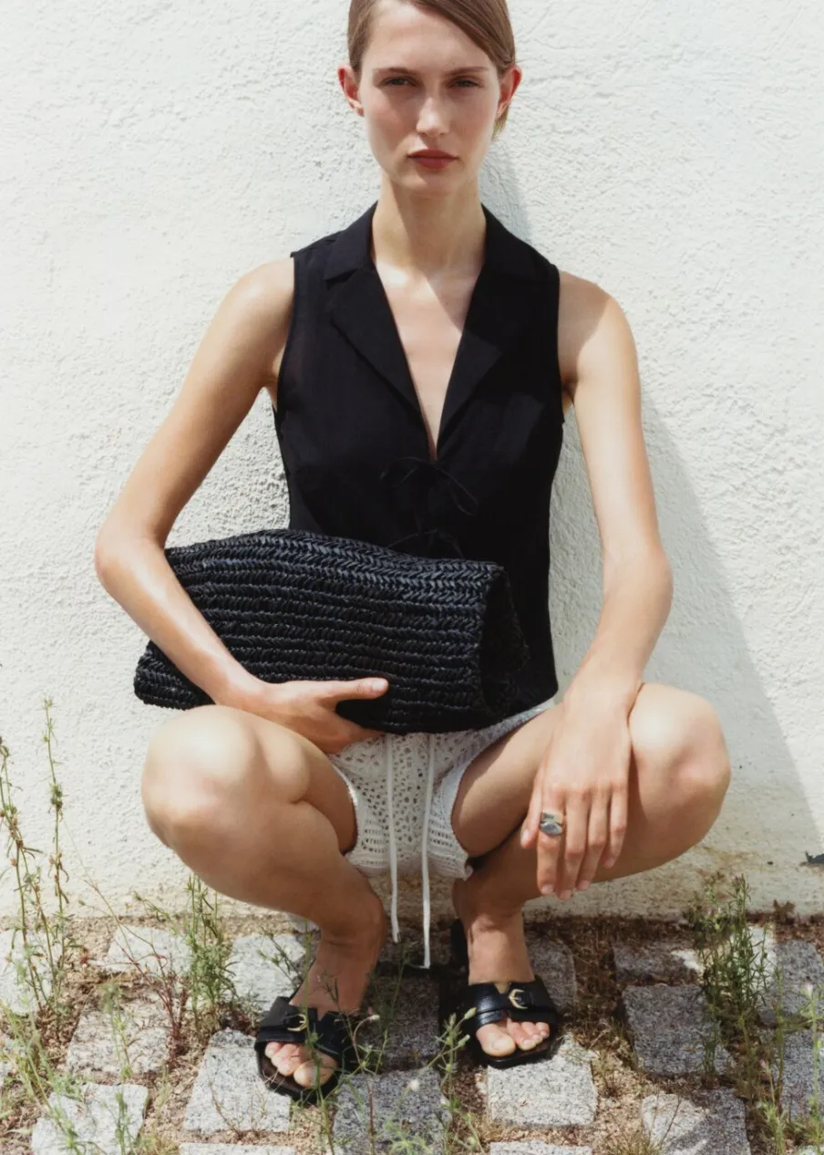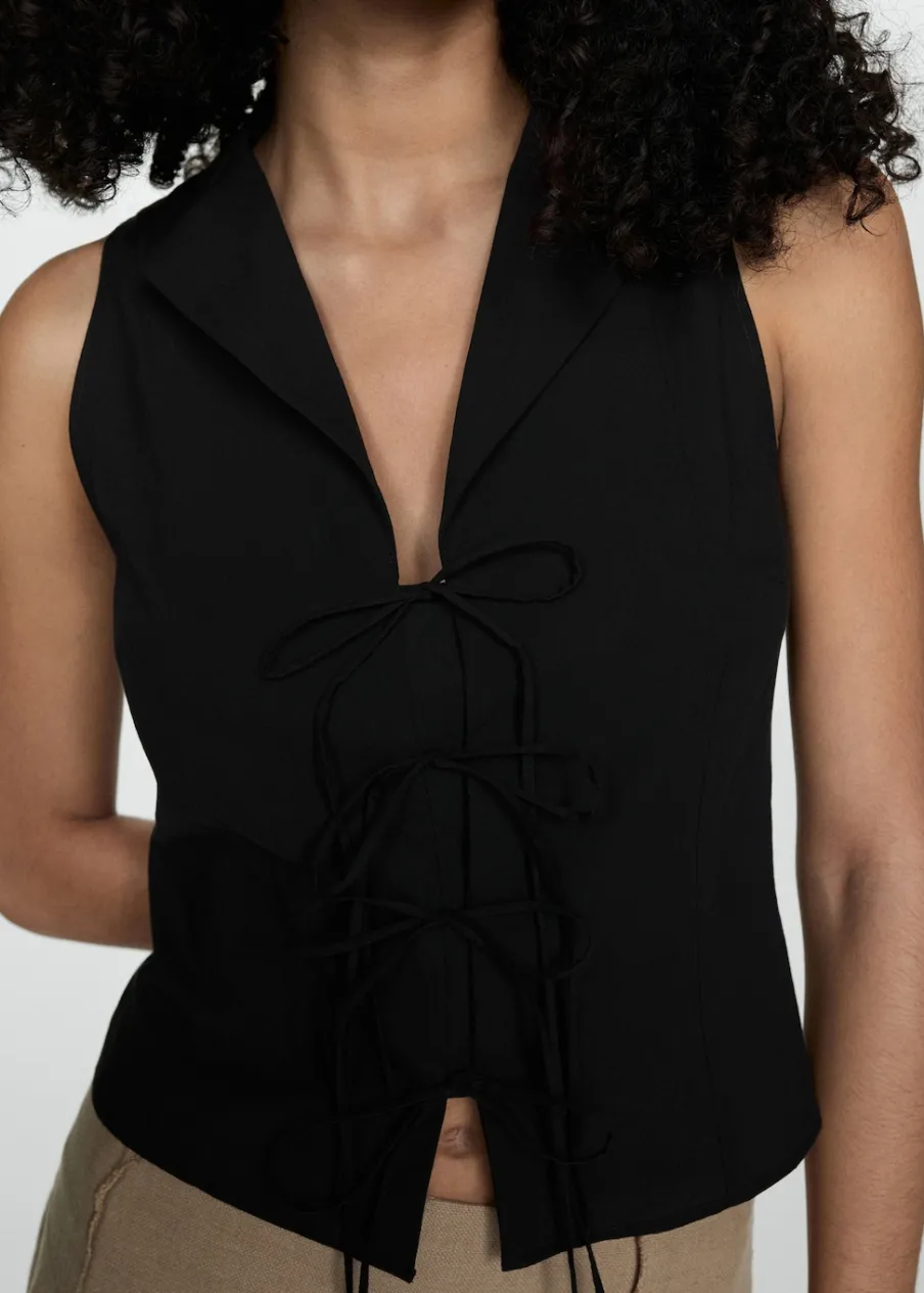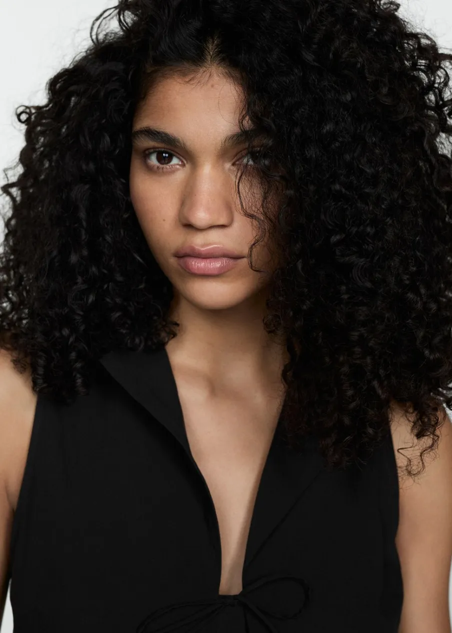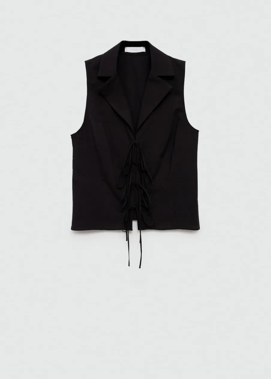 Model prosty. Koszulowy kołnierz. Bez rękawów. Wiązanie z przodu. Tkanina z 100% bawełny.