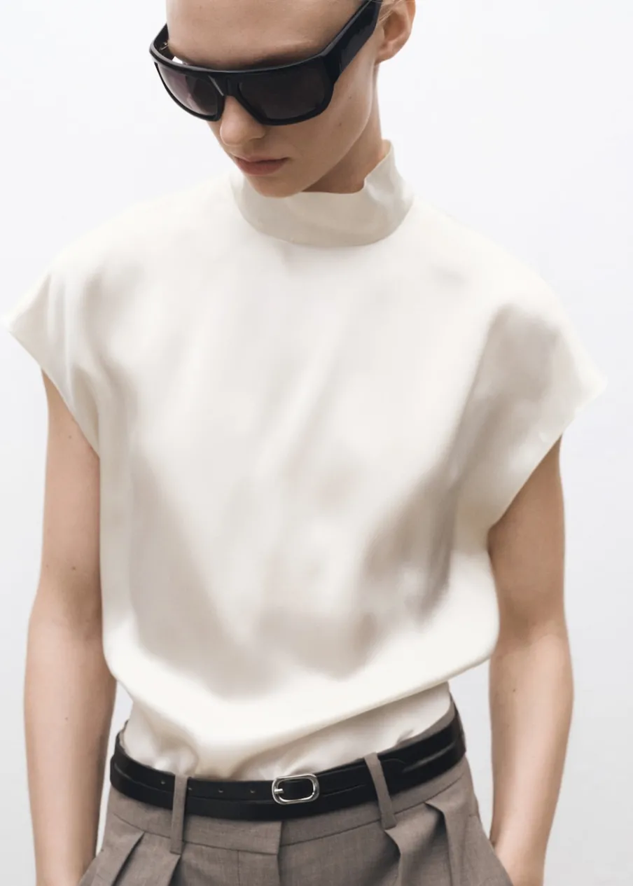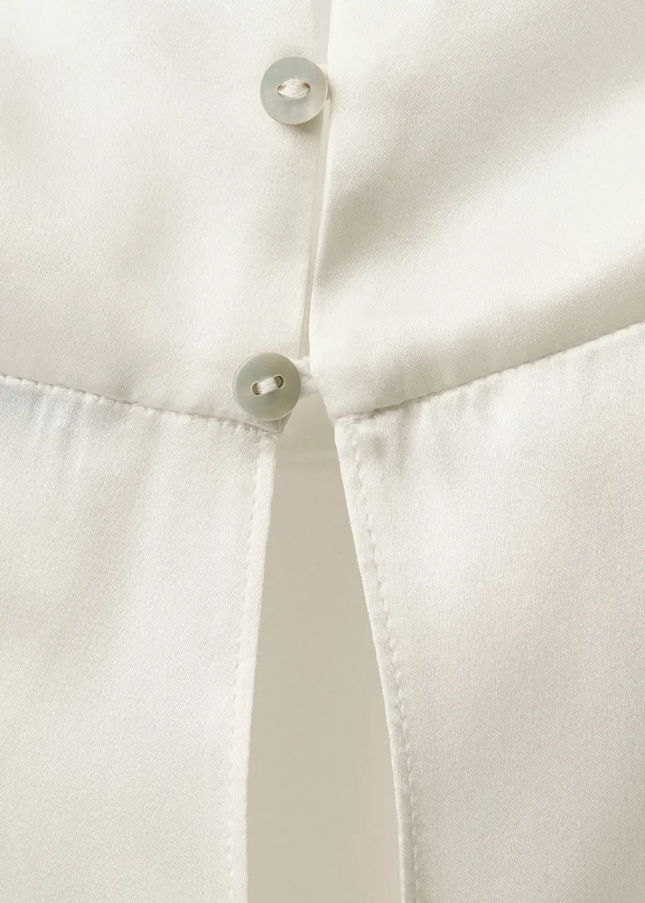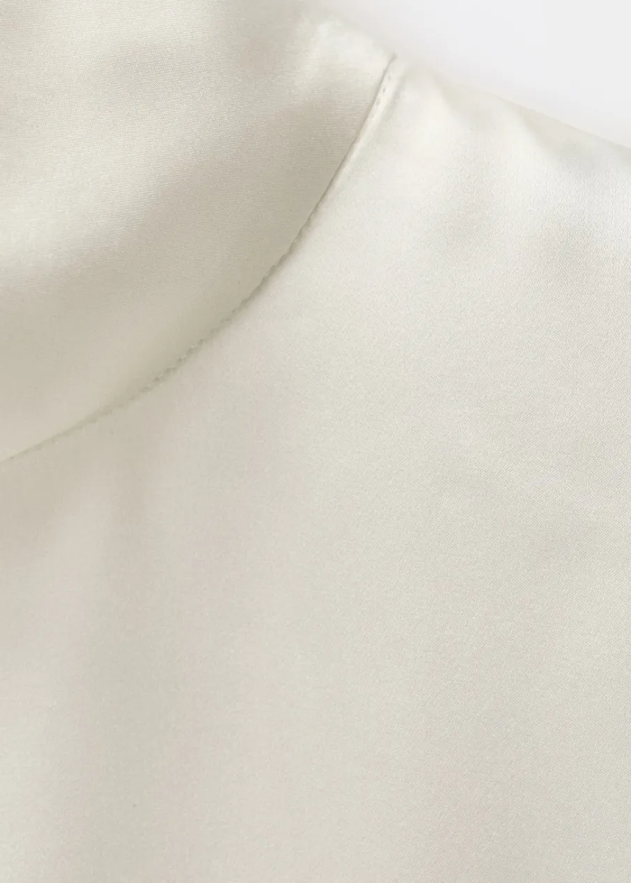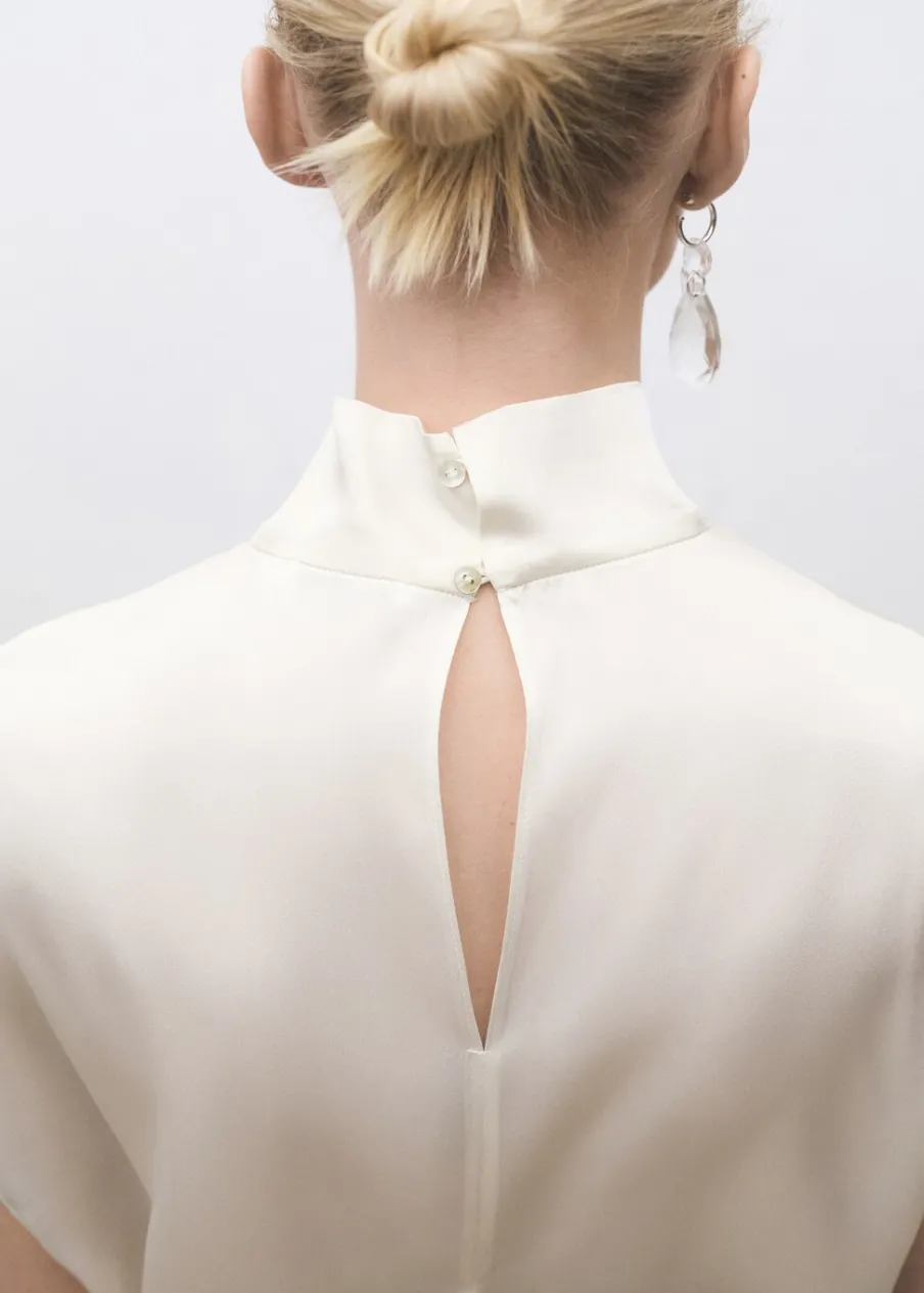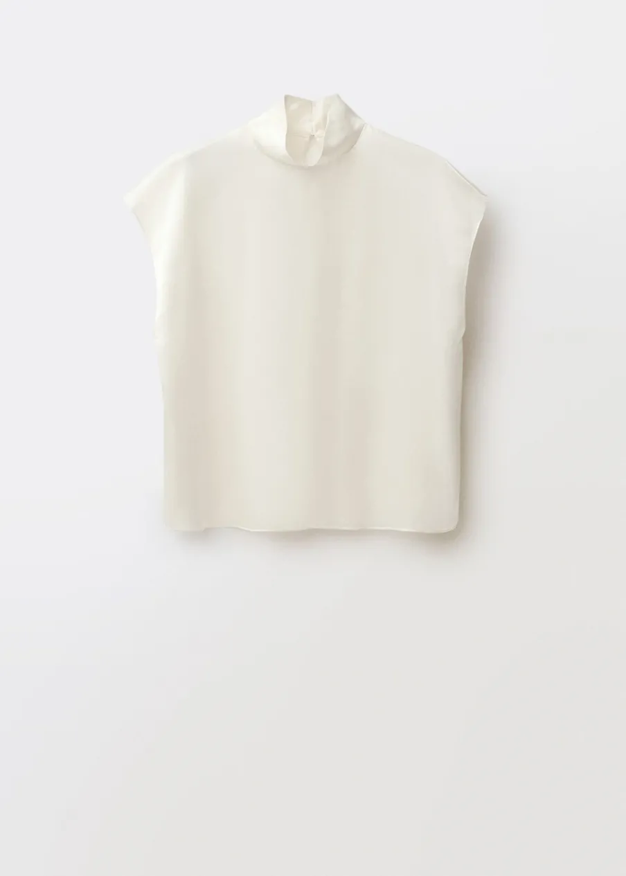 Tkanina 100% jedwab morwowy. Lejąca tkanina z satynowym wykończeniem. Model prosty. Golf. Bez rękawów. Zapięcie z tyłu na guziki. Kolekcja Selection.