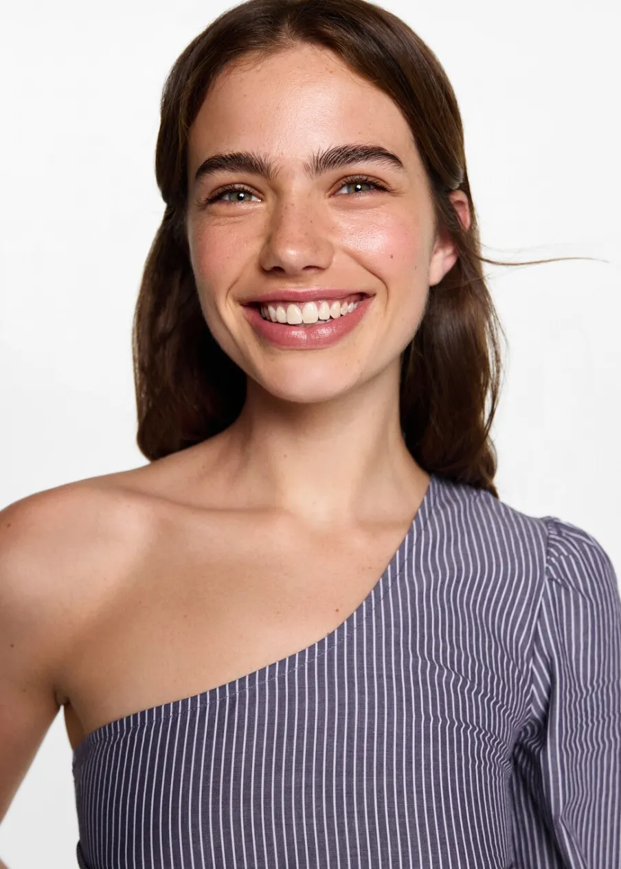 Opis100% bomull. Model prosty. Krótki krój. Wzór w pasy. Detal z zakładkami. Asymetryczny krój. Deseń crop. Buf…