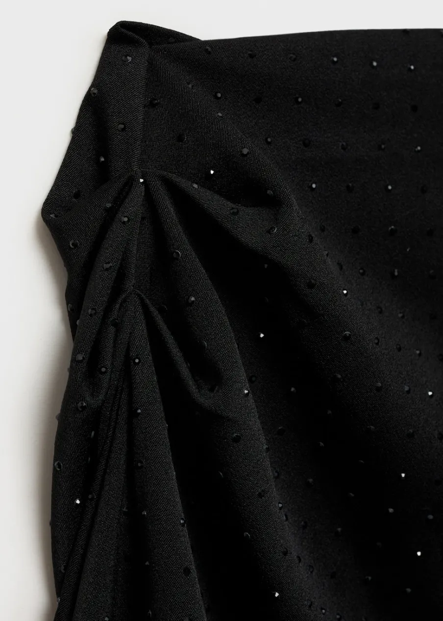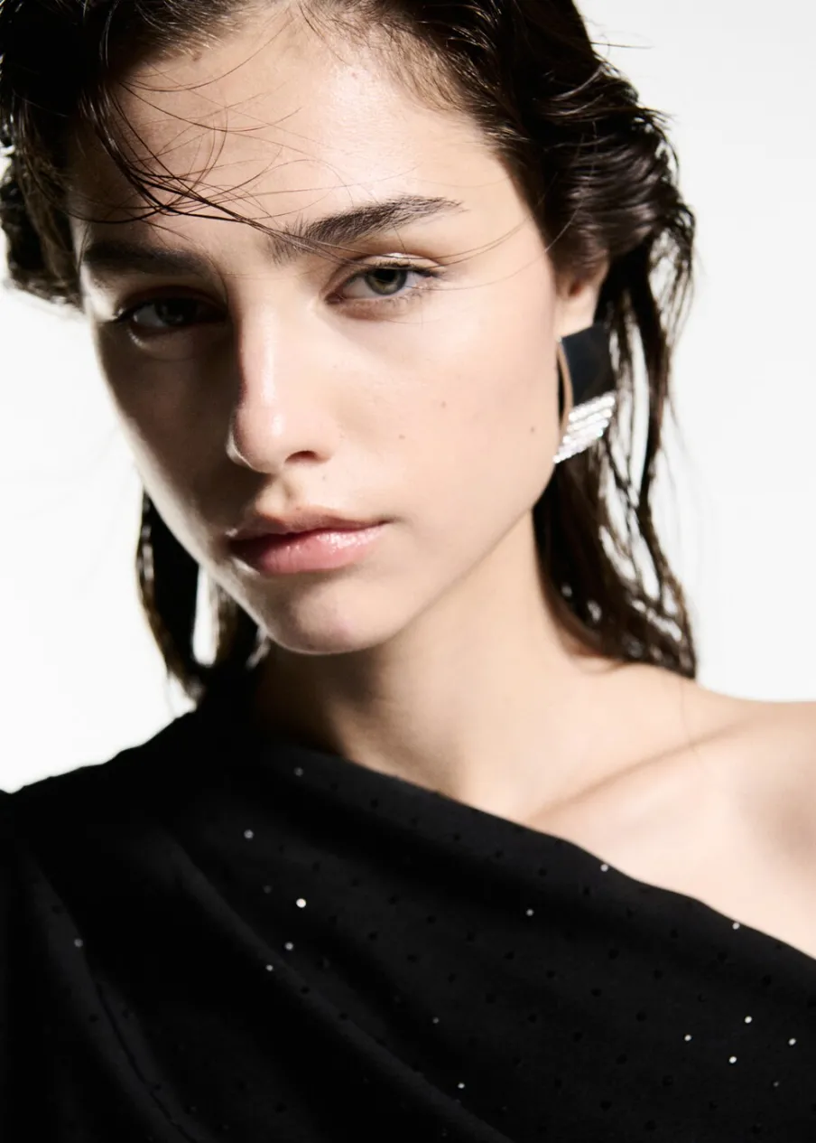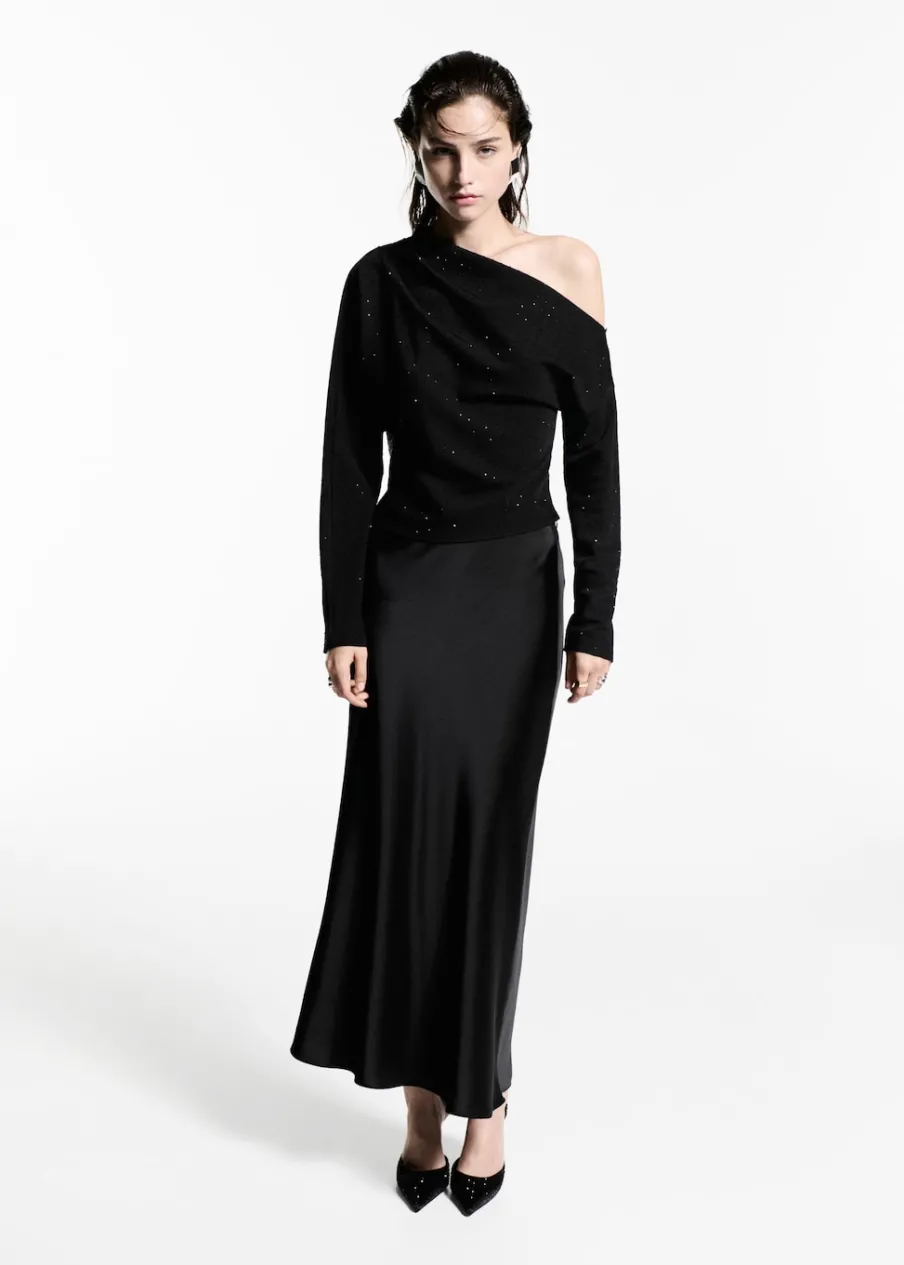 Tkanina z cekinami. Asymetryczny krój. Fason z odkrytymi ramionami. Model wcięty. Asymetryczny dekolt. Długi rękaw. Marszczony detal. Zapięcie na zamek z boku. Modelka ma 177 cm wzrostu i nosi rozmiar S/36. Kolekcja wizytowa.