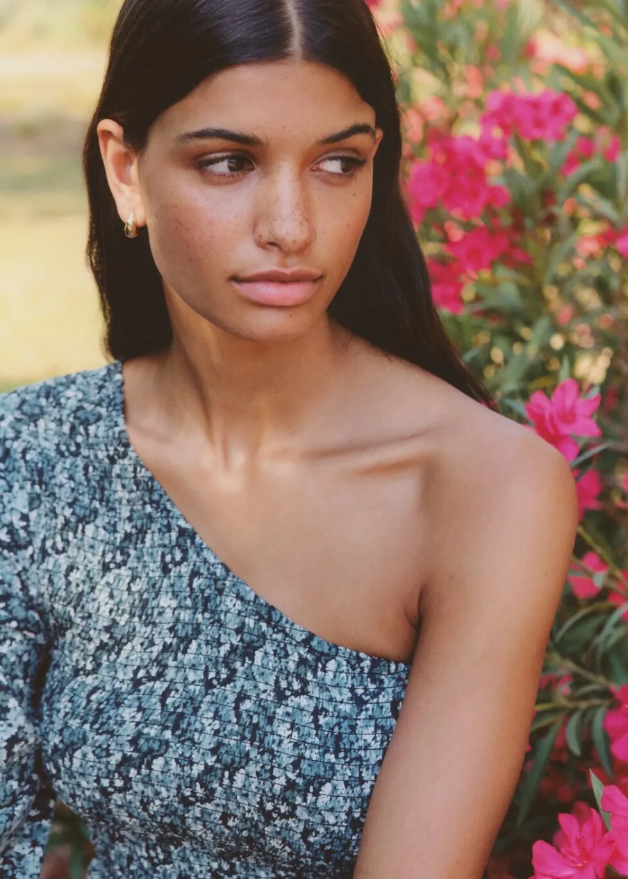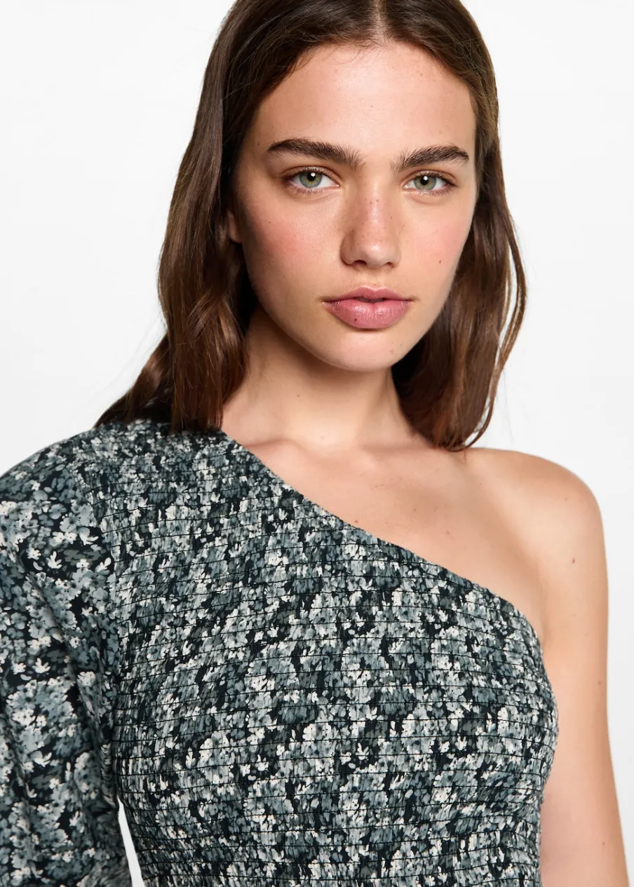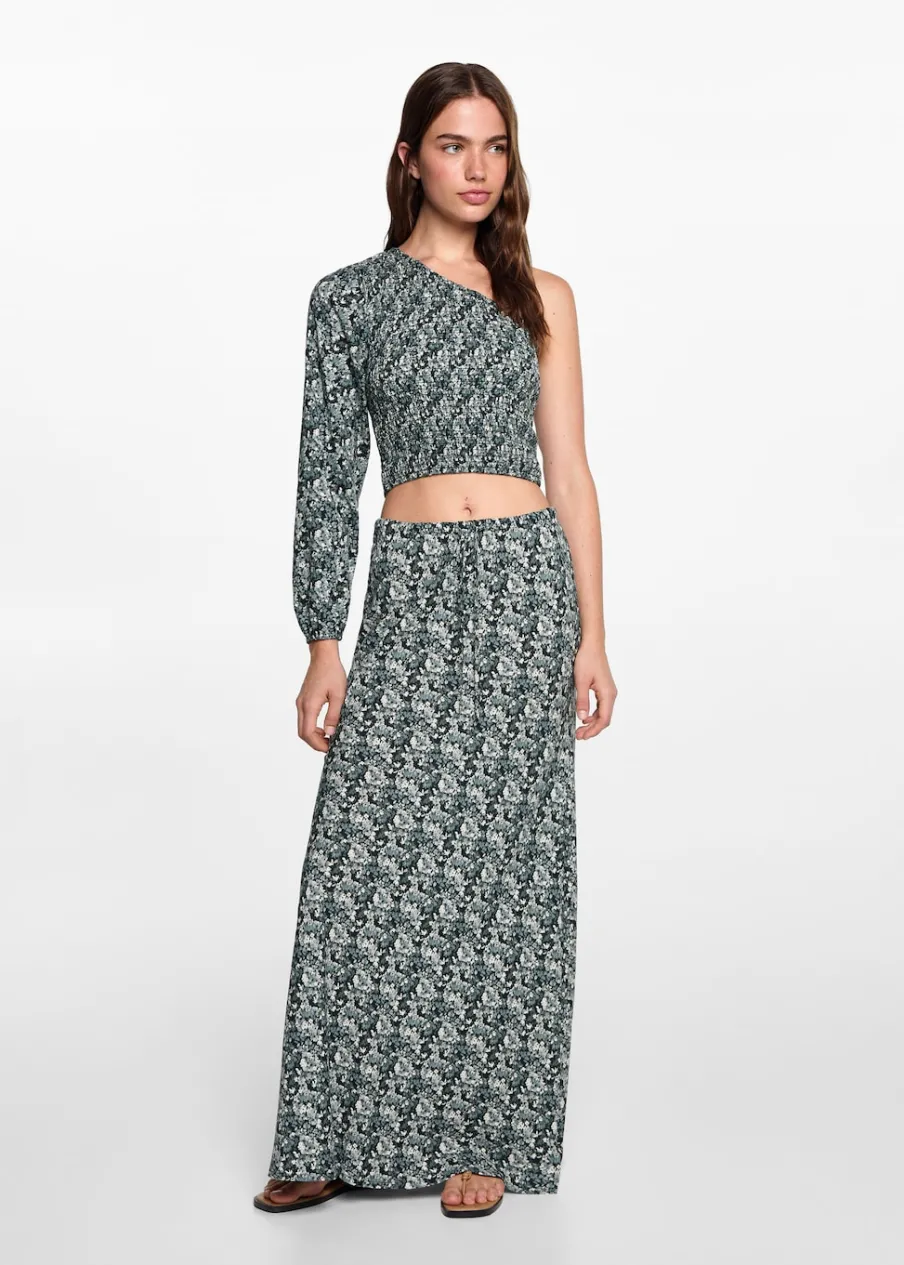 Asymetryczny krój. Kwiatowy wzór. Ozdobne marszczenie. Długi rękaw. Dostępny zestaw total look. Modelka ma 172 cm wzrostu i nosi rozmiar M. Nadruk. Tkanina z wiskozy.