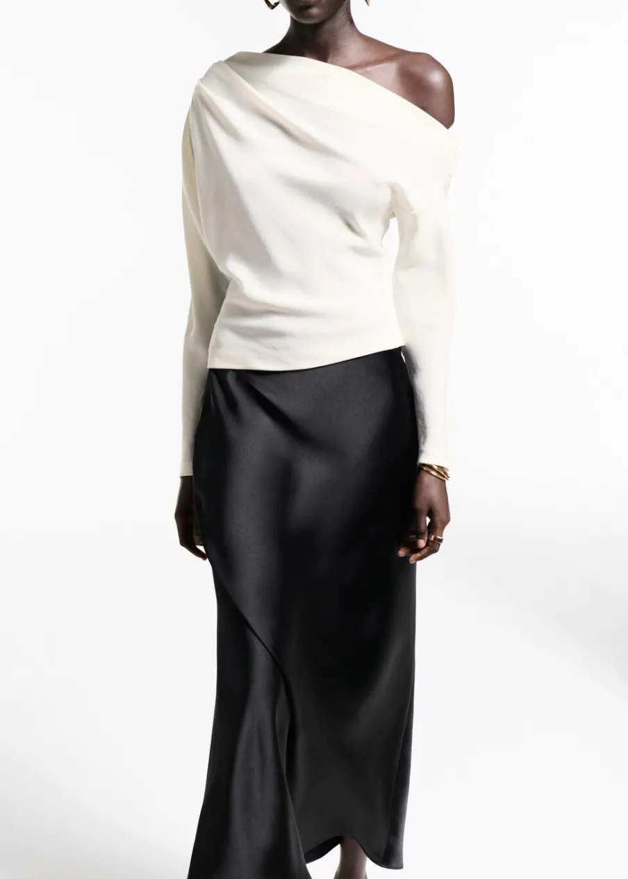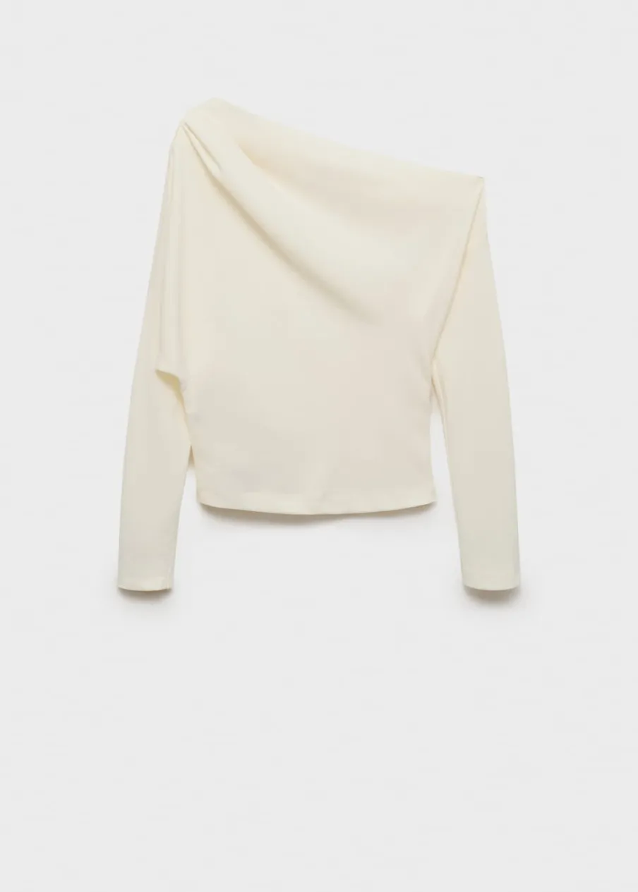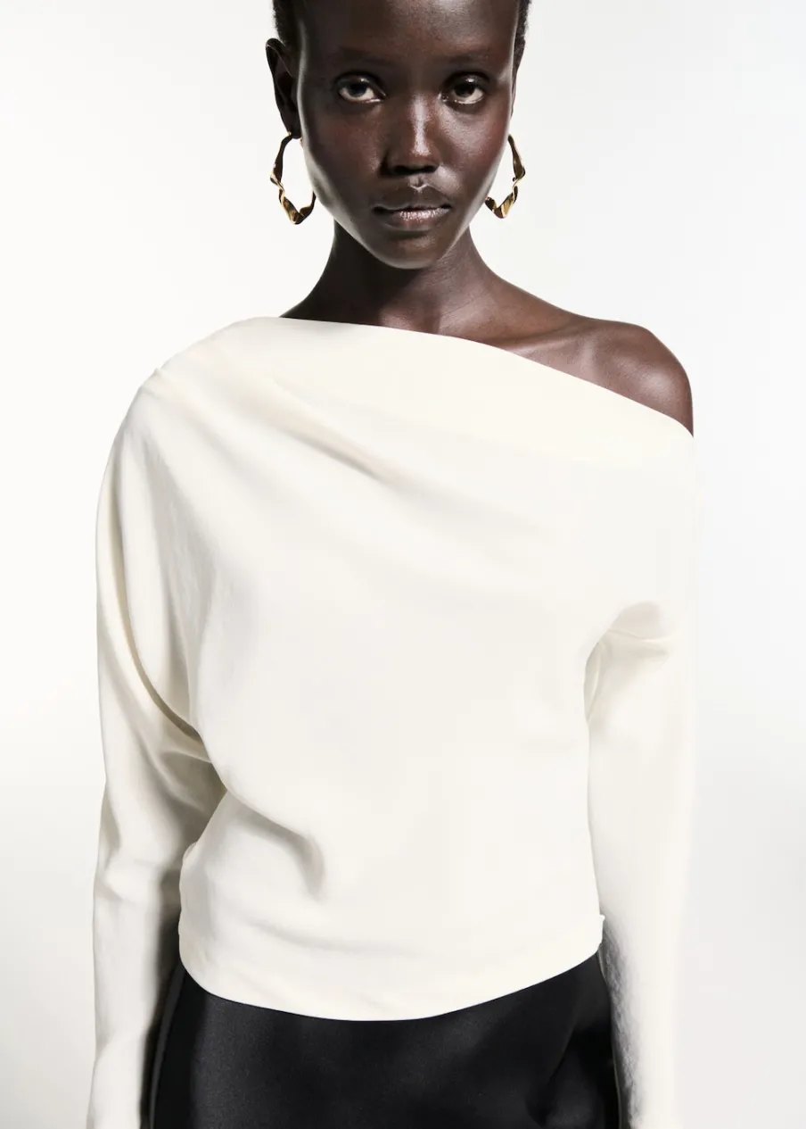 OpisAsymetryczny krój. Model wcięty. Fason z odkrytymi ramionami. Asymetryczny dekolt. Długi rękaw. Marszczony detal…
