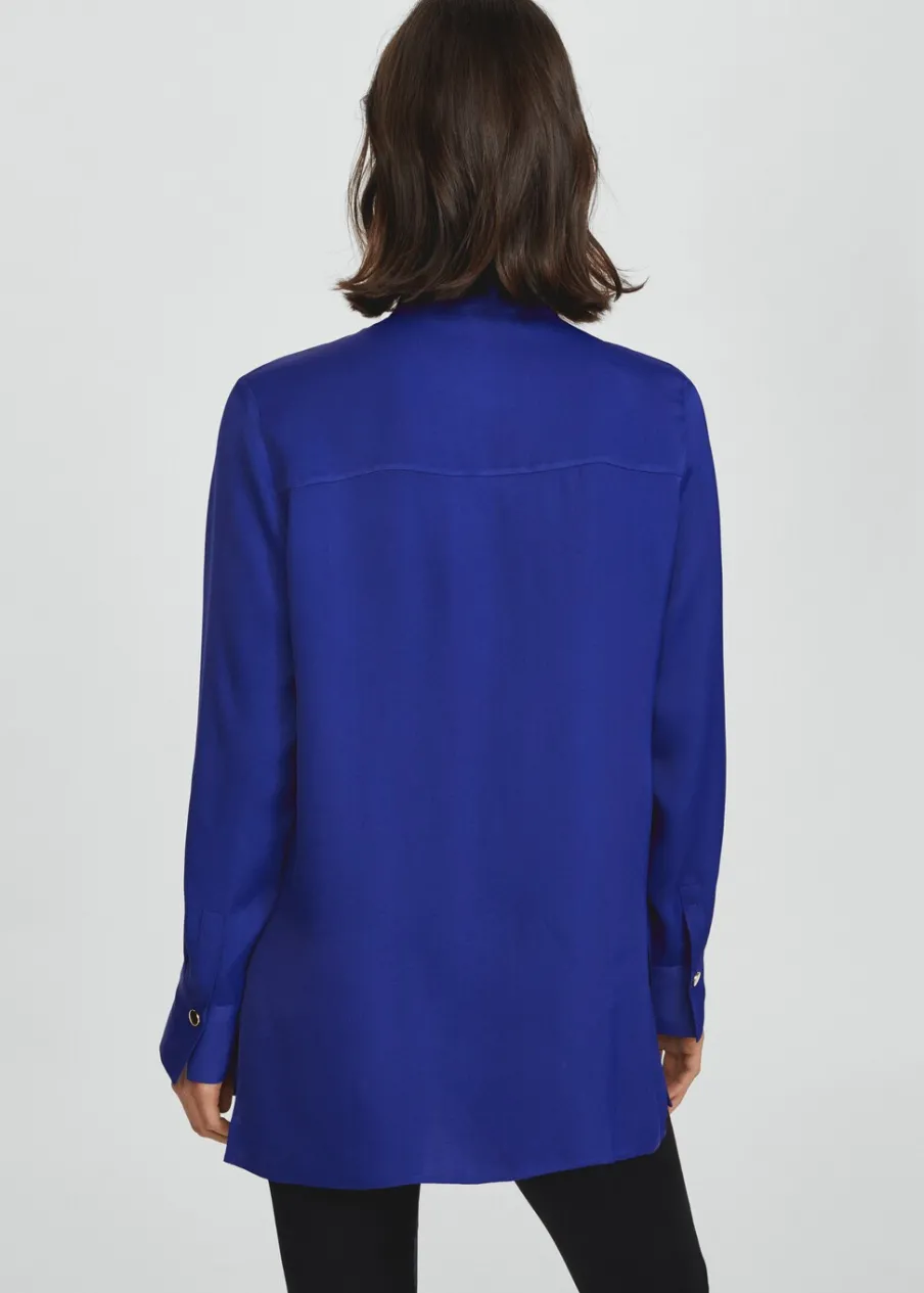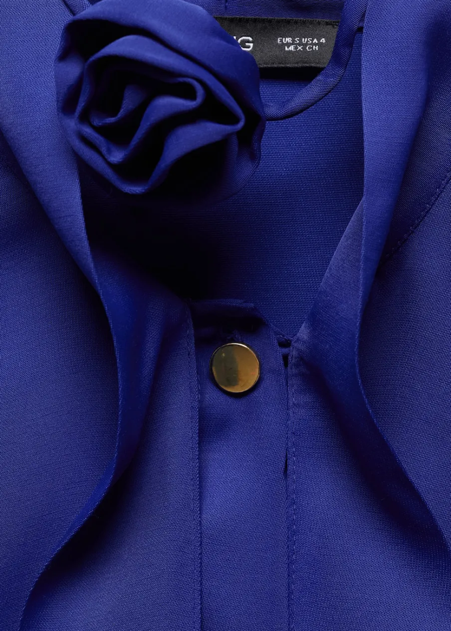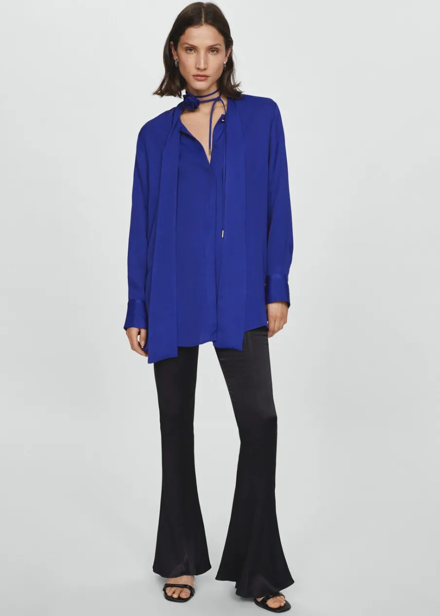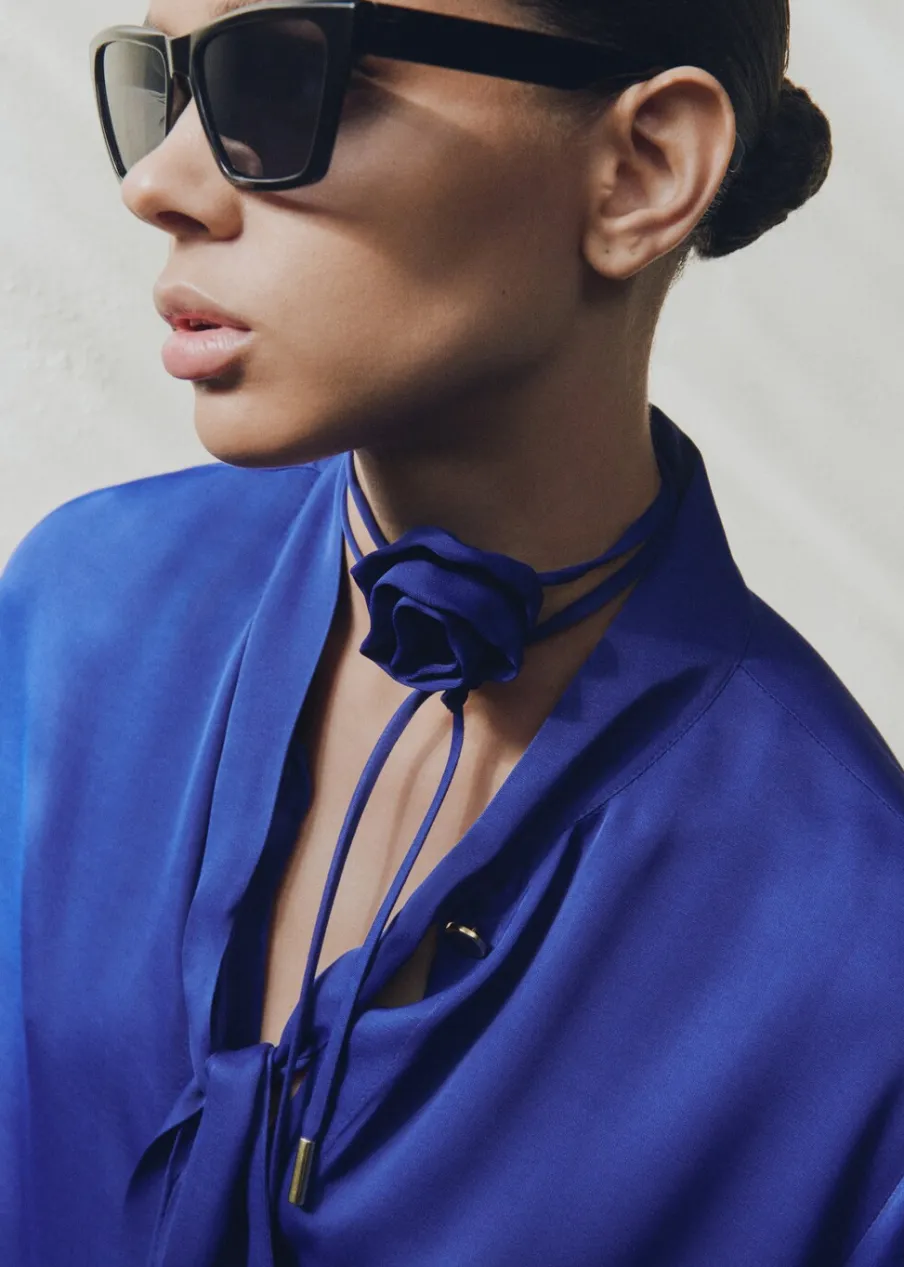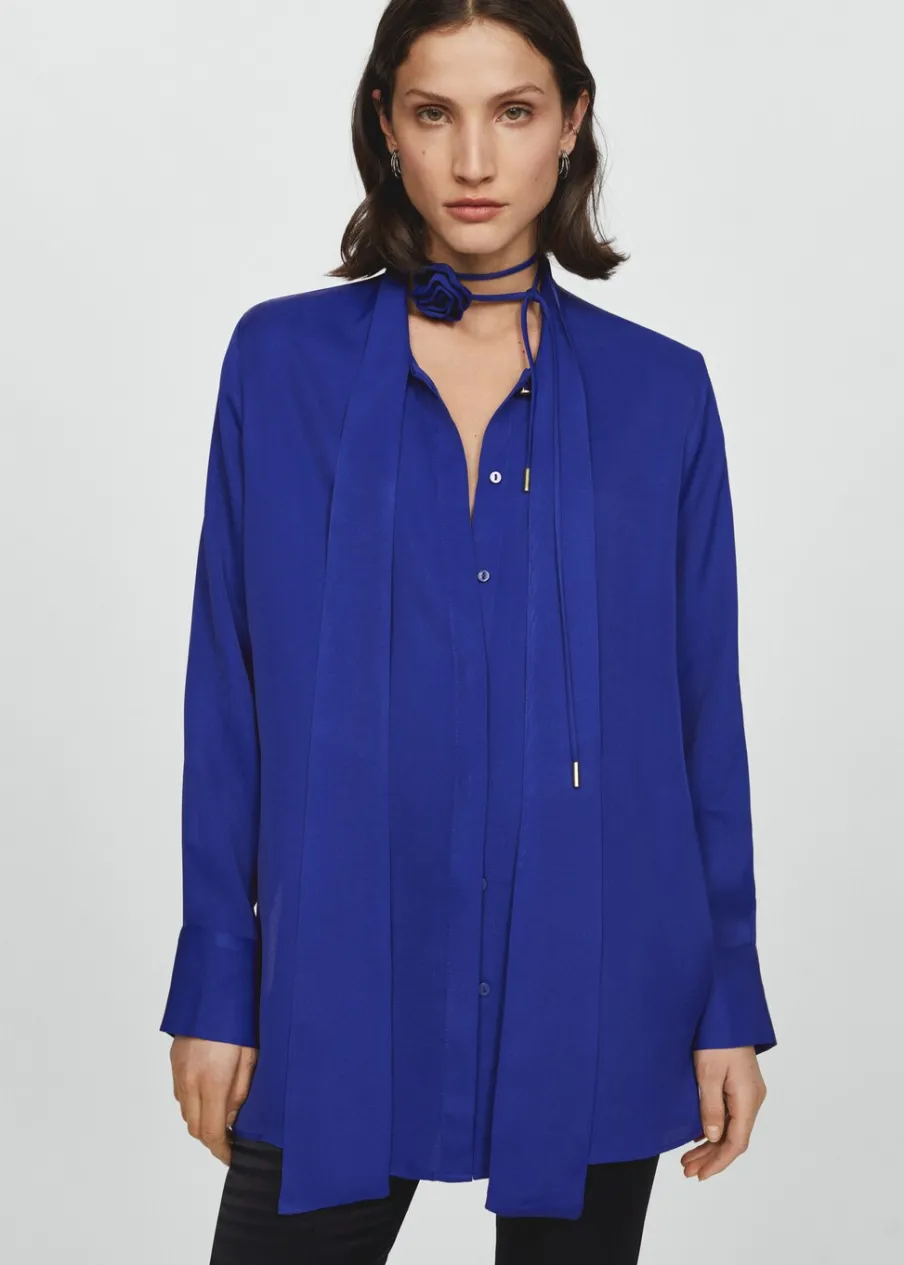 Lejąca tkanina. Satynowa tkanina. Model prosty. Model długi. Koszulowy kołnierz. Długi rękaw z guzikami na mankietach. Wiązanie na szyi. Ozdobny kwiat. Dekolt typu choker. Kolekcja wizytowa. Zapięcie na guziki z przodu.