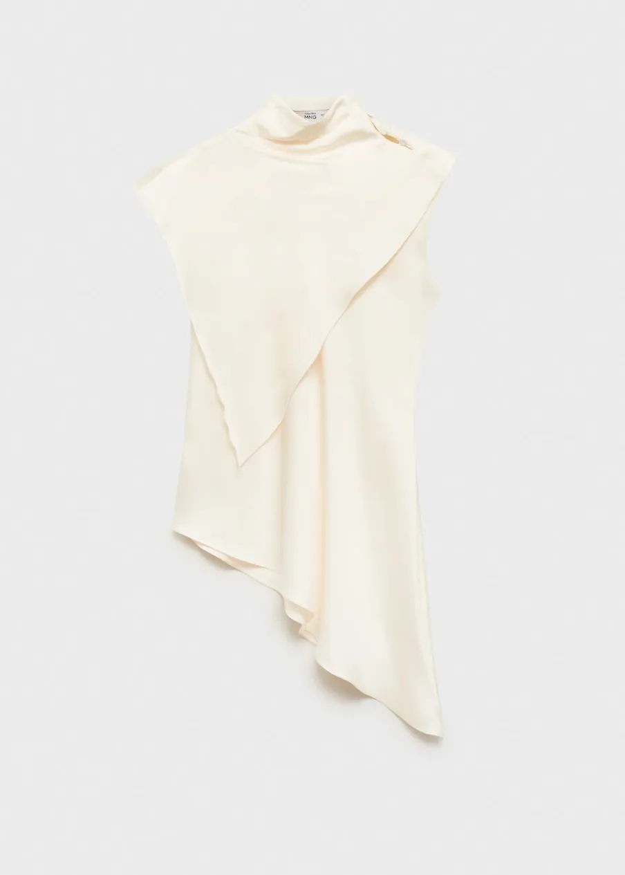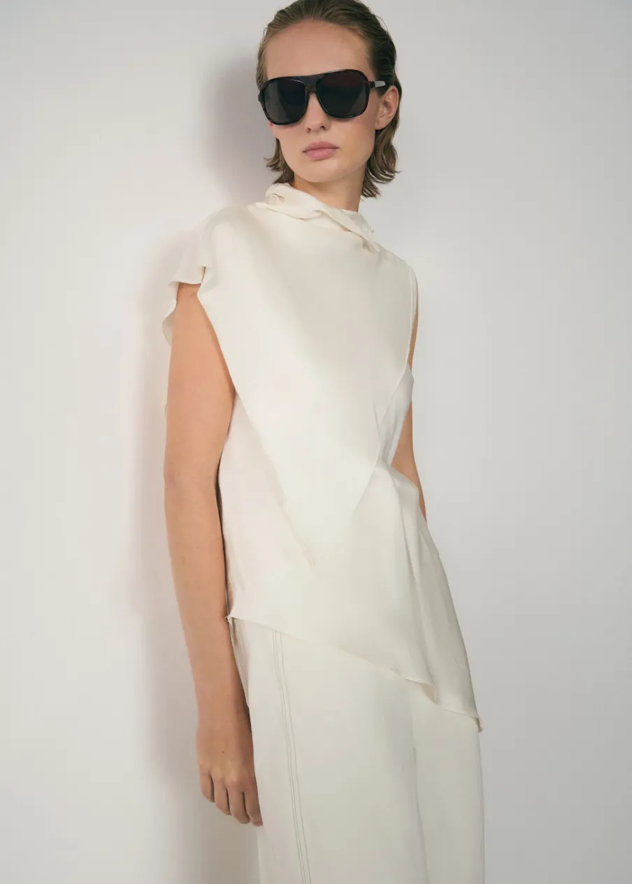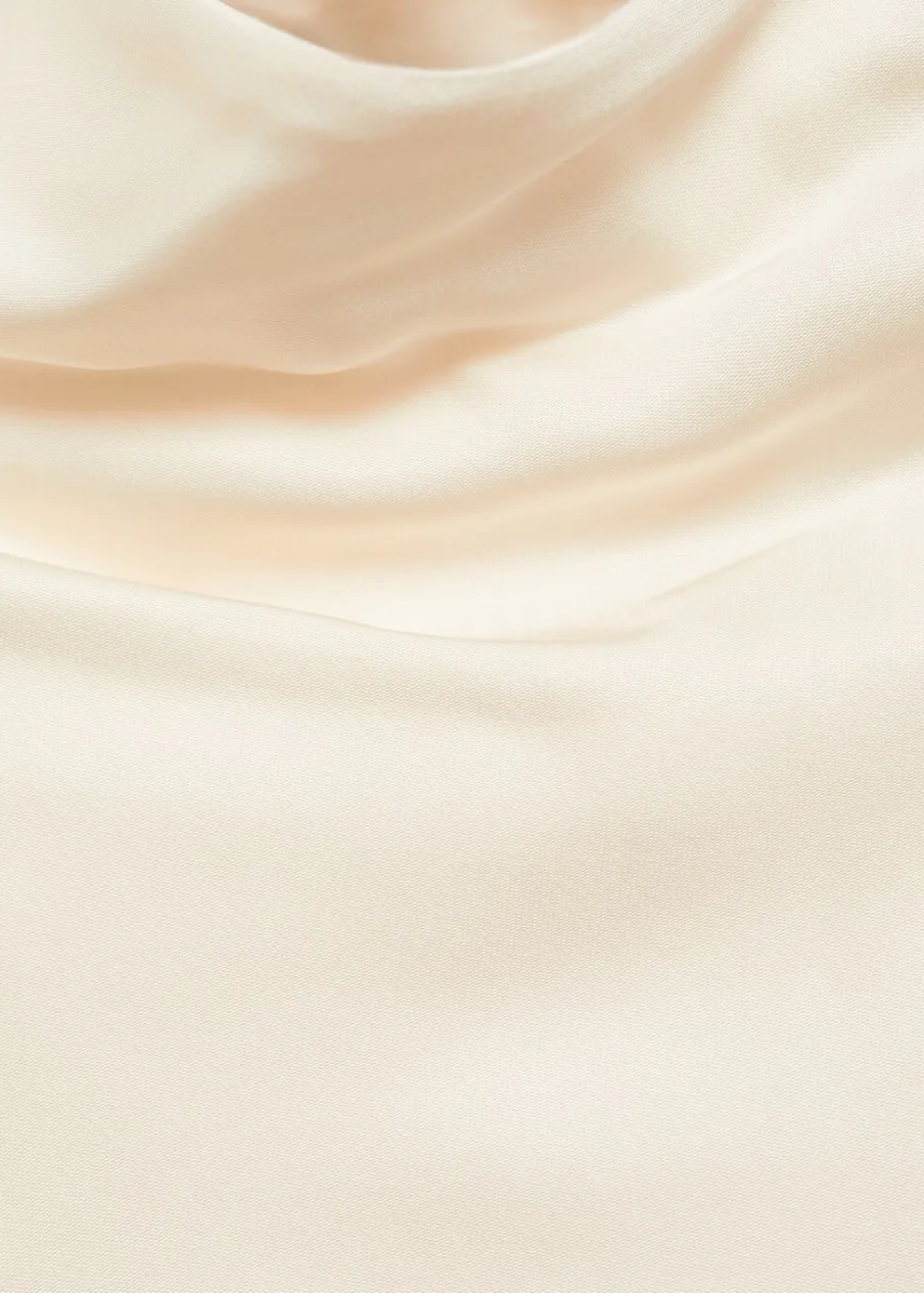 OpisSatynowa tkanina. Lejąca tkanina. Asymetryczny krój. Model prosty. Model długi. Golf. Bez rękawów. Zapięcie na…