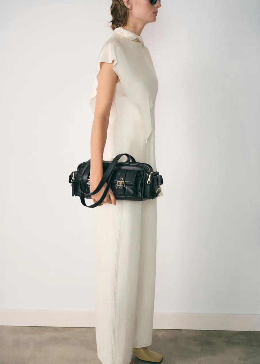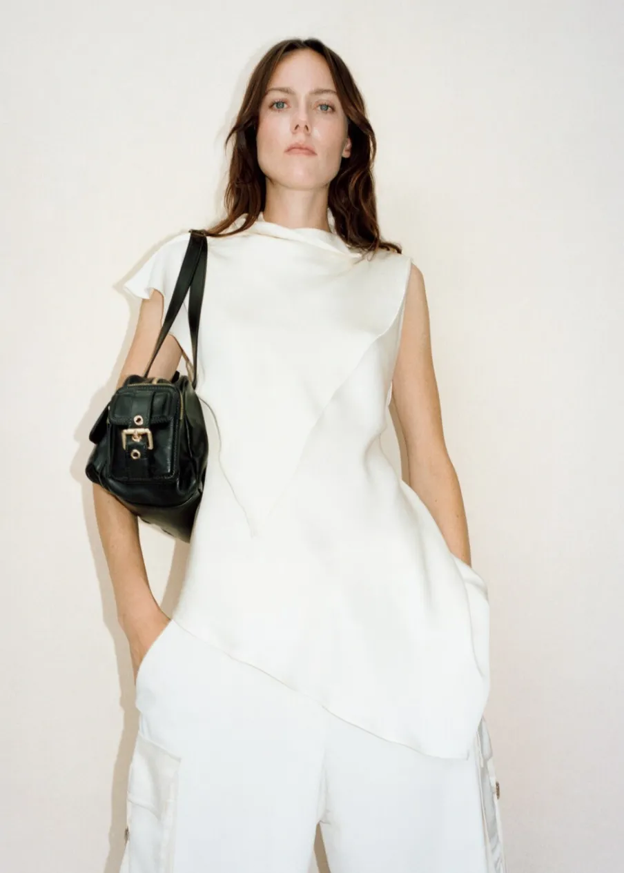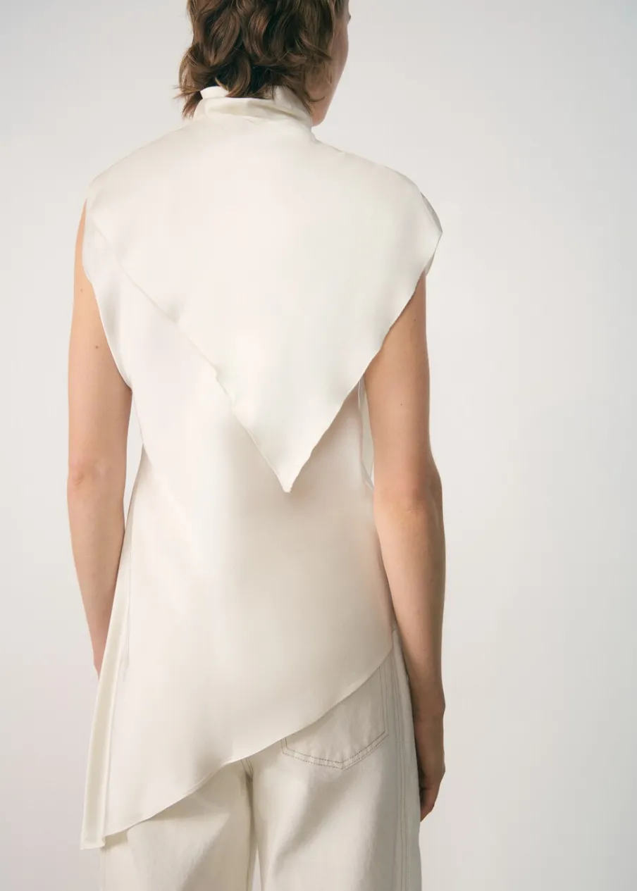 OpisSatynowa tkanina. Lejąca tkanina. Asymetryczny krój. Model prosty. Model długi. Golf. Bez rękawów. Zapięcie na…