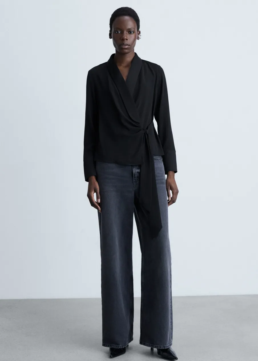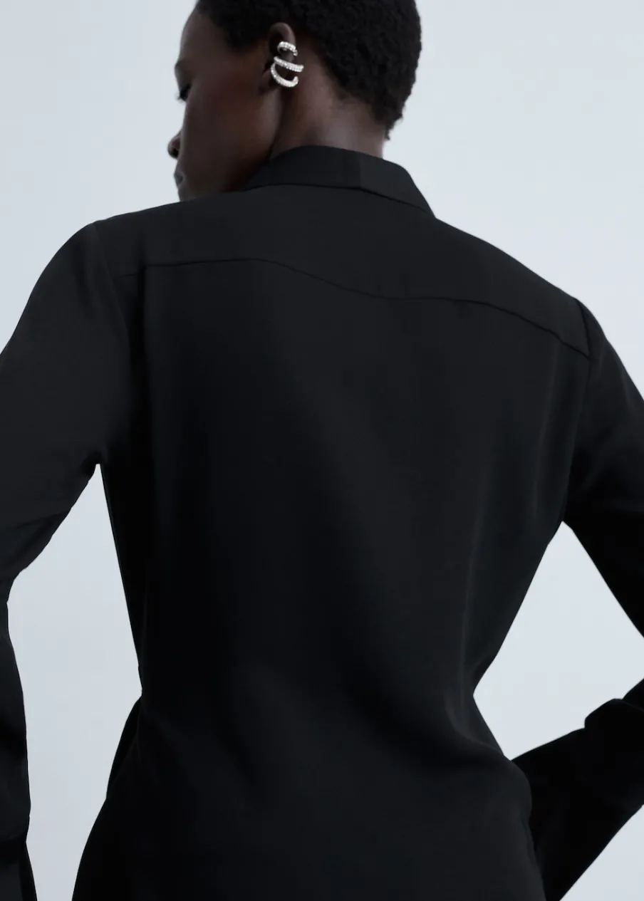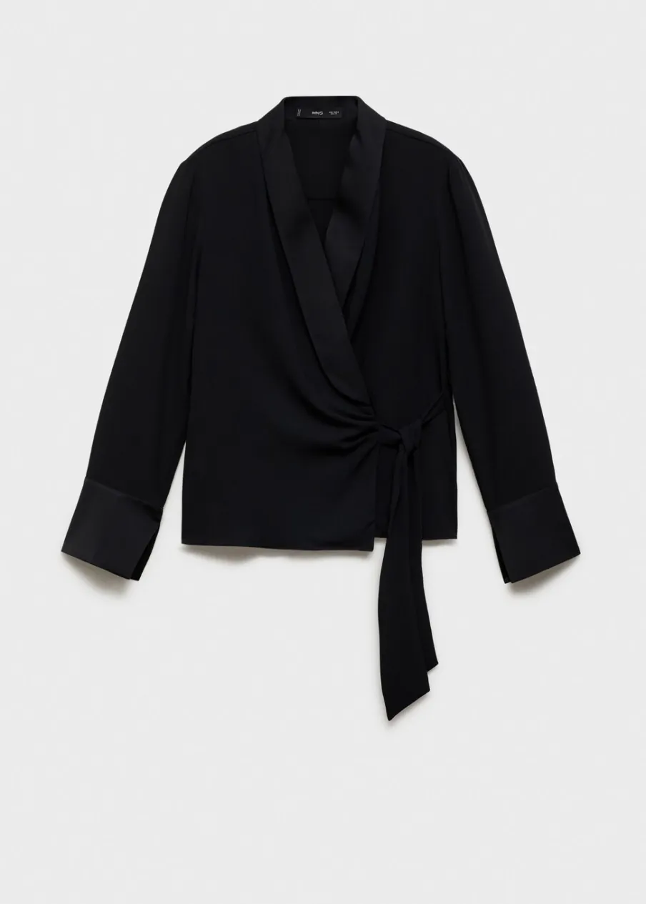 Satynowa tkanina. Model prosty. Model zakładany. Zakładany kołnierz. Dekolt w szpic z kołnierzykiem. Długi rękaw. Wiązanie z boku. Modelka ma 181 cm wzrostu i nosi rozmiar S/36.